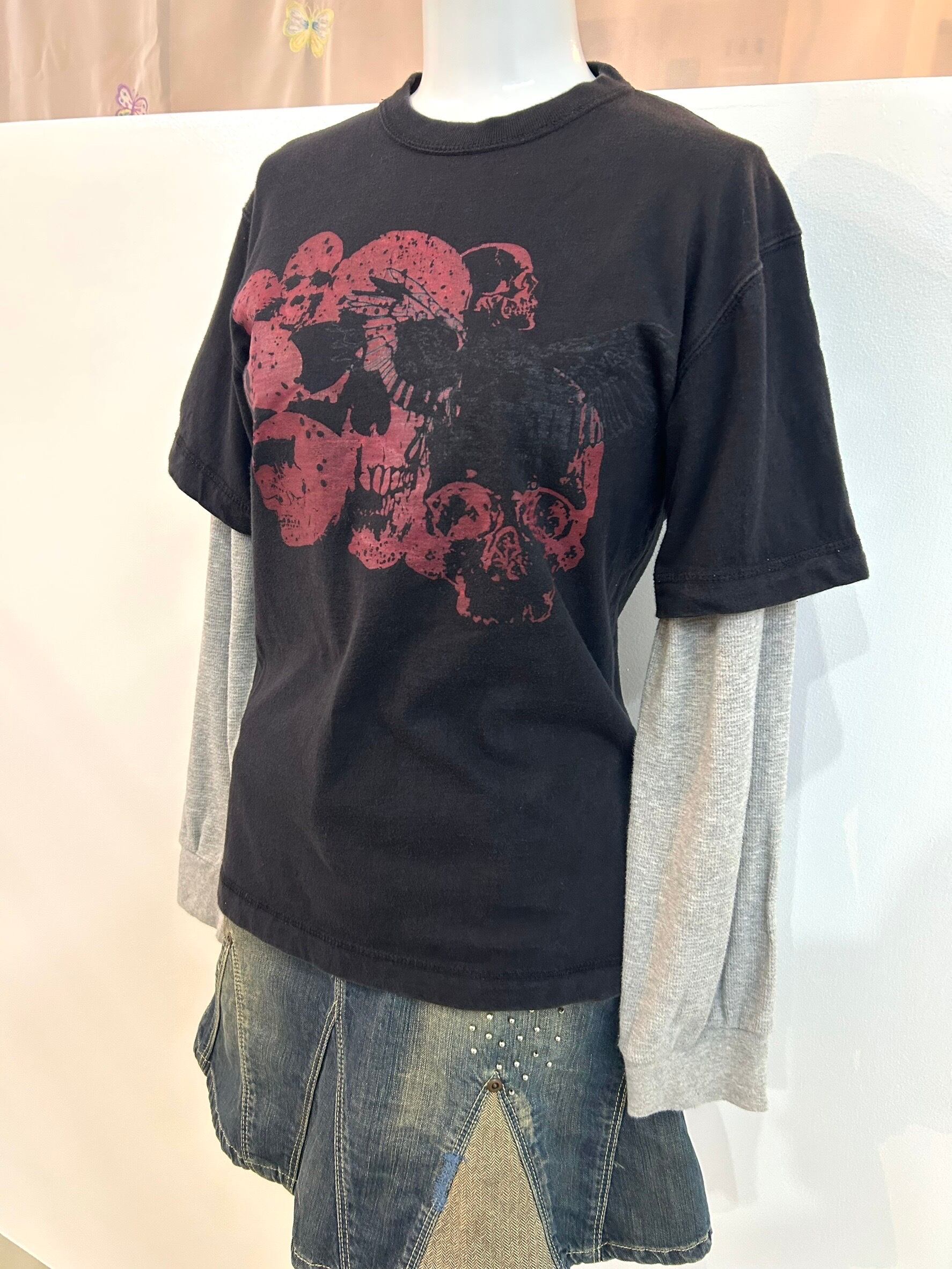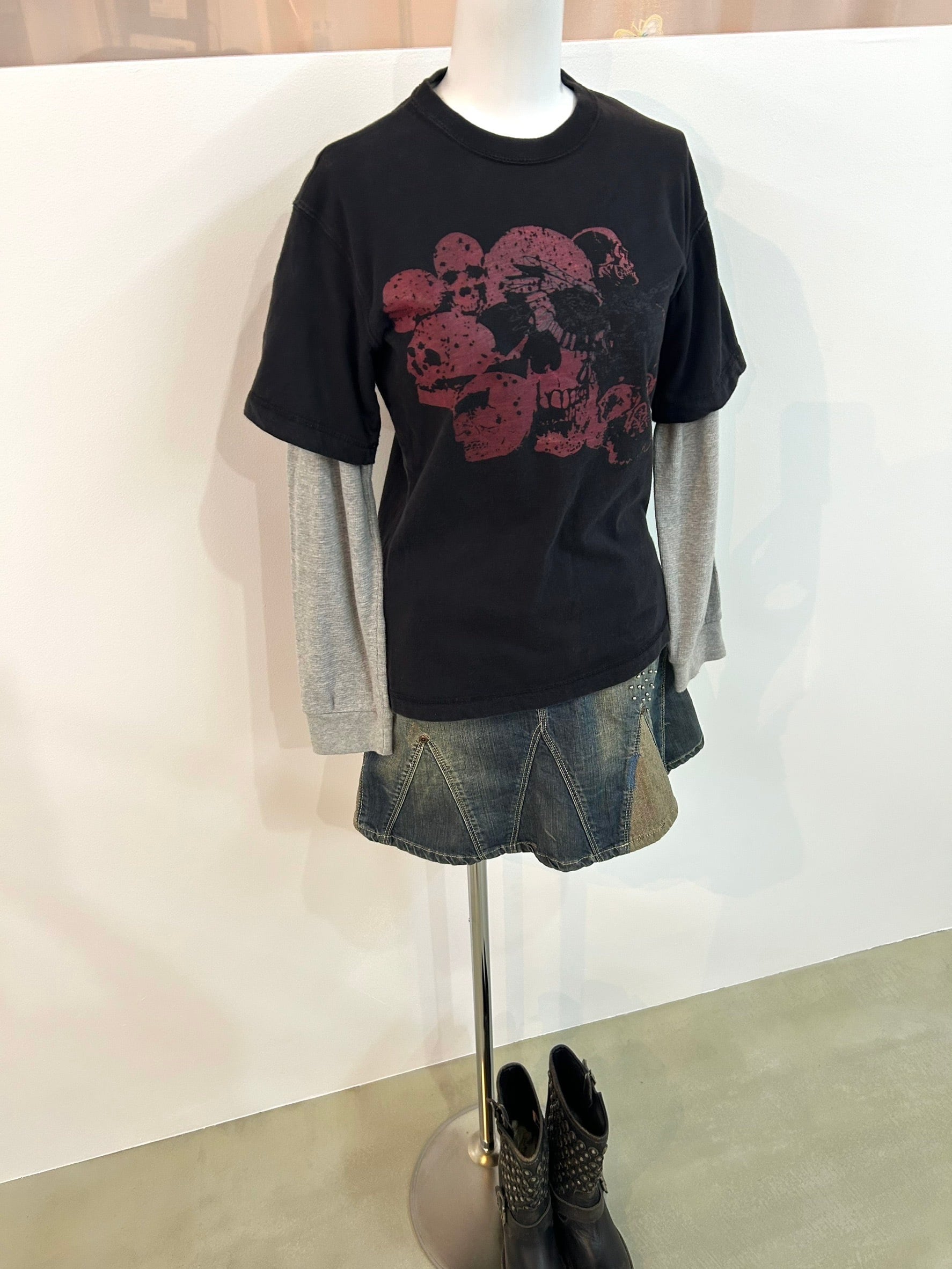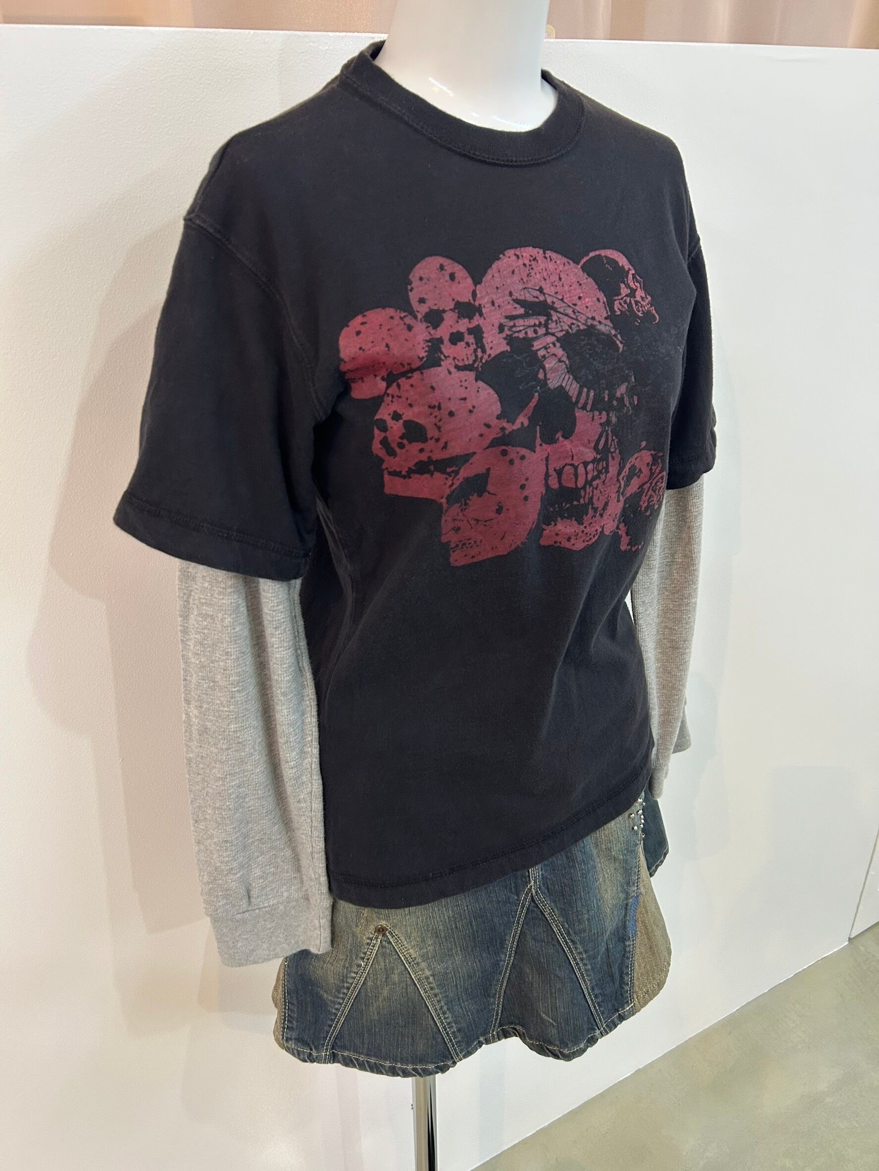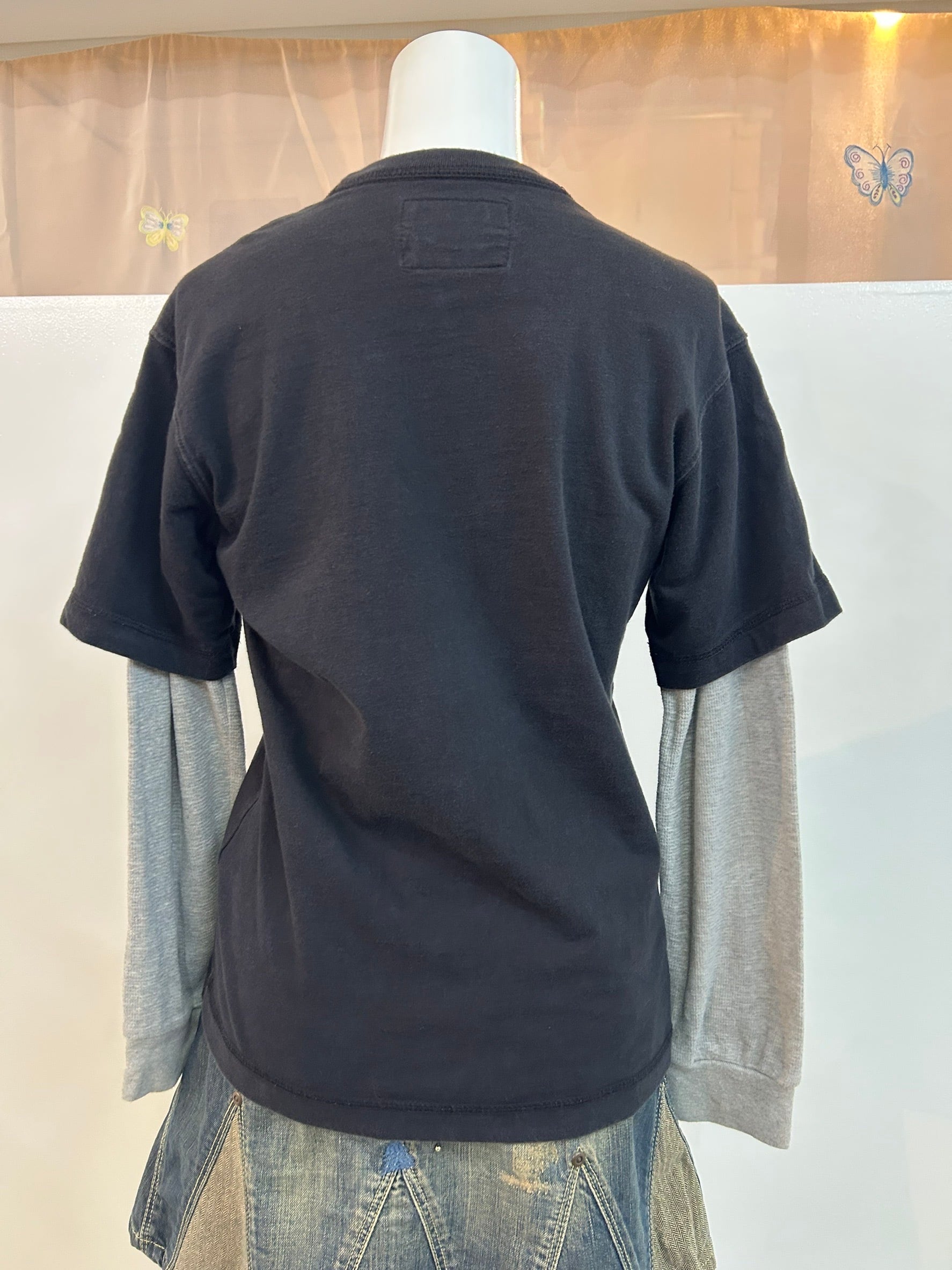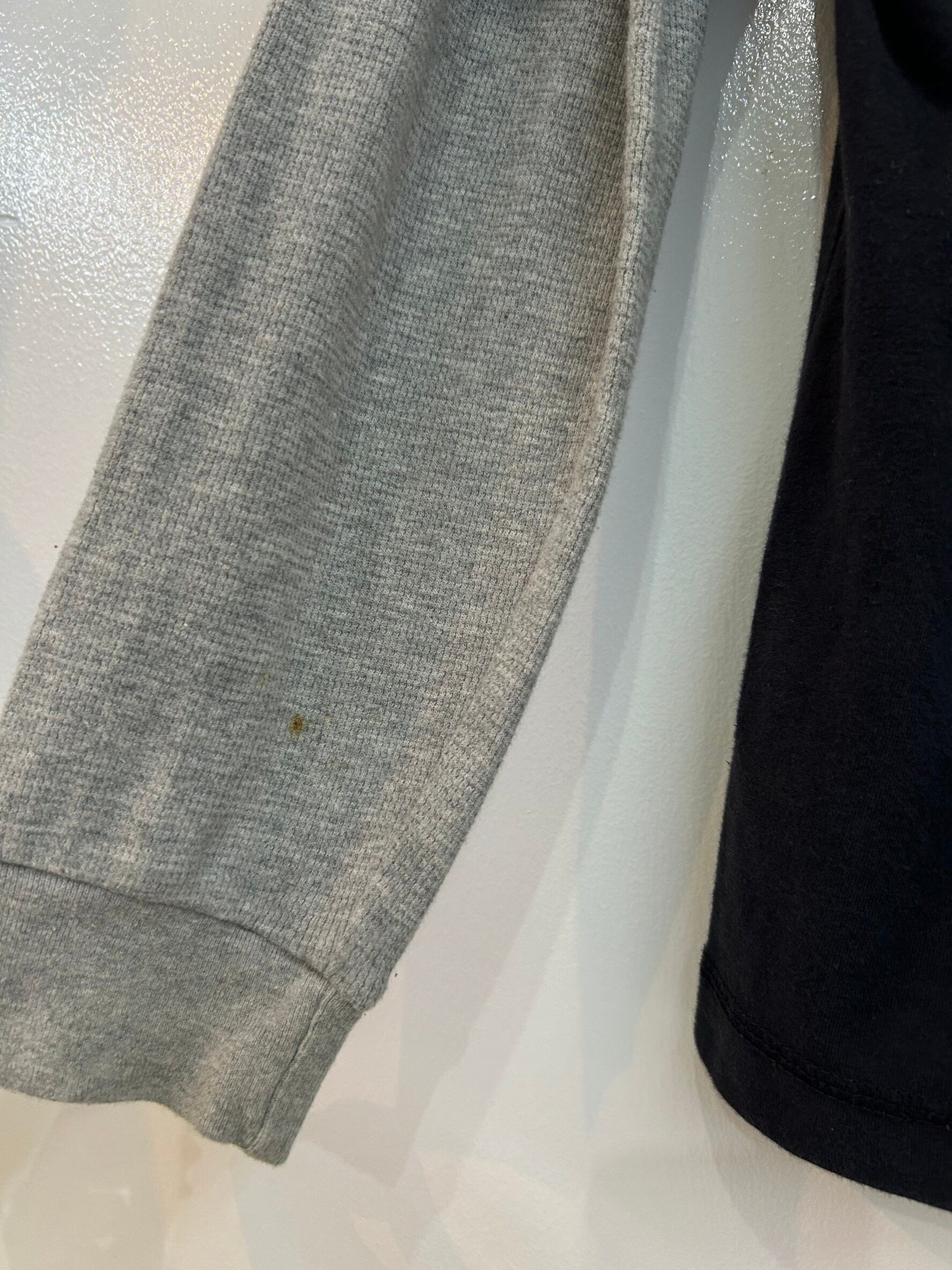 素材: 100%Cotton サイズ: M(表記) 着丈60cm 肩幅40.5cm 身幅42cm 袖丈52cm ダメージ: 写真13〜15枚目のような色落ち、16枚目の汚れがあります