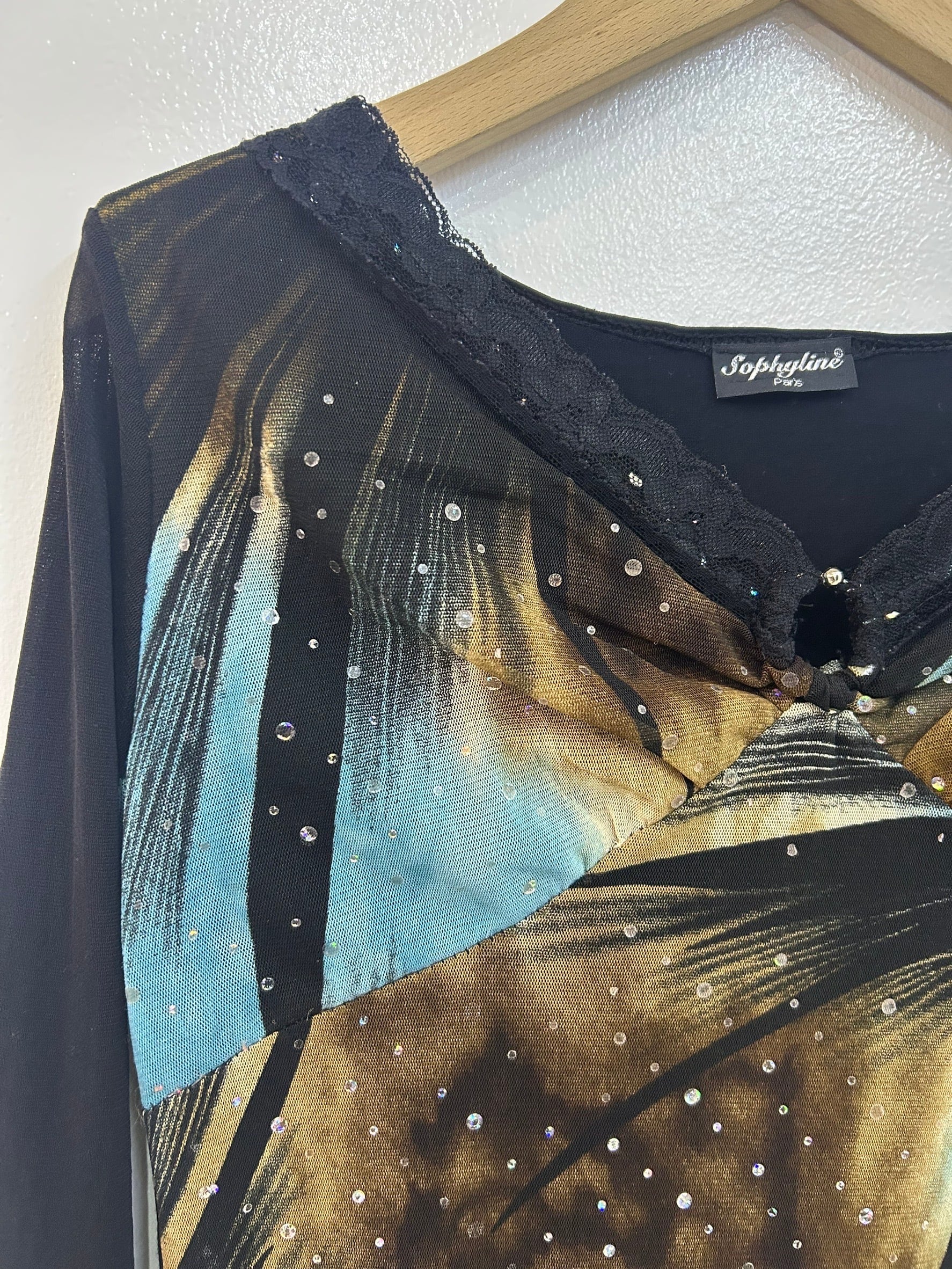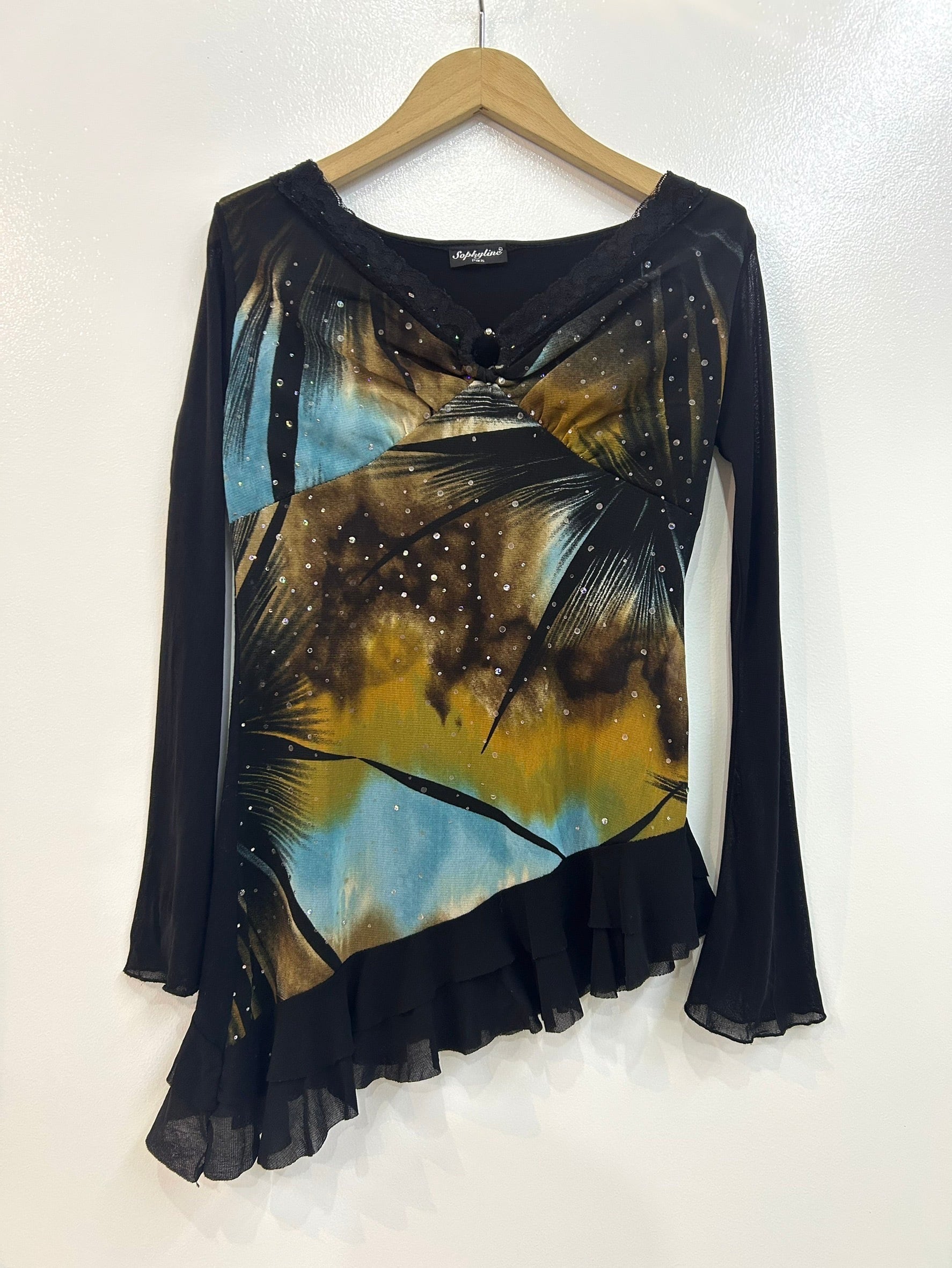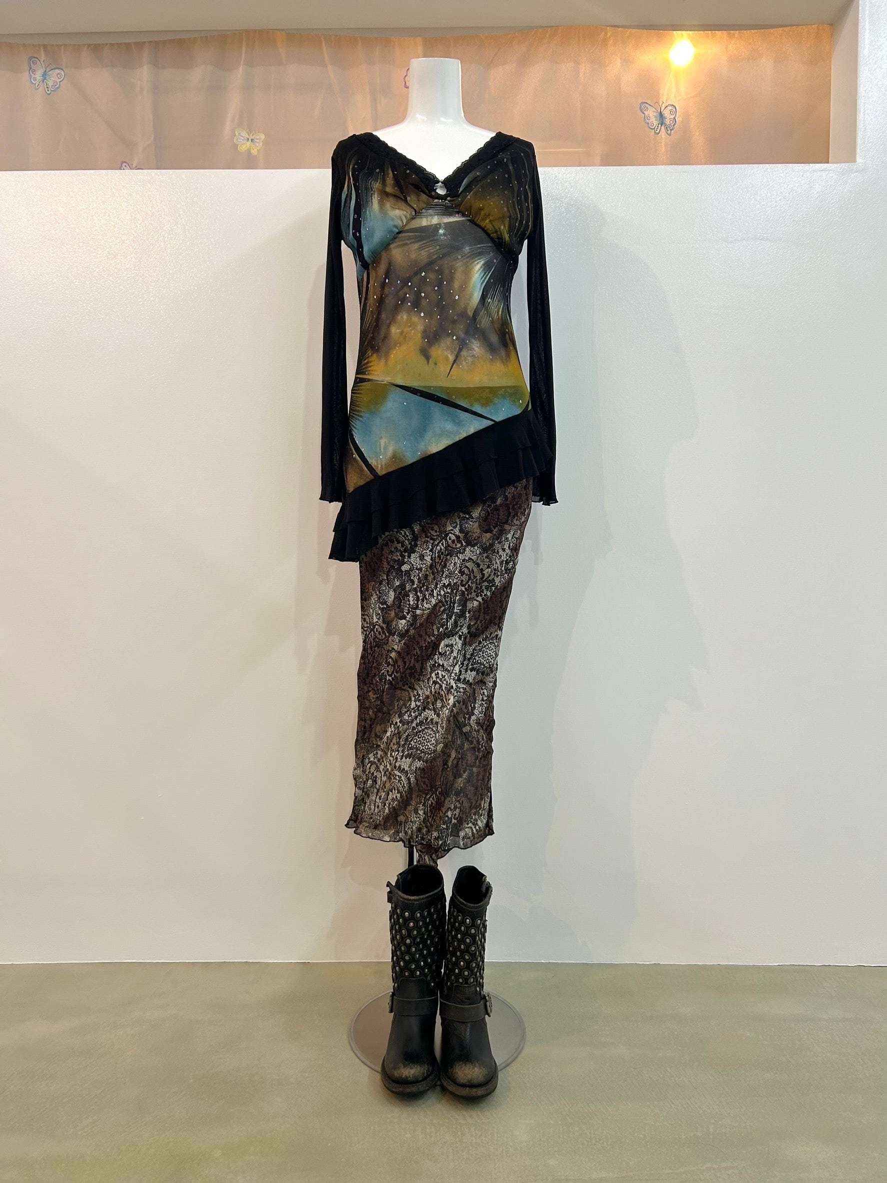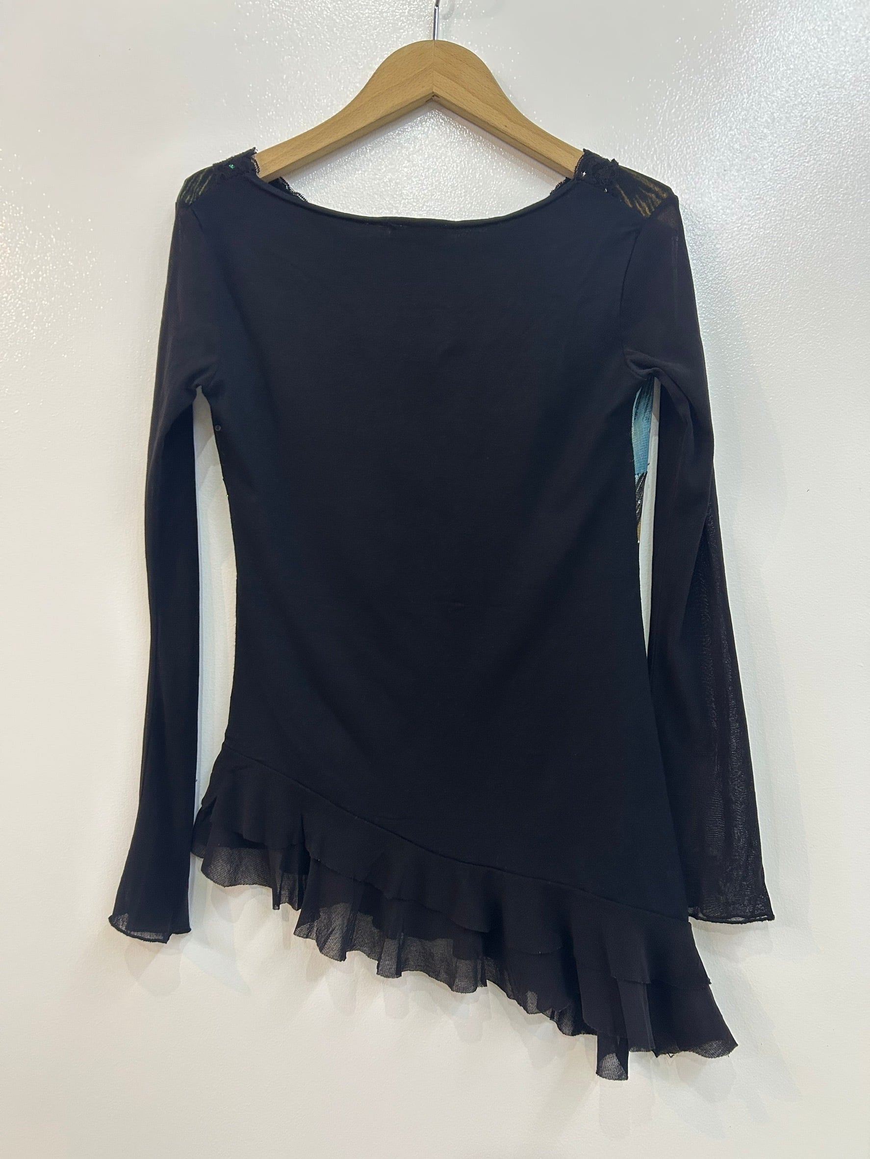 素材: Viscose/Polyester/Elastan サイズ: 着丈57cm 肩幅35.5cm 身幅35cm 袖丈55cm ダメージ: 写真15〜18枚目のようにストーンの取れている箇所が複数あります。19.20枚目のように背中の布の毛羽立ちのダメージがあります。