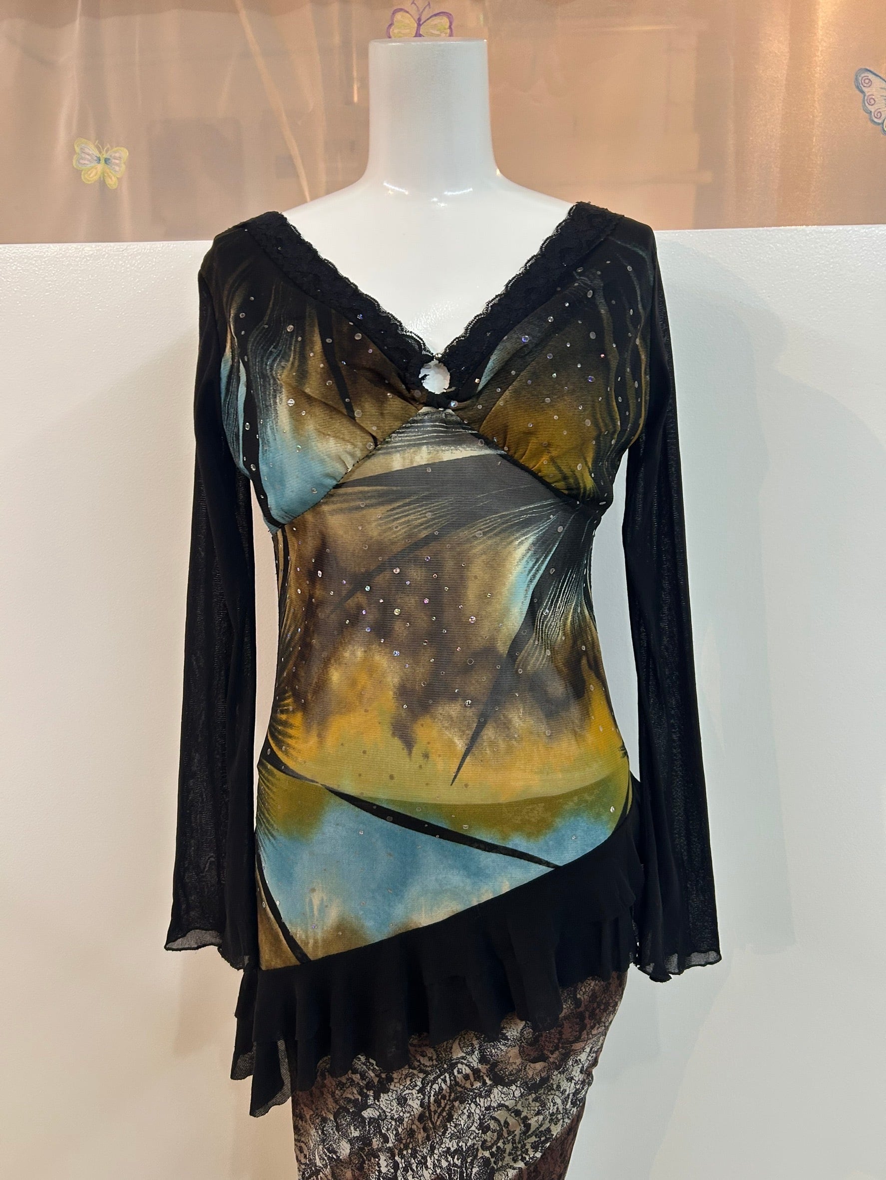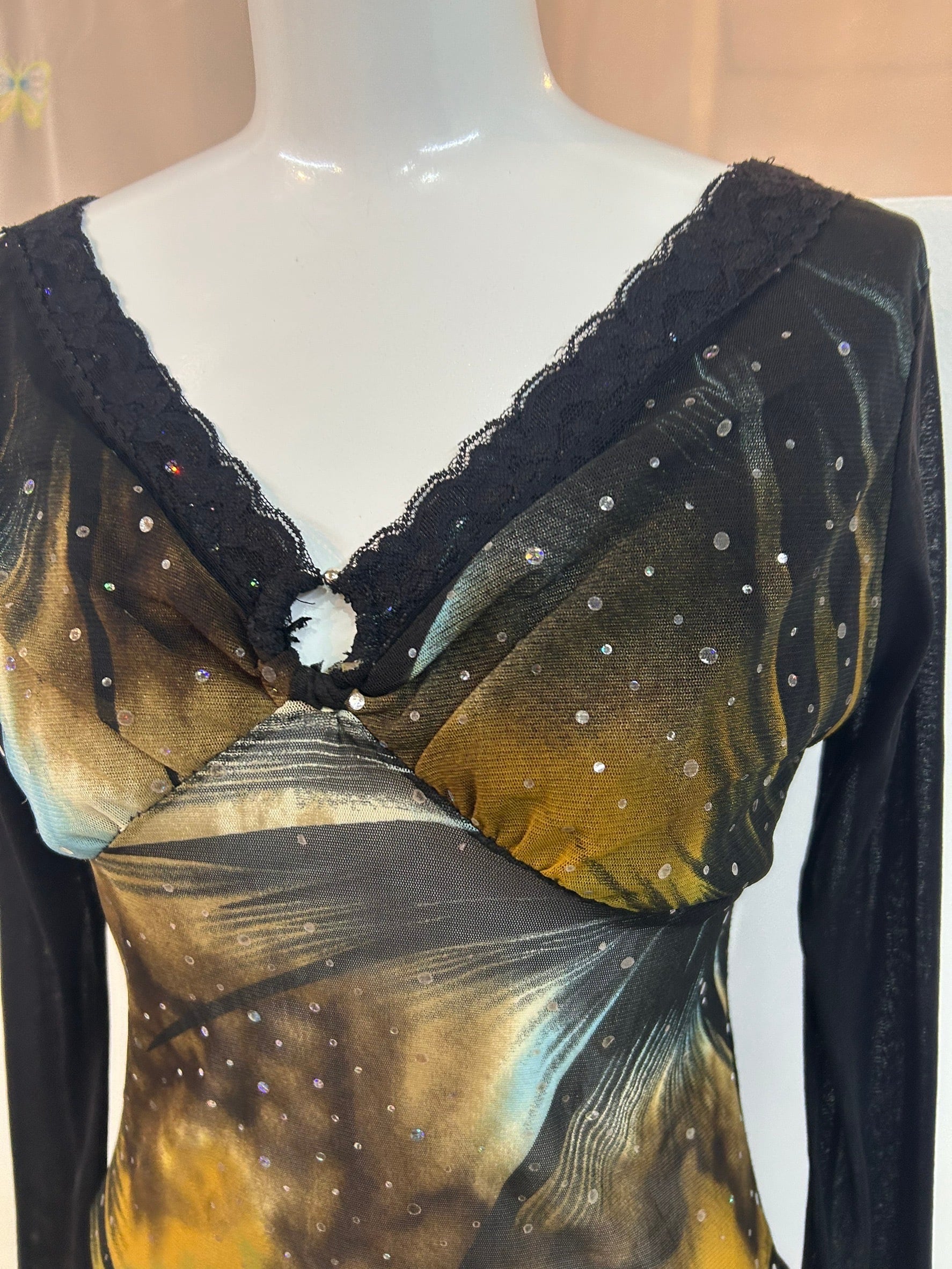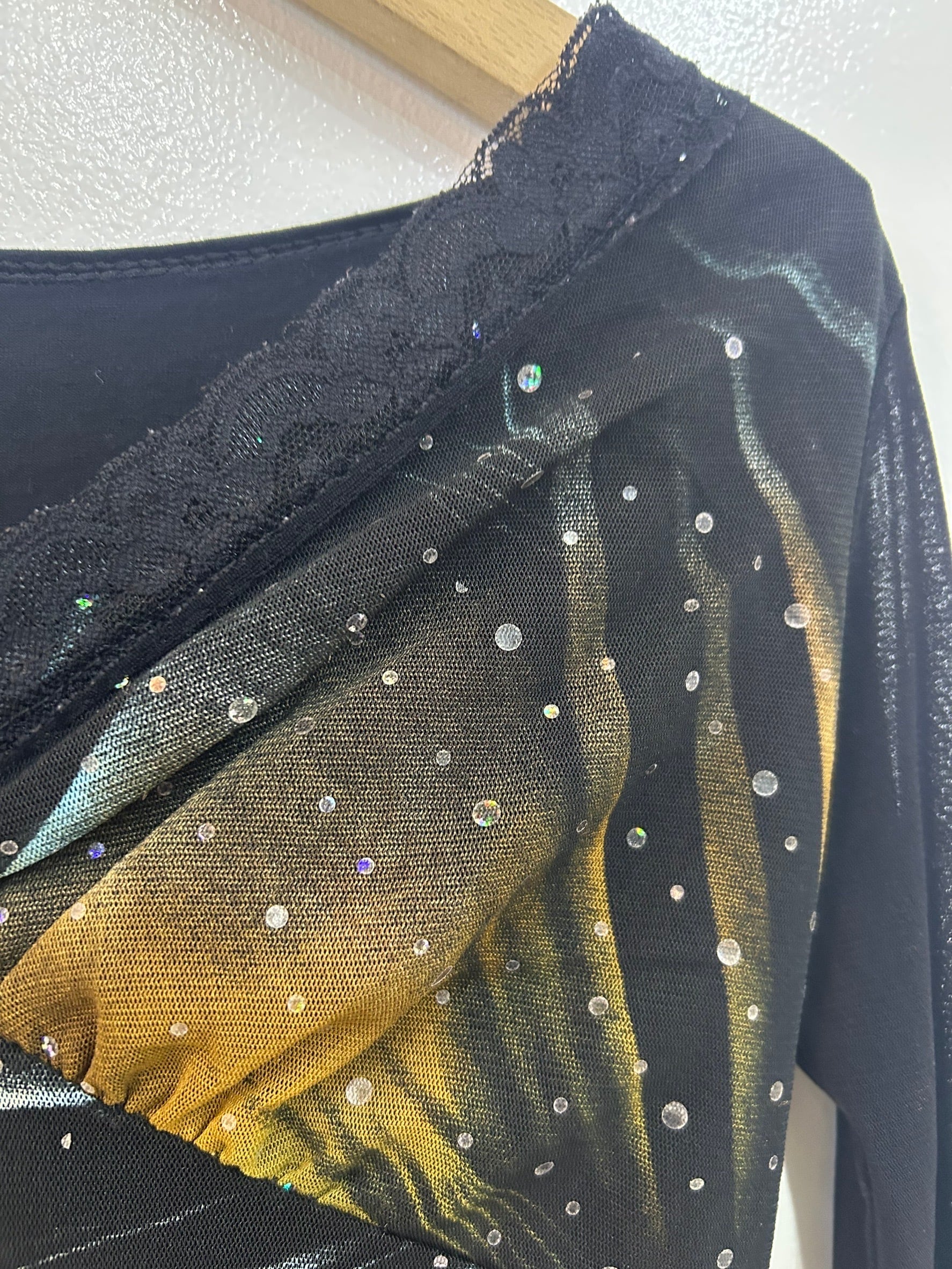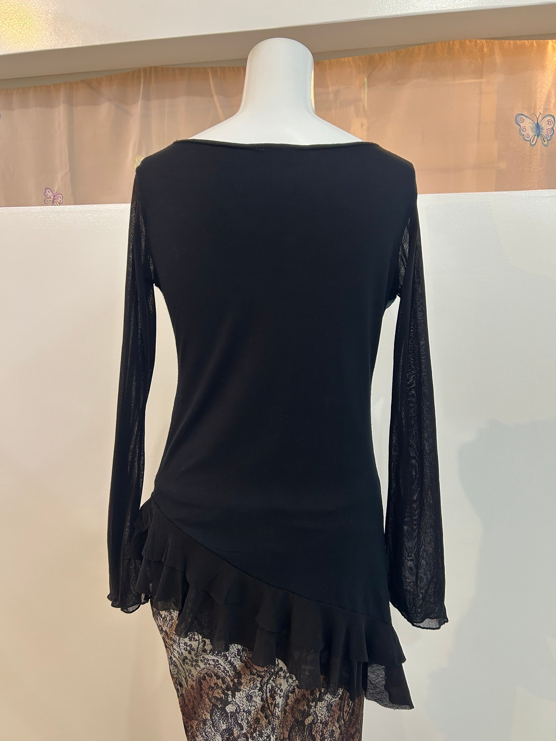 素材: Viscose/Polyester/Elastan サイズ: 着丈57cm 肩幅35.5cm 身幅35cm 袖丈55cm ダメージ: 写真15〜18枚目のようにストーンの取れている箇所が複数あります。19.20枚目のように背中の布の毛羽立ちのダメージがあります。