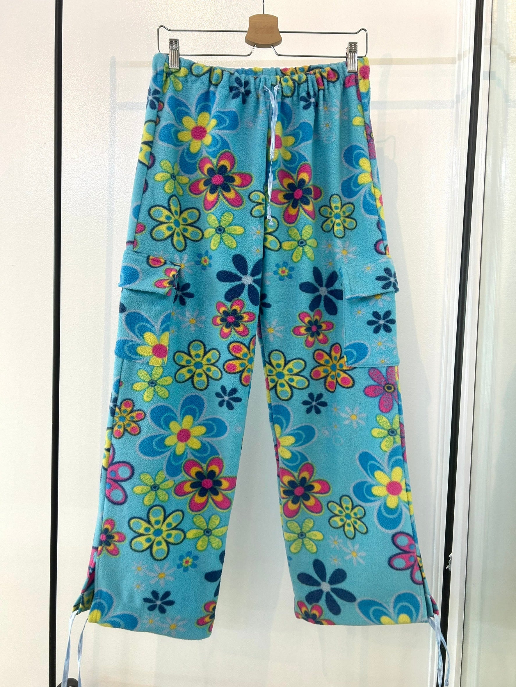 素材: Polyester/Cotton(表記なし) サイズ: ウエスト幅最大40cm(紐で調節可能) ヒップ幅54cm 股上25cm 股下77cm わたり幅34cm 裾幅29cm