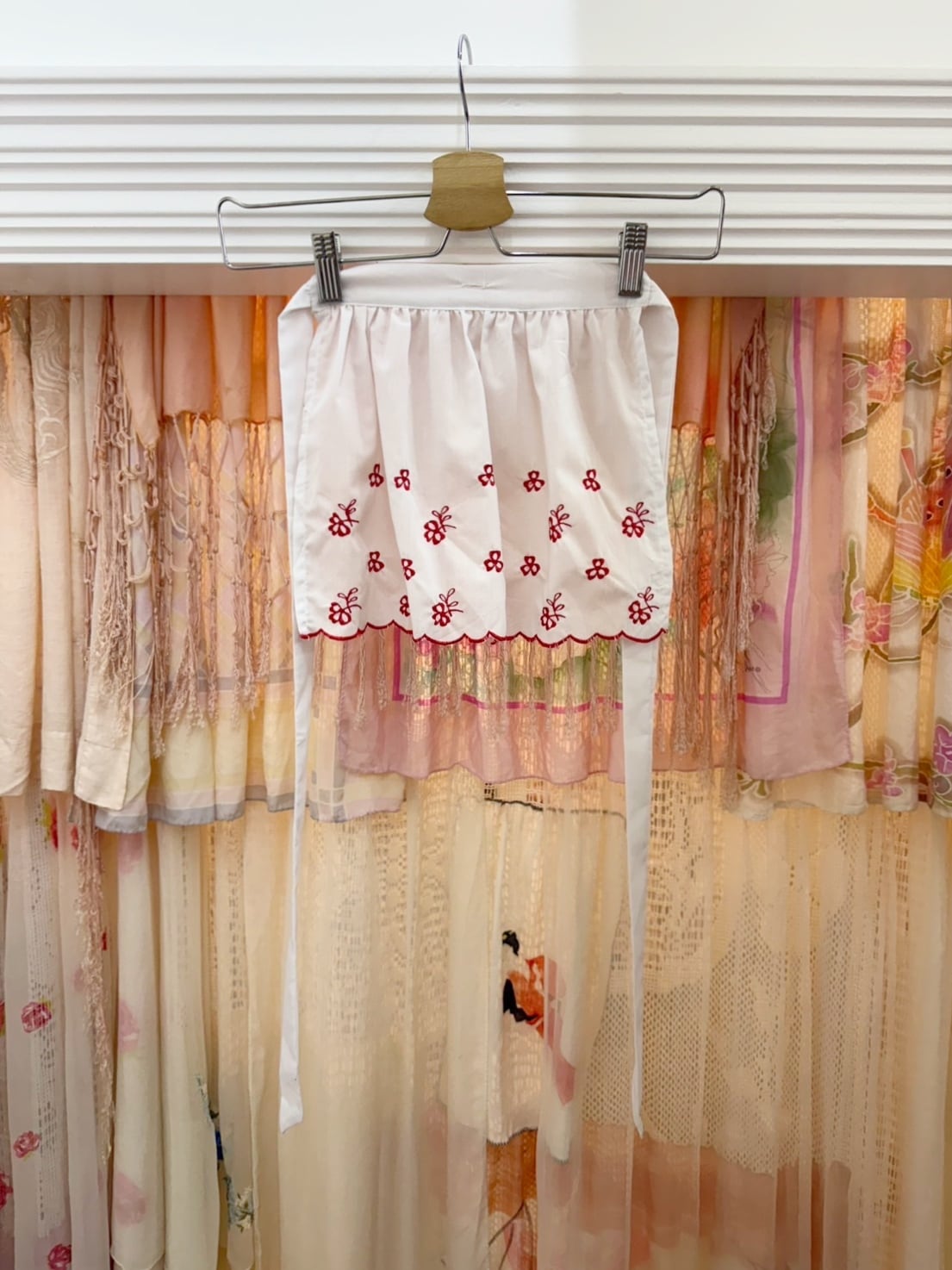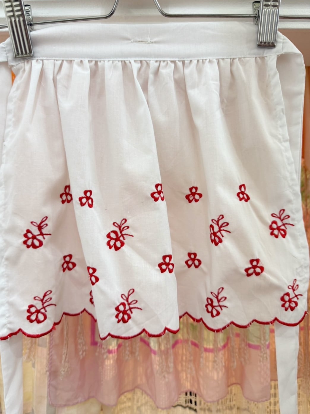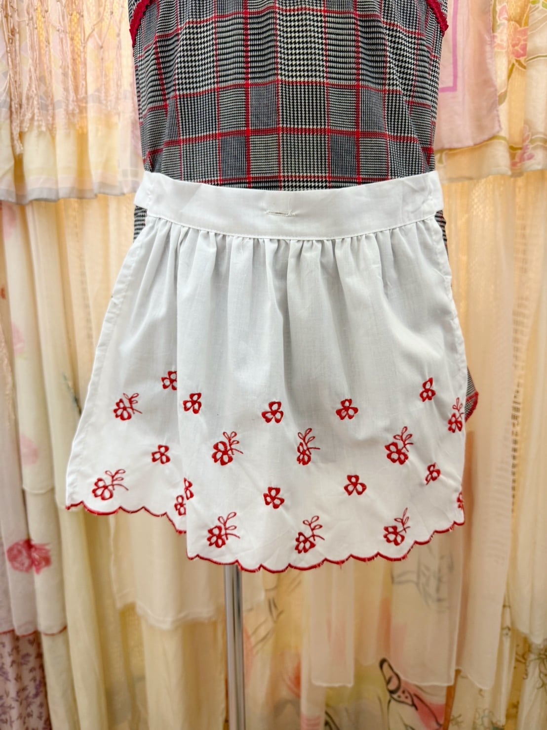 素材: Polyester(表記なし) サイズ: リボン全長130cm エプロン部分横24cm 縦24cm ダメージ: 写真11枚目のような小さな汚れがあります。