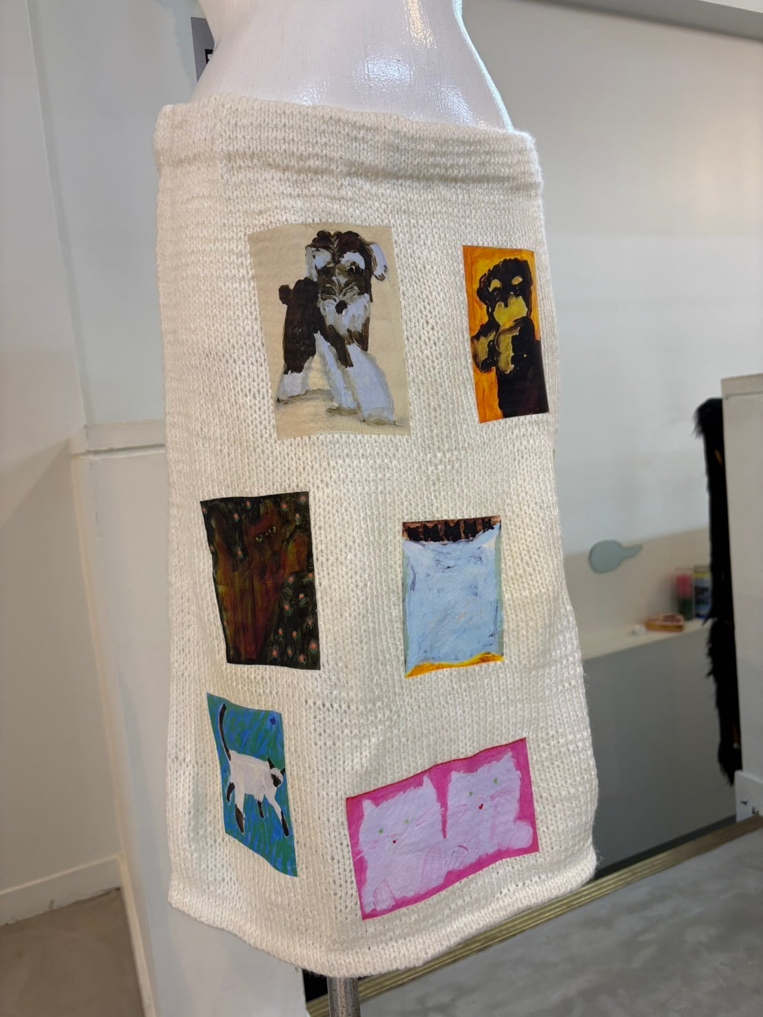 素材: Acrylic(表示なし) サイズ: ウエスト幅(ゴム)37〜51cm丈57cm スリット17cm 安藤智展「FANCY♡」に合わせて制作したシリーズ。安藤智の油彩作品とitimiのコラボです。