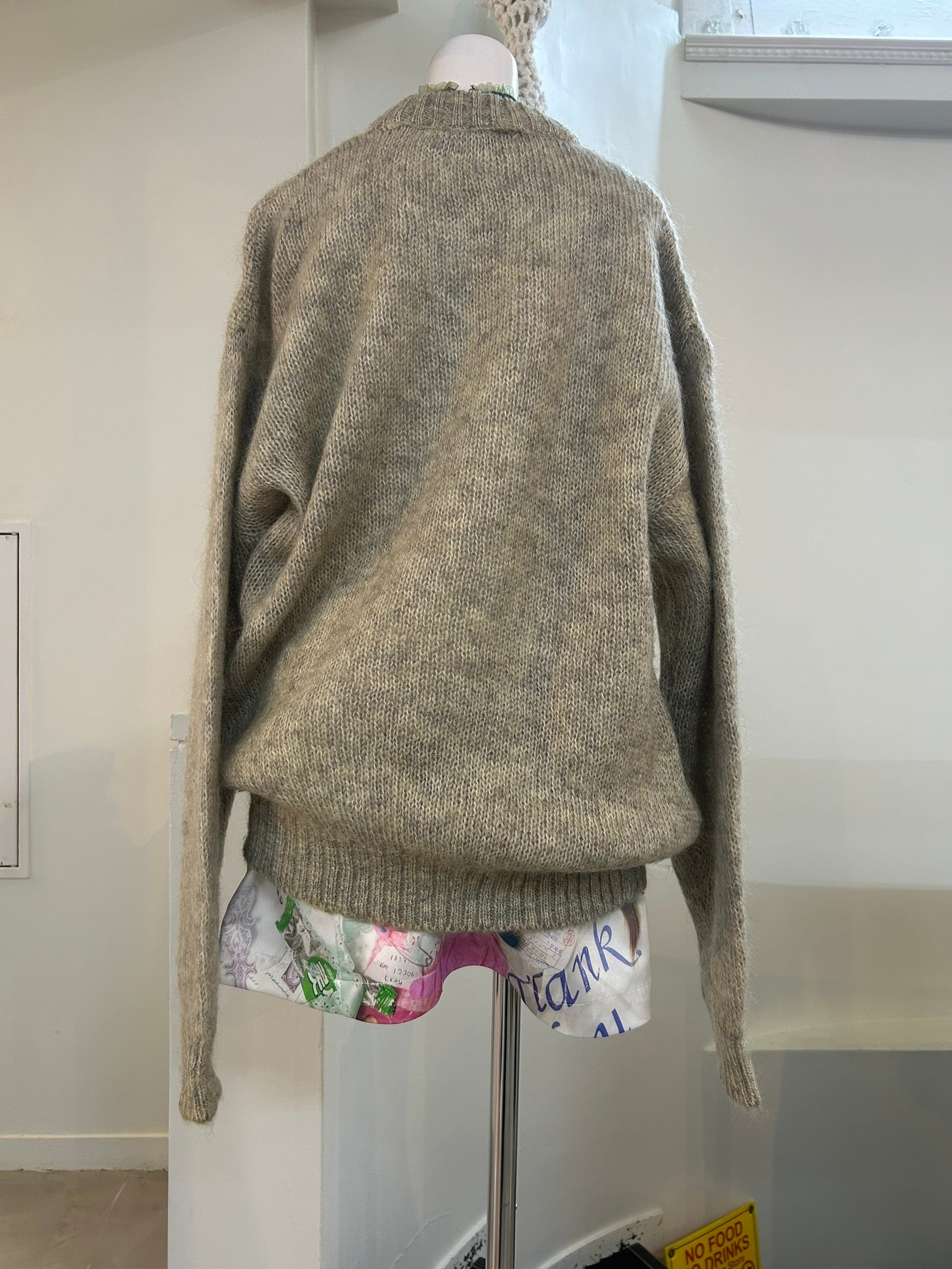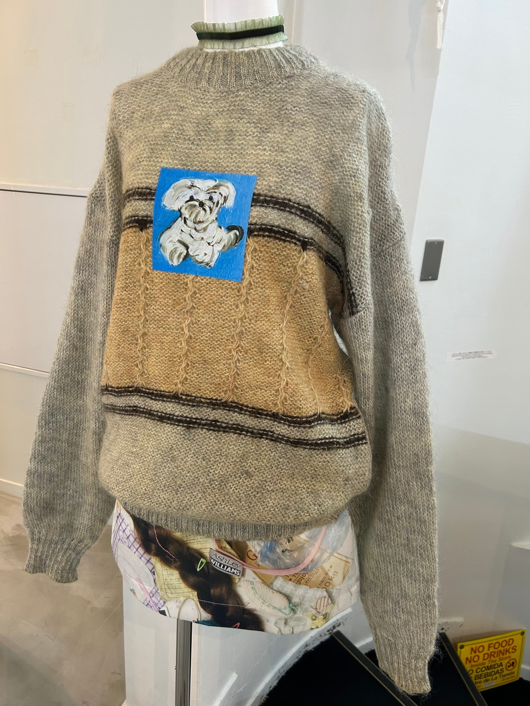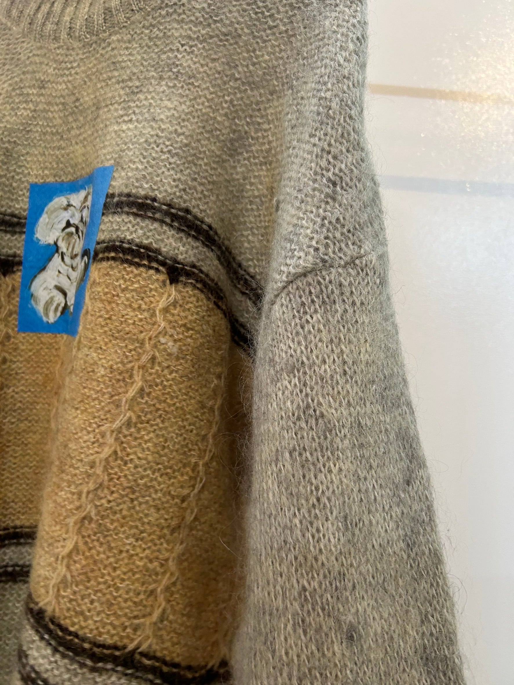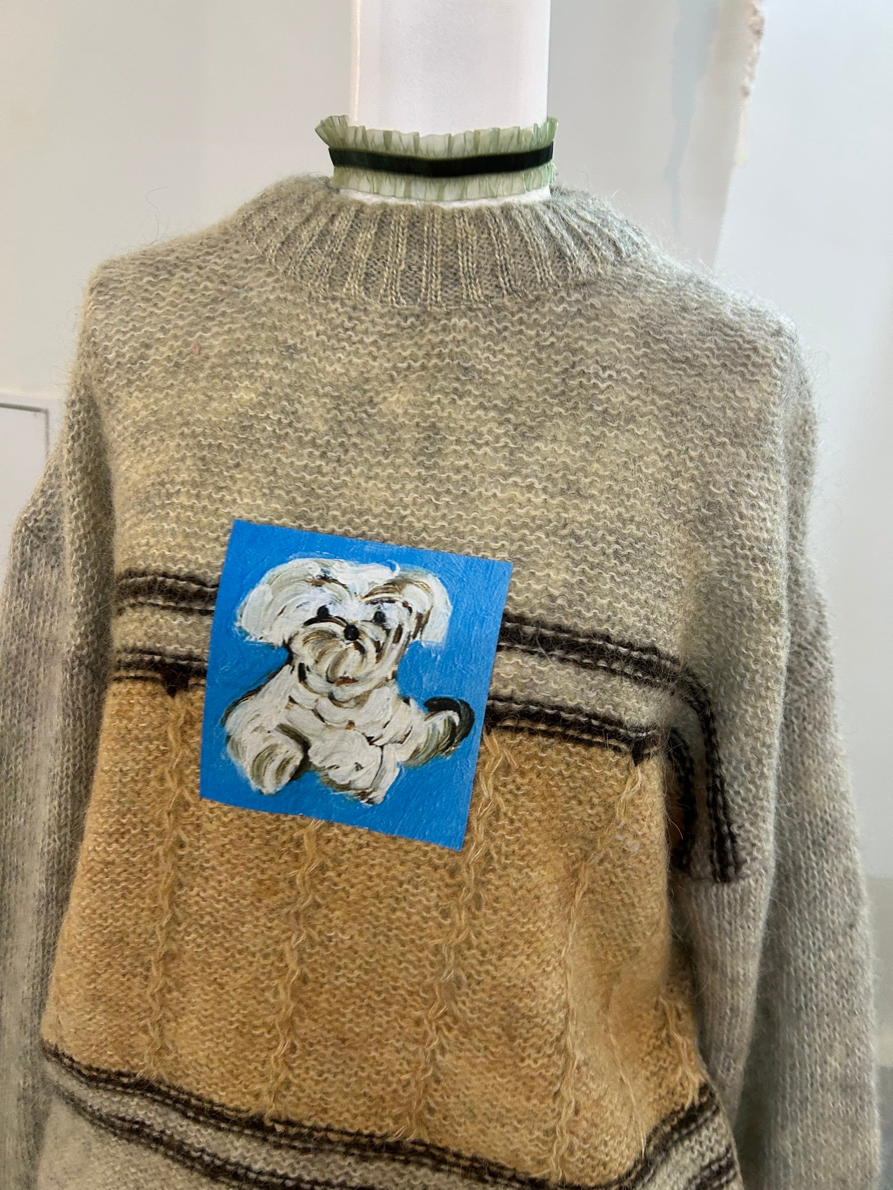 素材: Acrylic(表記なし) サイズ: 着丈70cm 肩幅61cm 身幅60cm 袖丈65cm 安藤智展「FANCY♡」に合わせて制作したシリーズ。安藤智の油彩作品とitimiのコラボです。