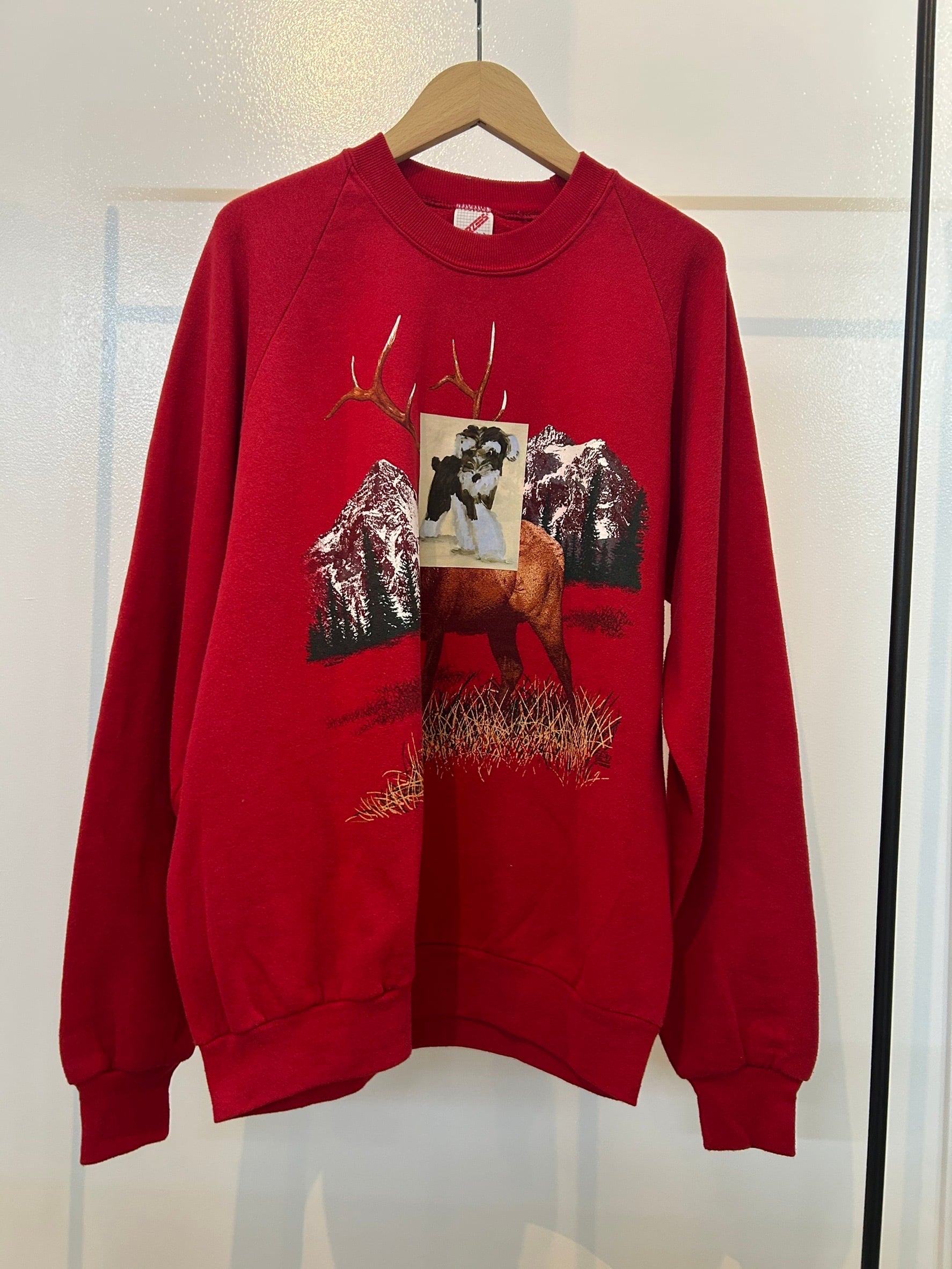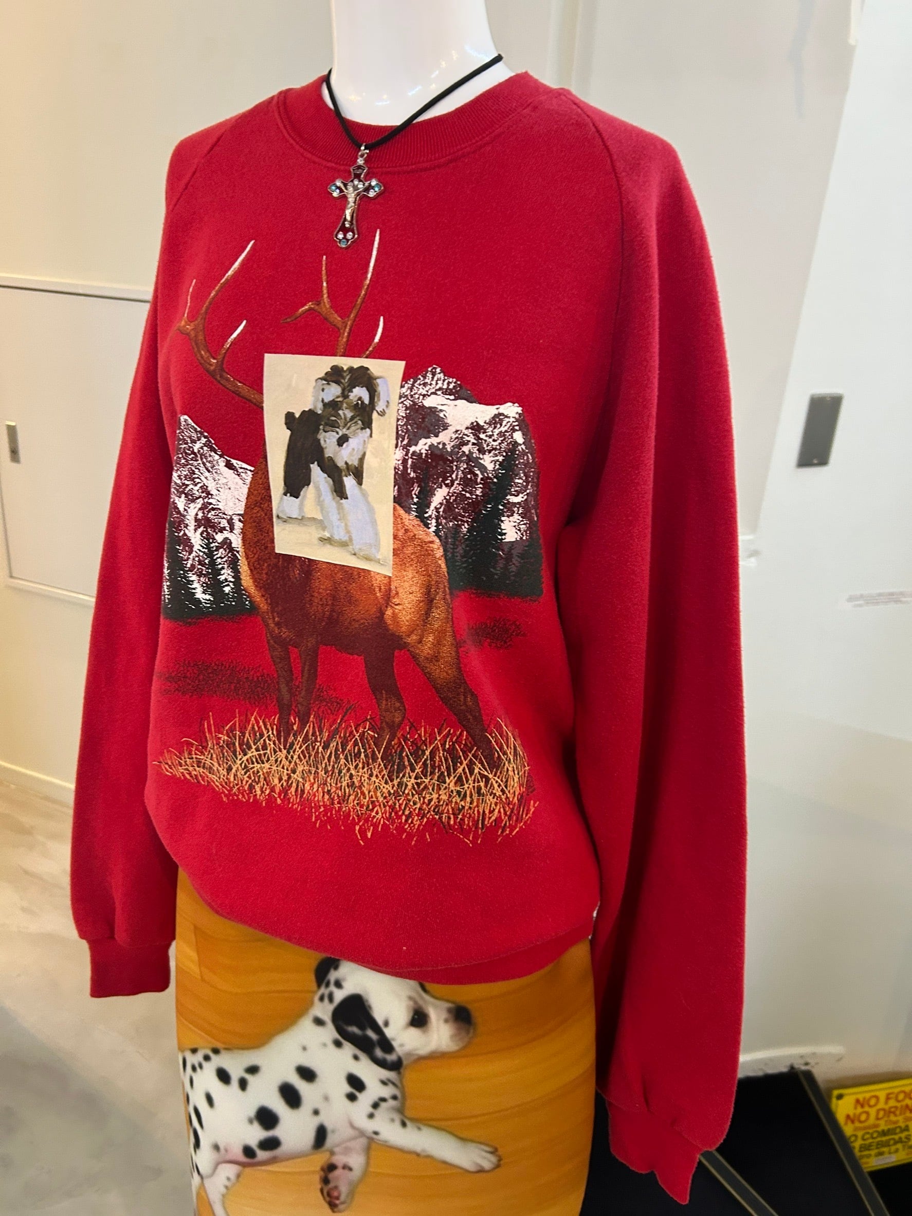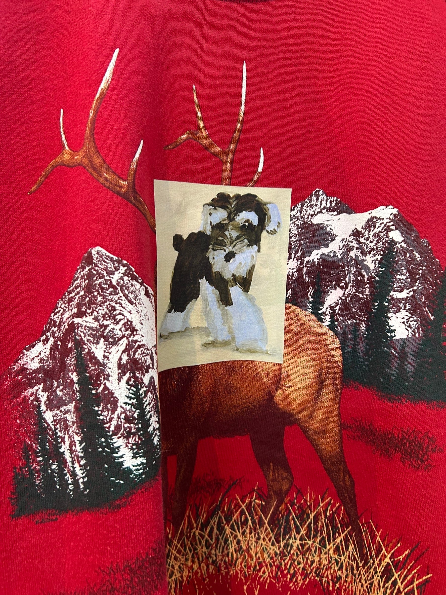 素材: 50%Cotton 50%Polyester サイズ: 着丈68cm 身幅54cm 裄丈93cm ダメージ: 写真18〜20枚目の取りきれない細かな毛羽立ちがあります。 安藤智展「FANCY♡」に合わせて制作したシリーズ。安藤智の油彩作品とitimiのコラボです。