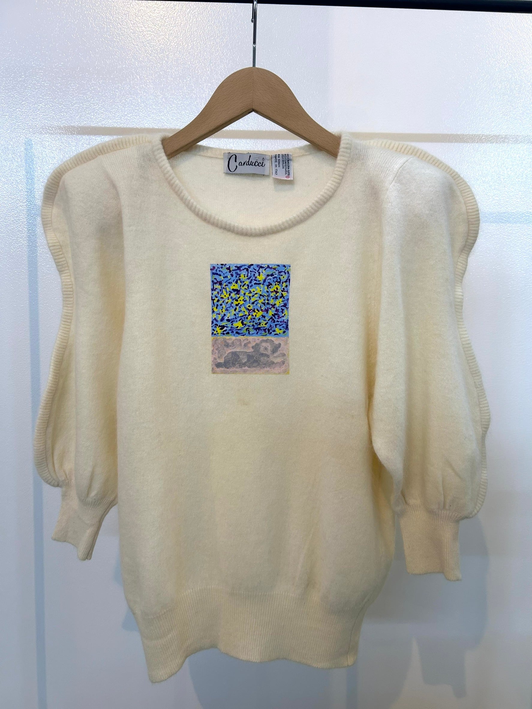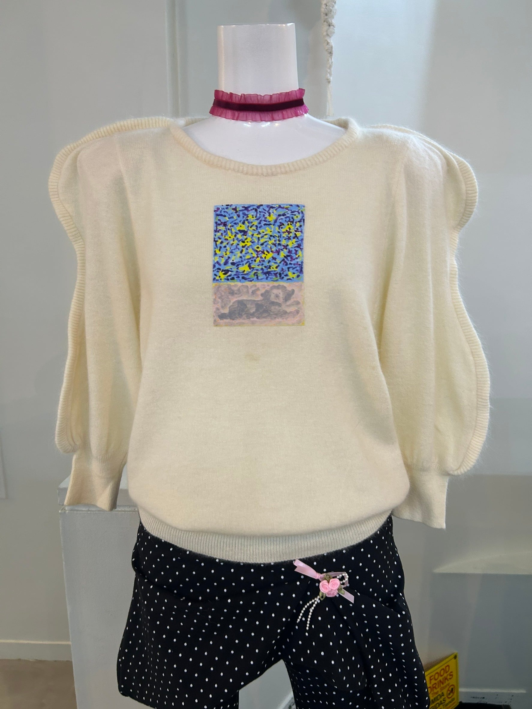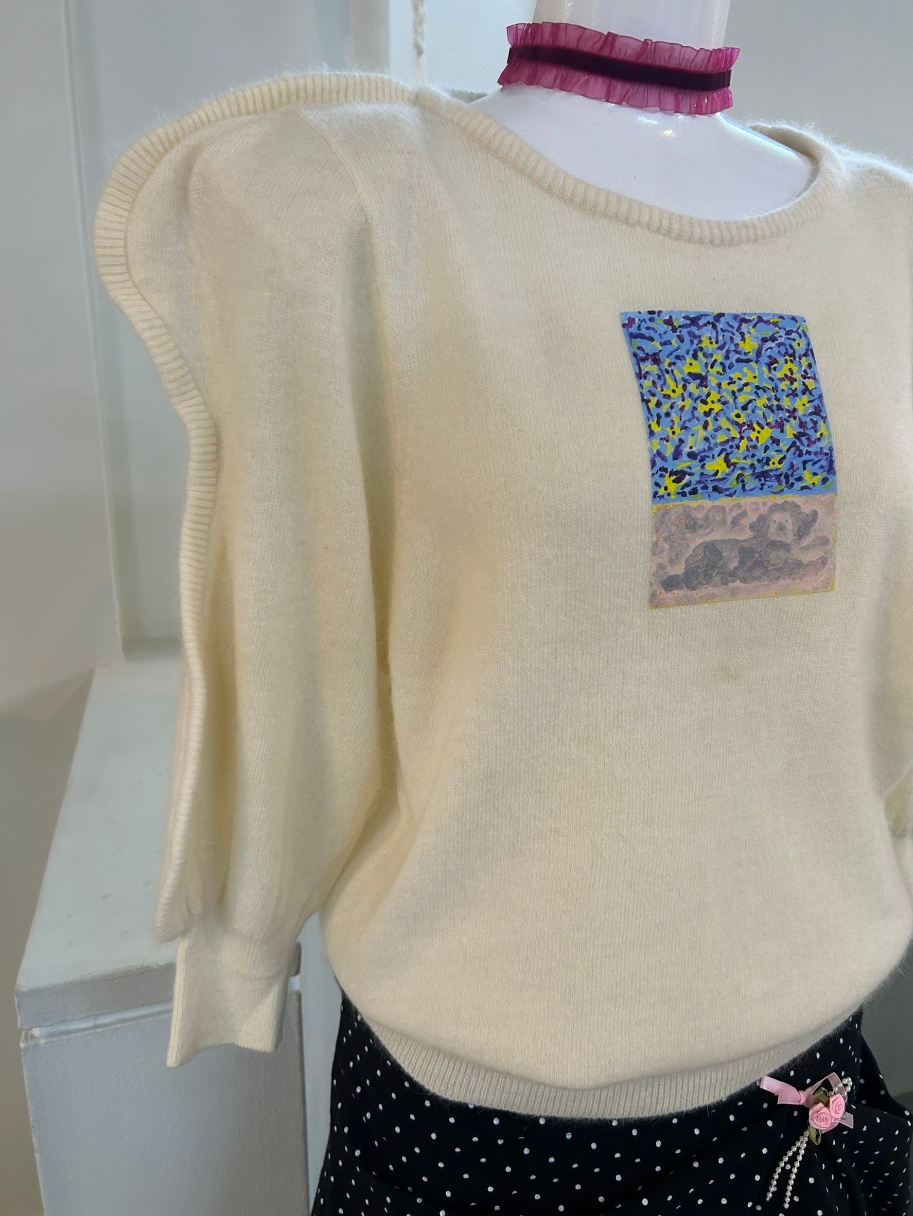 素材: 40%Angora 40%Wool 20%Nylon サイズ: 着丈58cm 肩幅35cm 身幅49cm 袖丈44.5cm ダメージ: 写真15〜17枚目の汚れ、18枚目のお直し跡があります made in ITALY 安藤智展「FANCY♡」に合わせて制作したシリーズ。安藤智の油彩作品とitimiのコラボです。