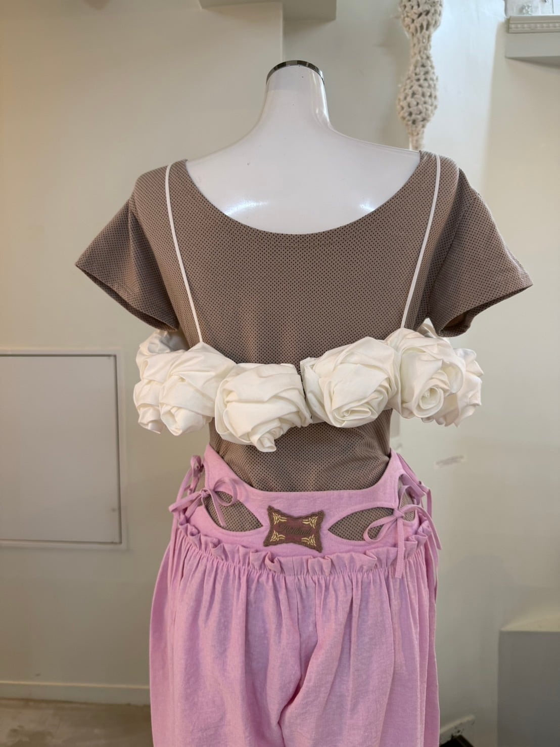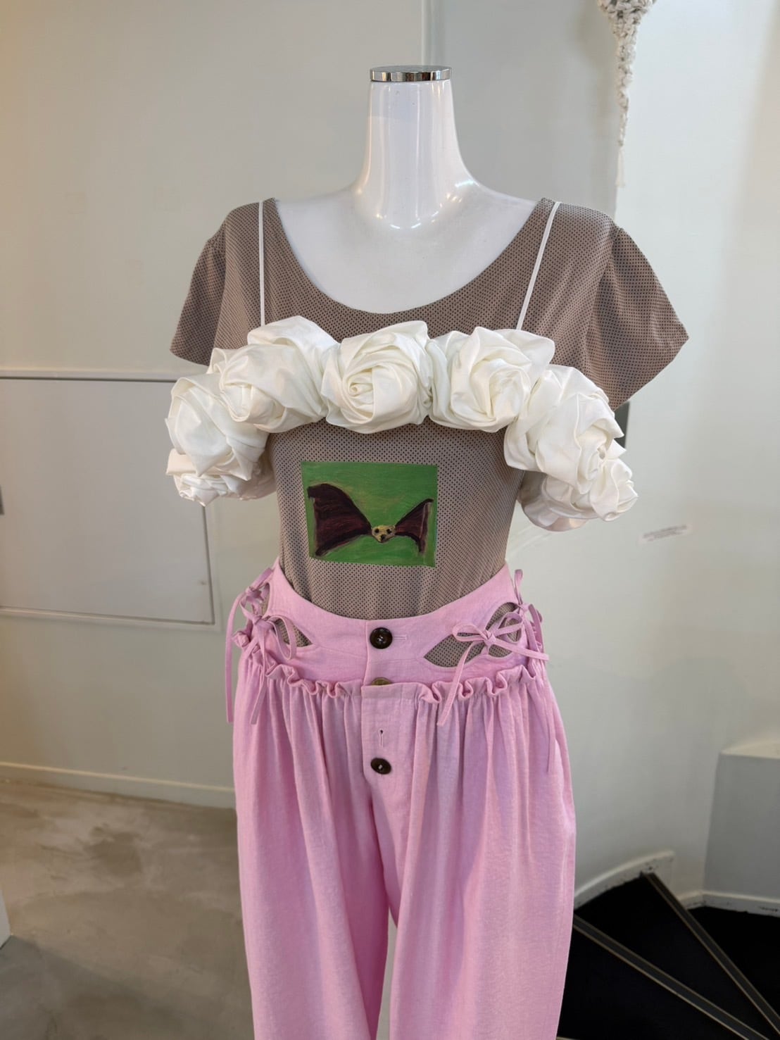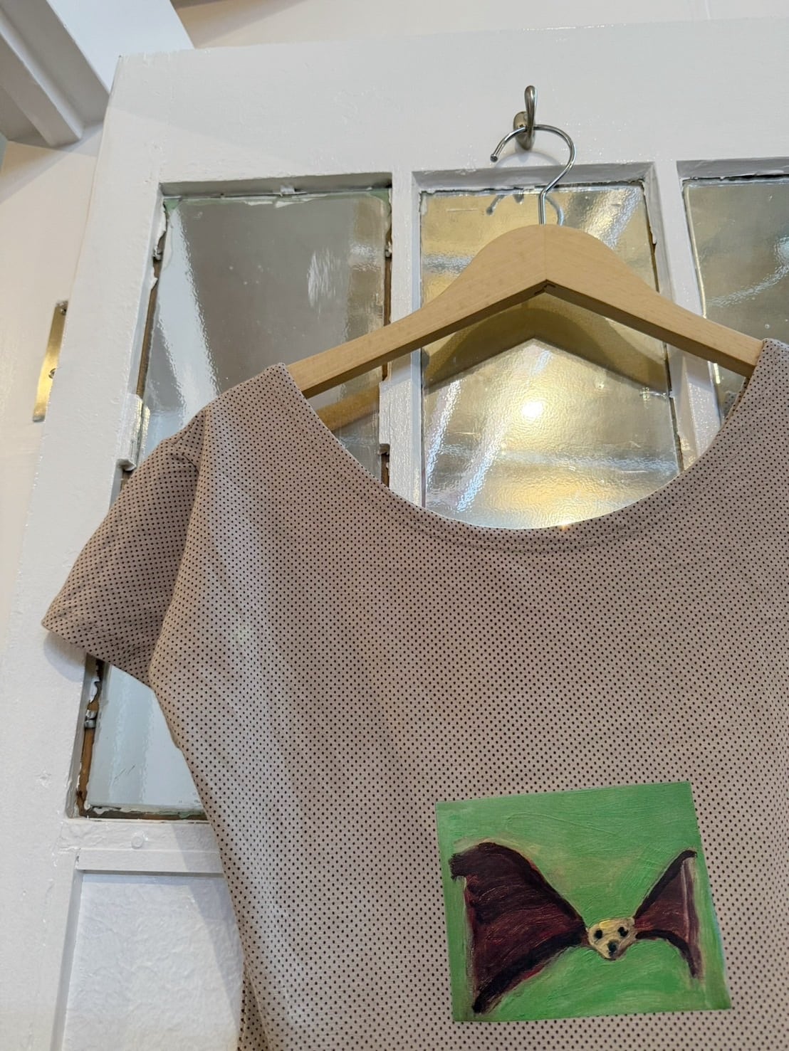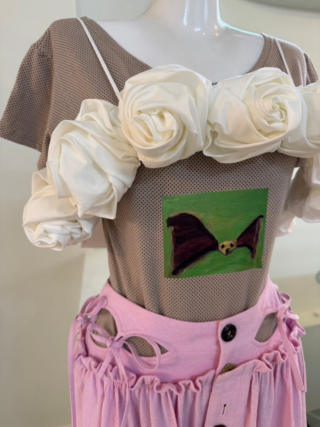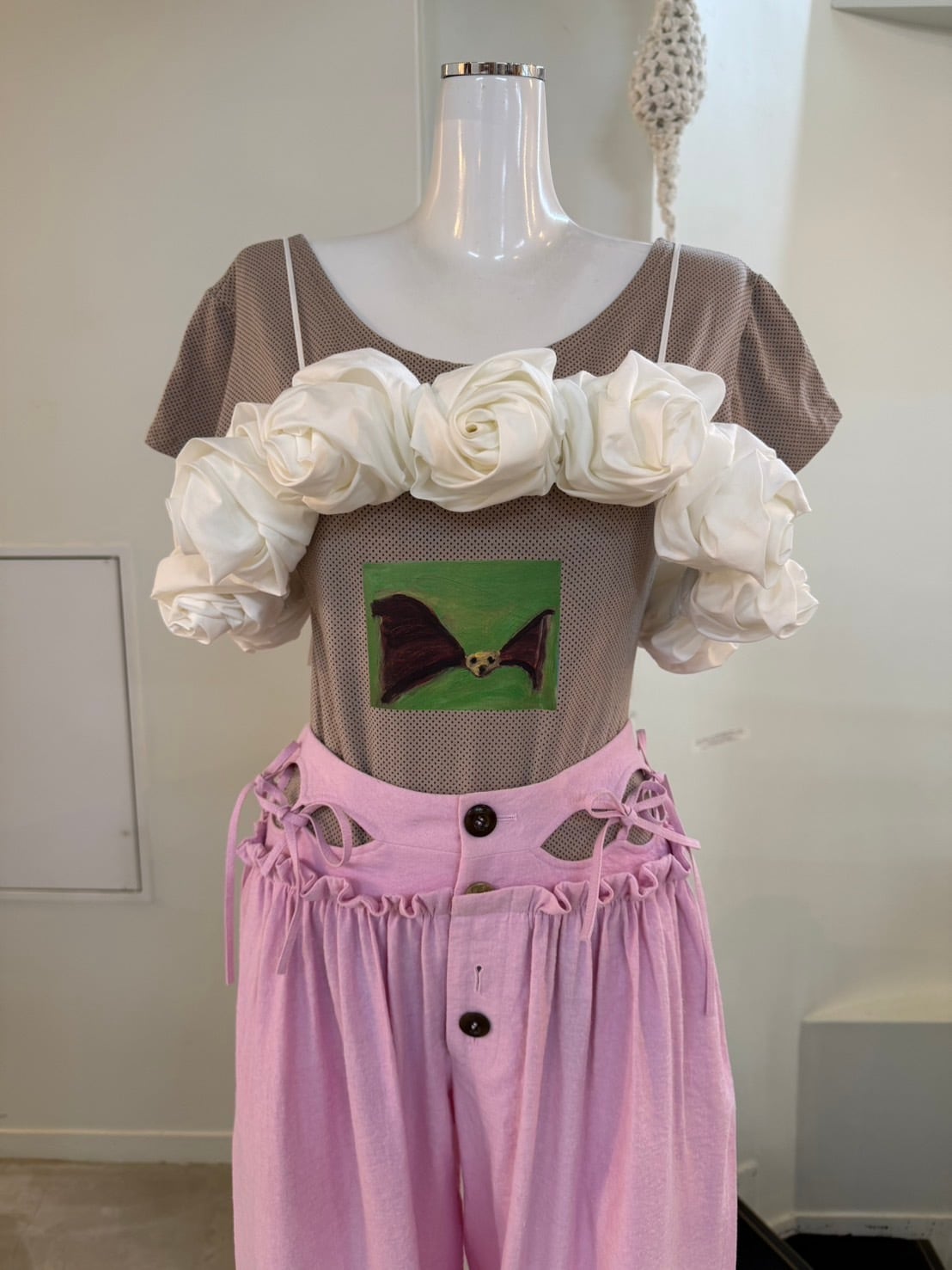 素材: 45%Polyester 45%Fibrana 10%Spandex サイズ: 肩幅43cm袖丈12cm 身幅39cm 身丈55cm(最大) Made in Spain 安藤智展「FANCY♡」に合わせて制作したシリ ーズ。安藤智の油彩作品とitimiのコラボです。