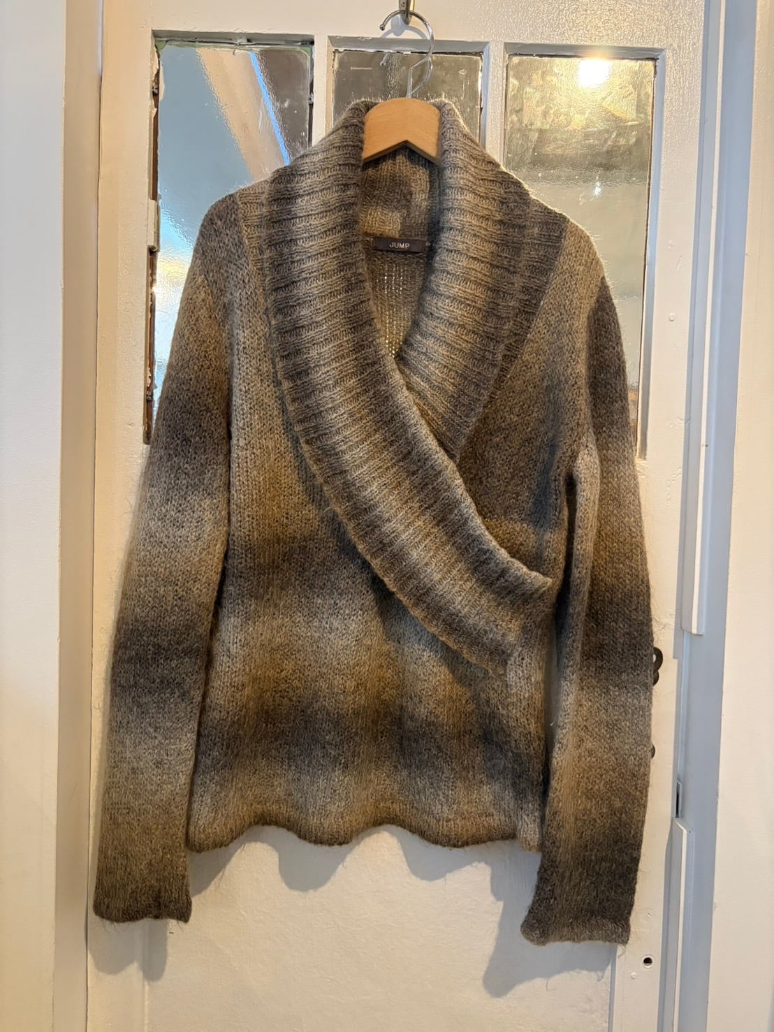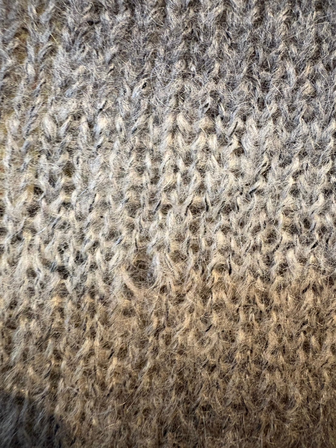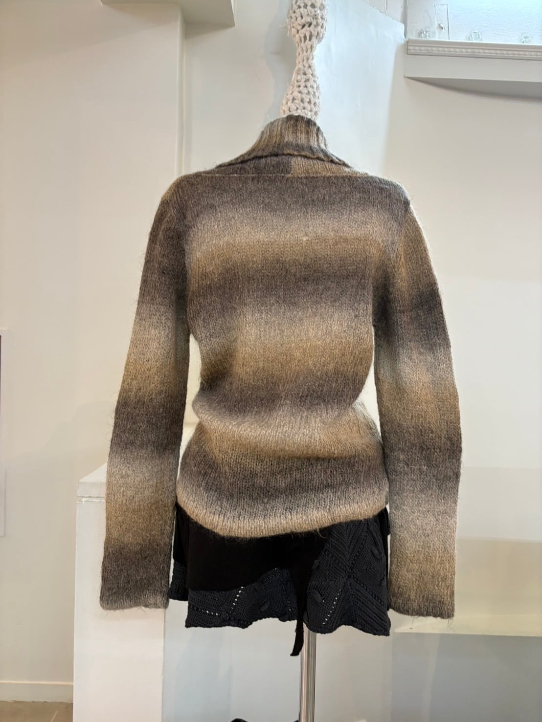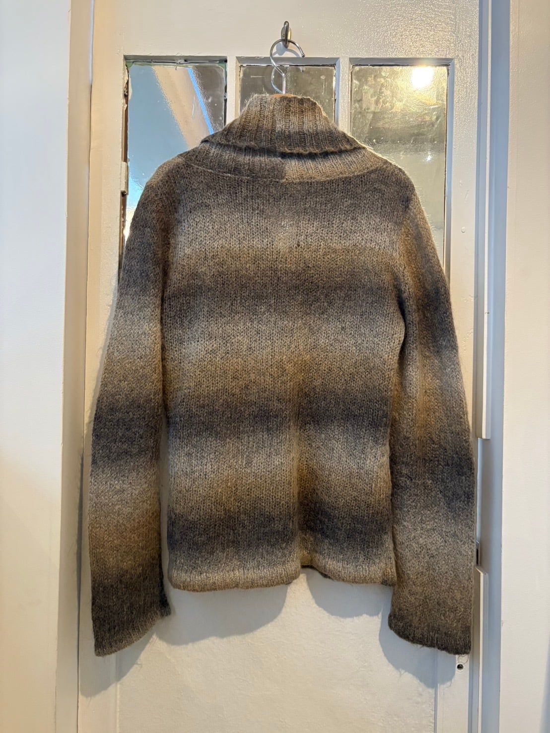 素材: 48%Mohair 32%Acrylic 20%Polyester サイズ: 肩幅43cm 身幅46cm 袖丈65cm 着丈57cm ダメージ: 写真8枚目の目が大きくなった箇所があります。