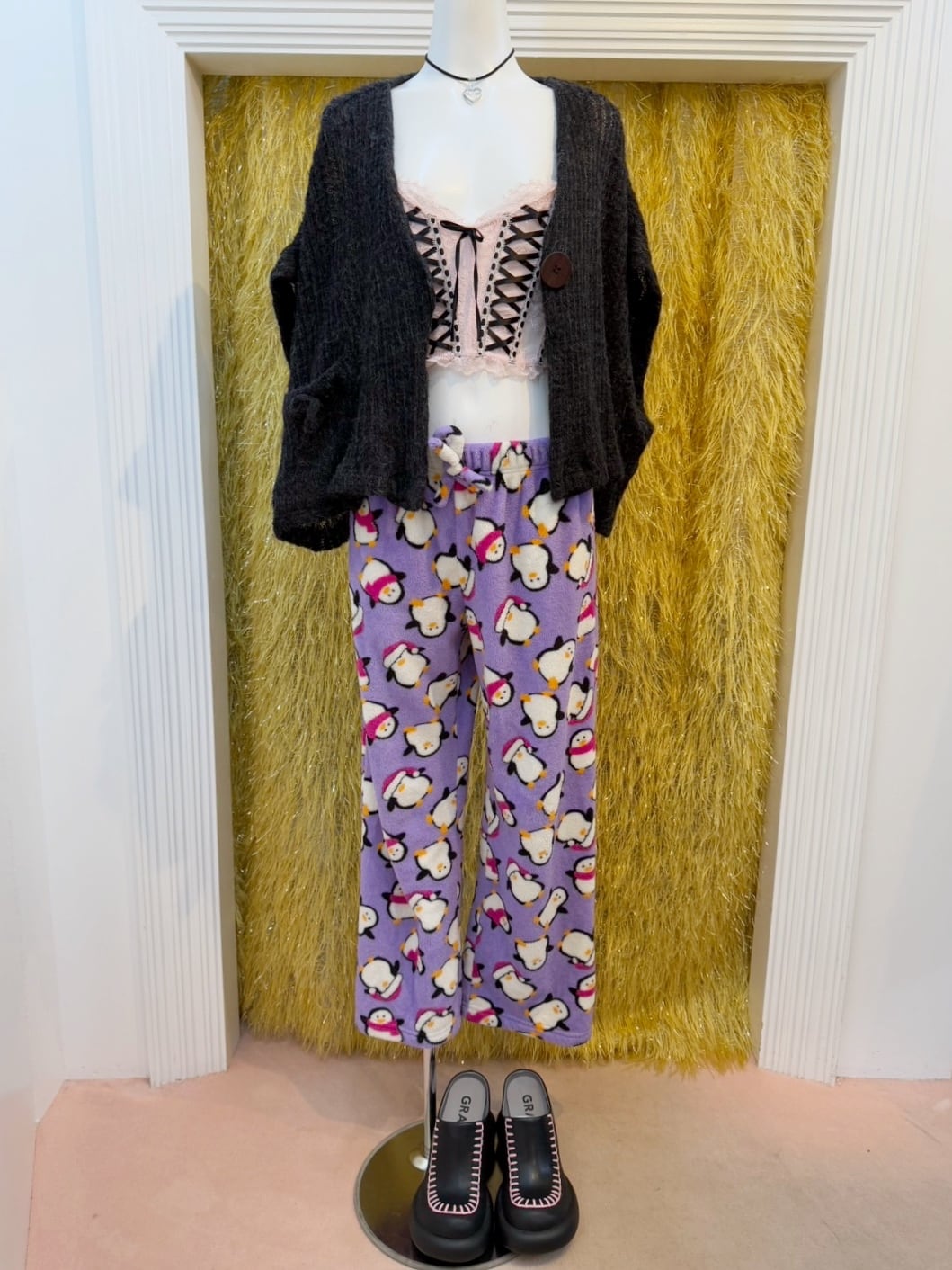 素材: 100%Polyester サイズ: ウエスト幅35.5cm ヒップ幅43cm 股上27cm 股下65cm わたり幅31cm 裾幅24cm ダメージ: 写真14枚目のような糸のほつれがあります。