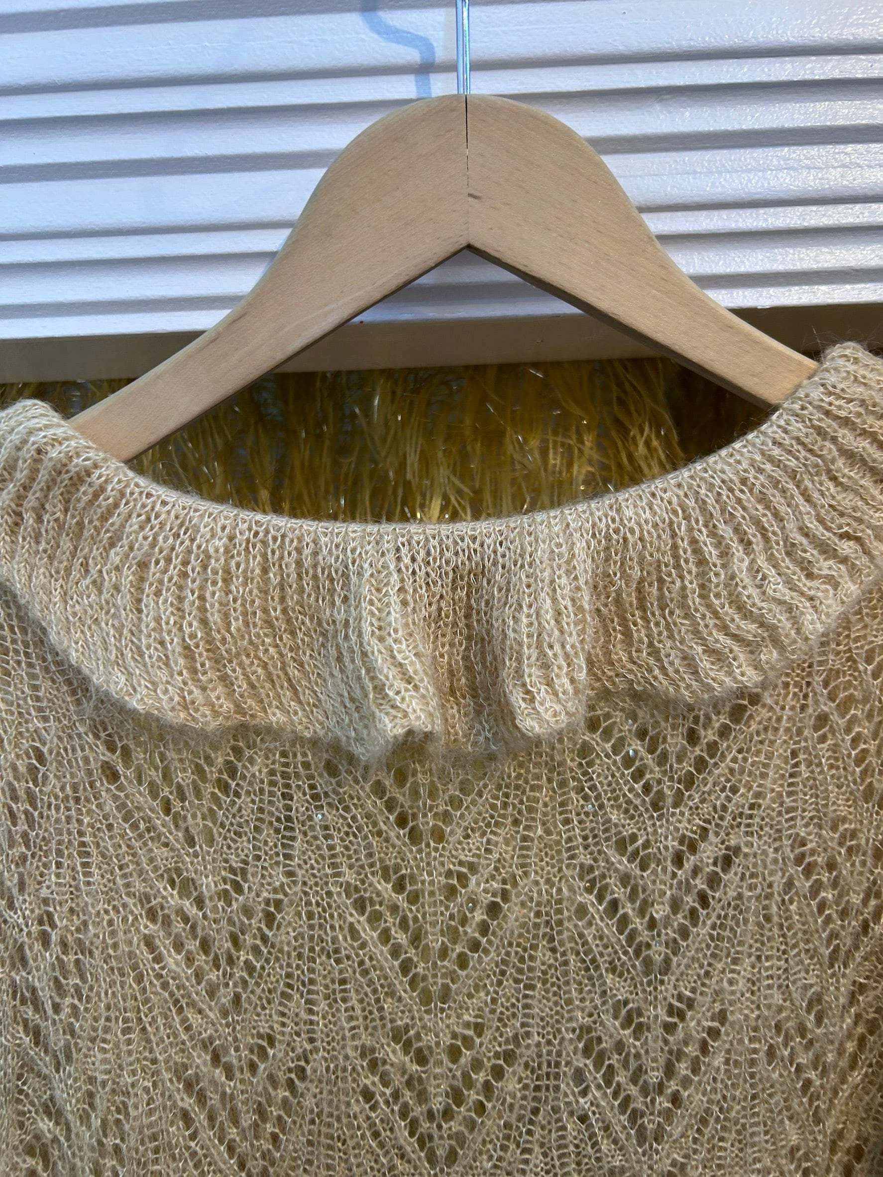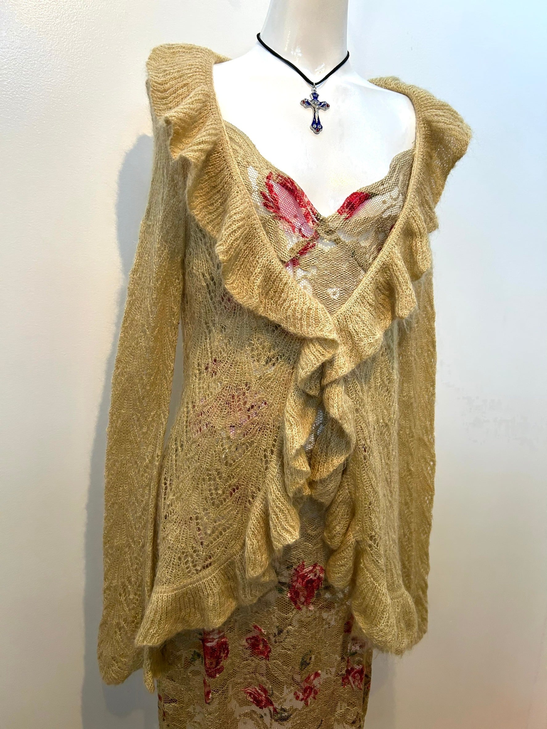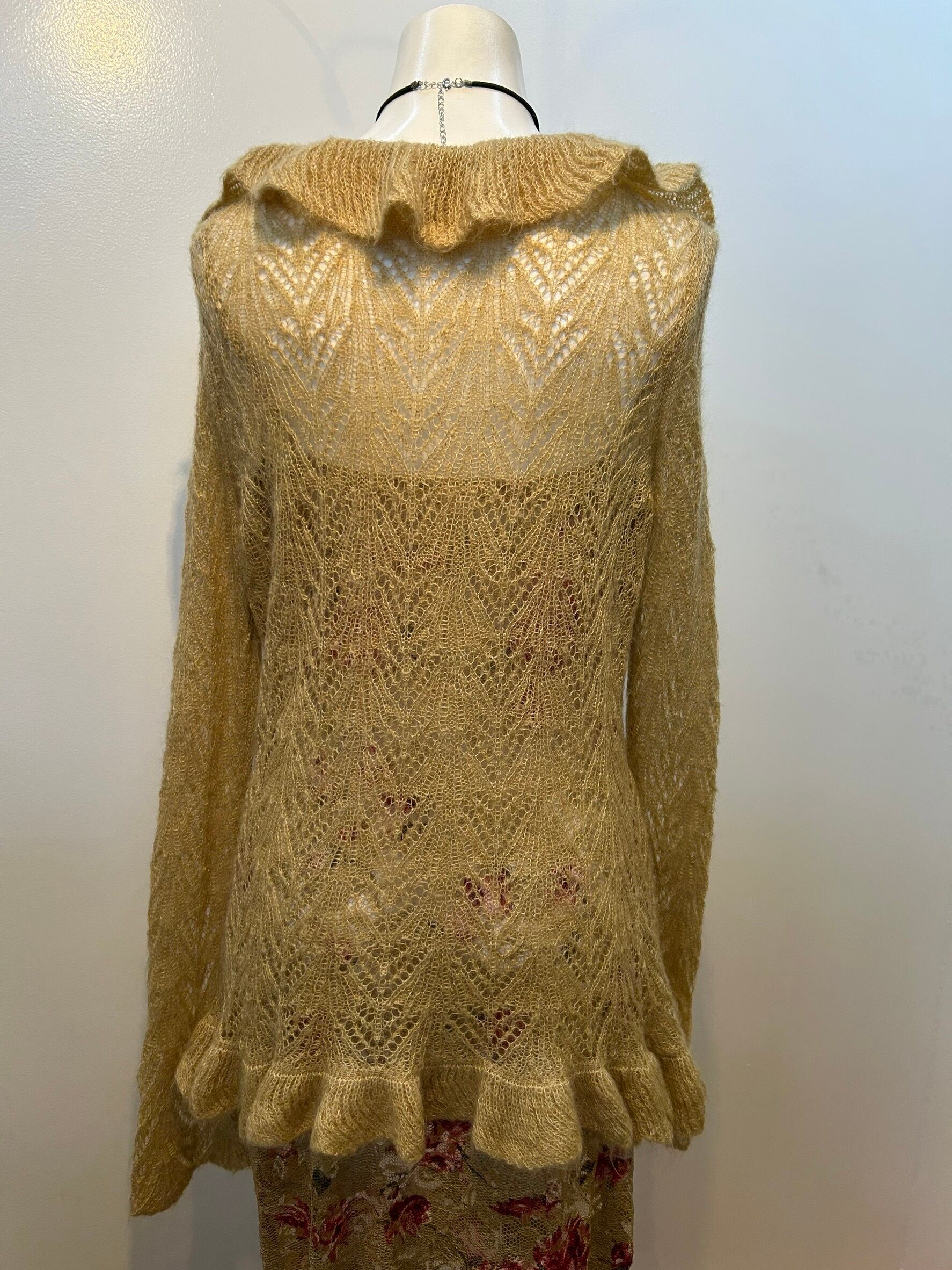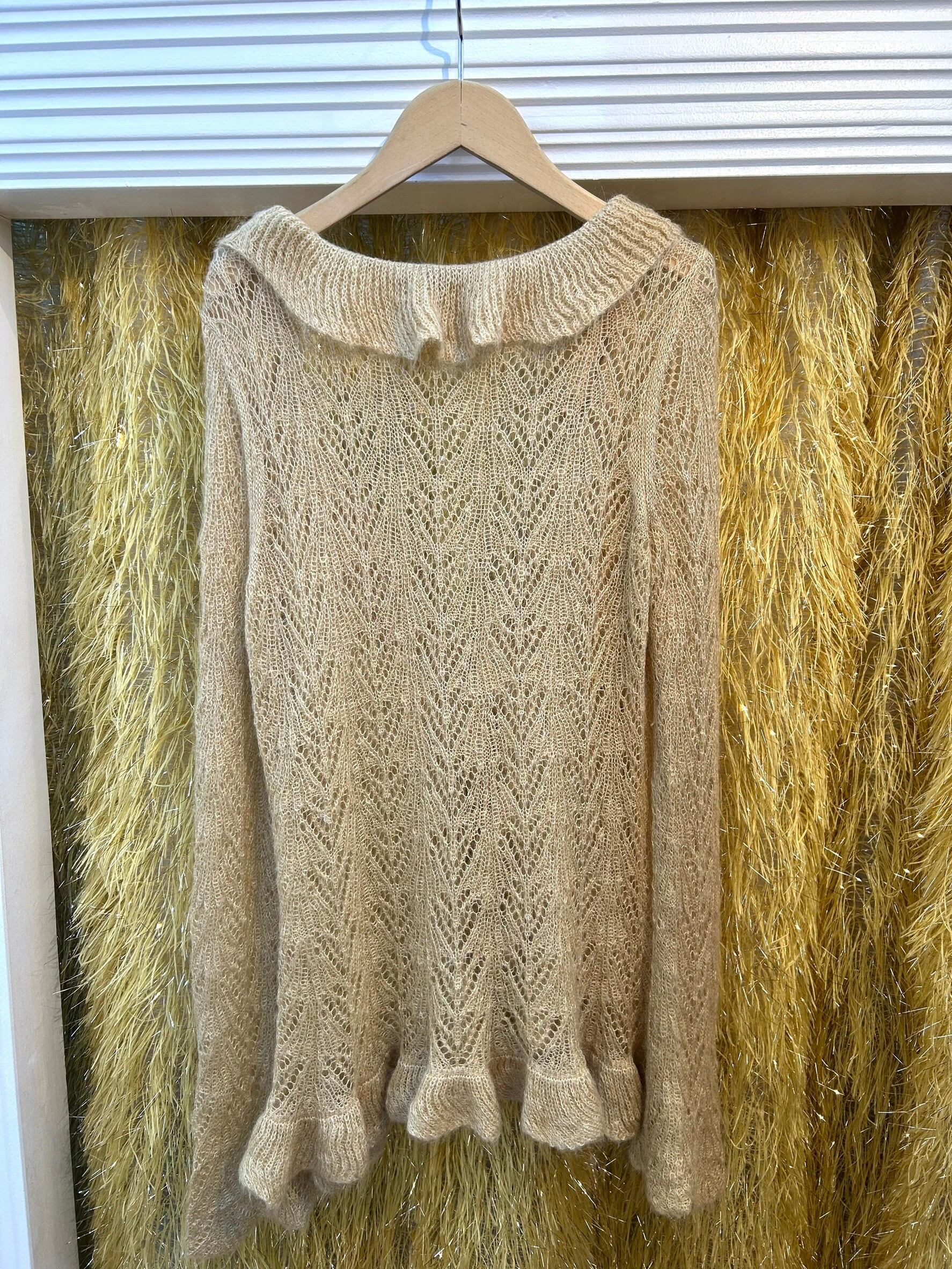 素材: 40%Mohair 24%Acrylic 18%Silk 18%Nylon サイズ: L(表記) 着丈67cm 肩幅38cm 身幅35cm 袖丈76cm ダメージ: 写真19.20枚目のような糸の目立つ部分があります