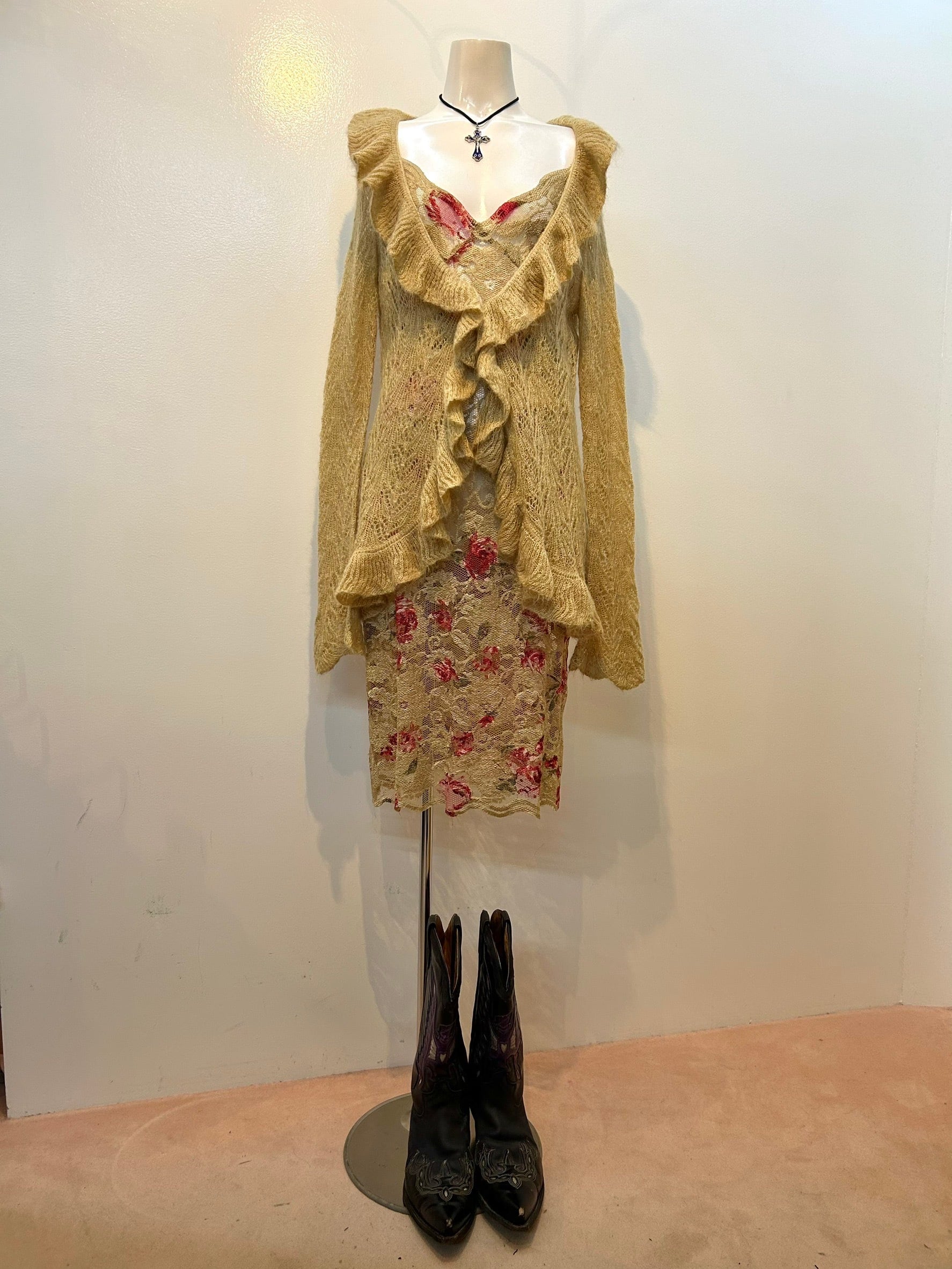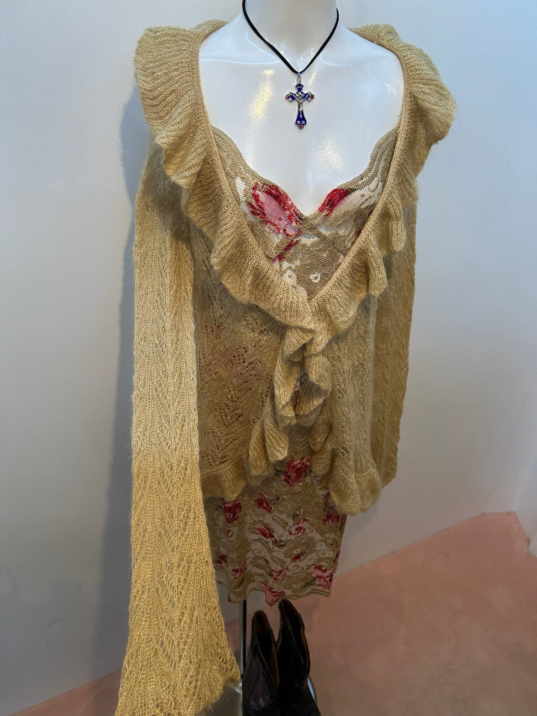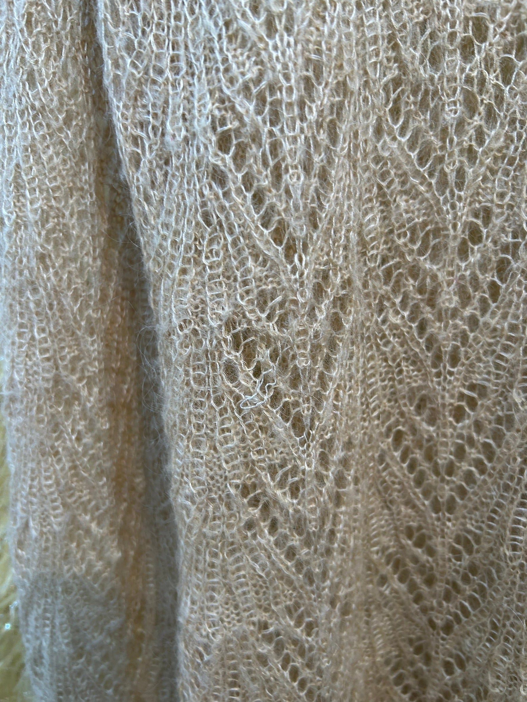 素材: 40%Mohair 24%Acrylic 18%Silk 18%Nylon サイズ: L(表記) 着丈67cm 肩幅38cm 身幅35cm 袖丈76cm ダメージ: 写真19.20枚目のような糸の目立つ部分があります