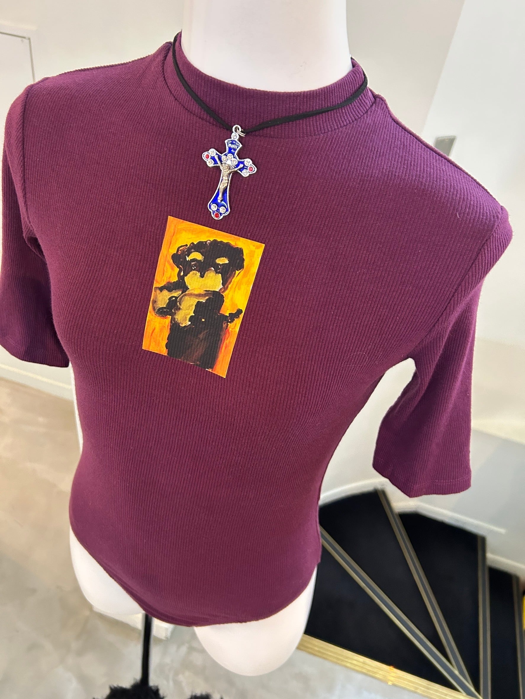 素材: 50%Polyester 48%Cotton 2%Elastan サイズ: 総丈69cm 肩幅34cm 身幅30cm 袖丈25cm ダメージ: 写真15枚目の汚れがあります 安藤智展「FANCY♡」に合わせて制作したシリーズ。安藤智の油彩作品とitimiのコラボです。