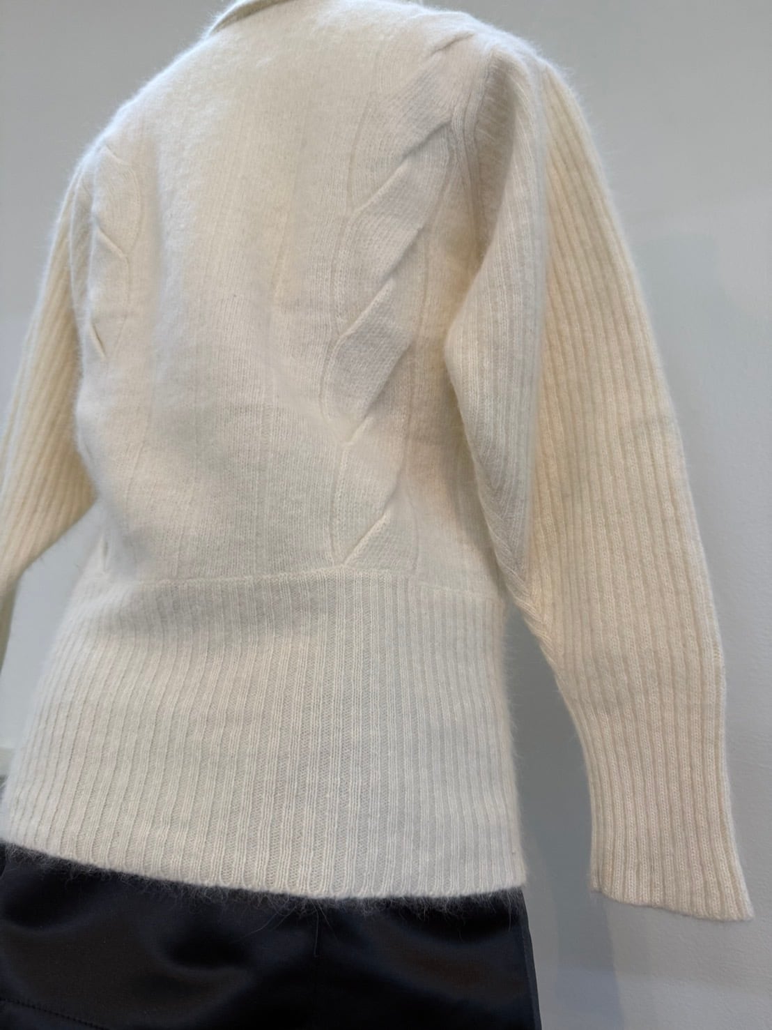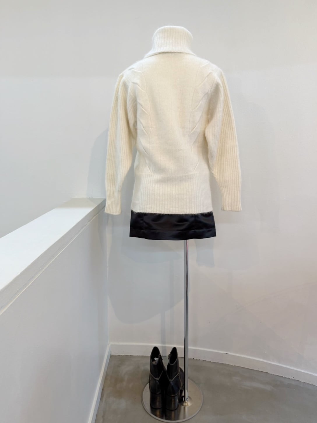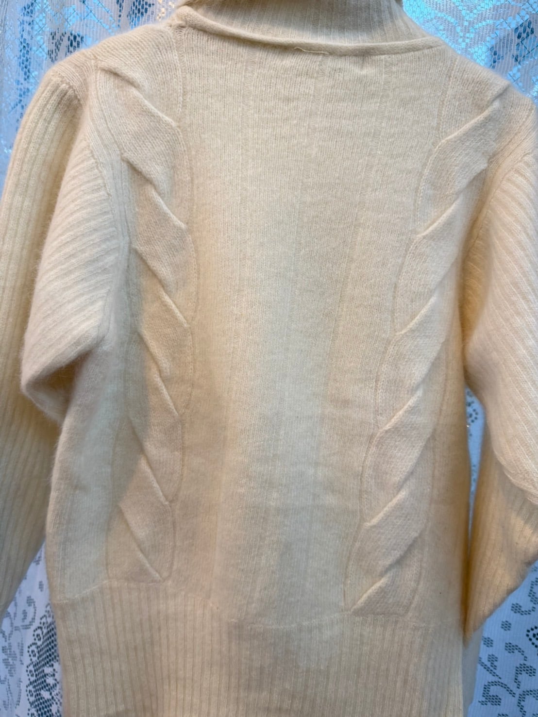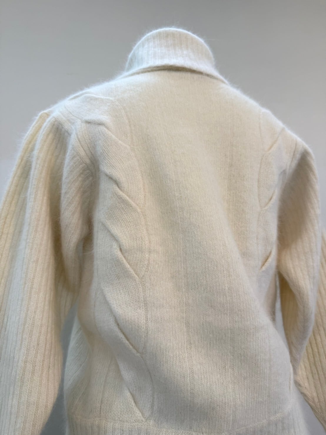 素材: 50%Wool 40%Angora 10%Polyester サイズ: 肩幅42cm 袖丈59cm 身幅41cm 身丈57cm タートル幅21cm ダメージ: 写真18枚目のような首の後ろにタグ糸が見えています。
