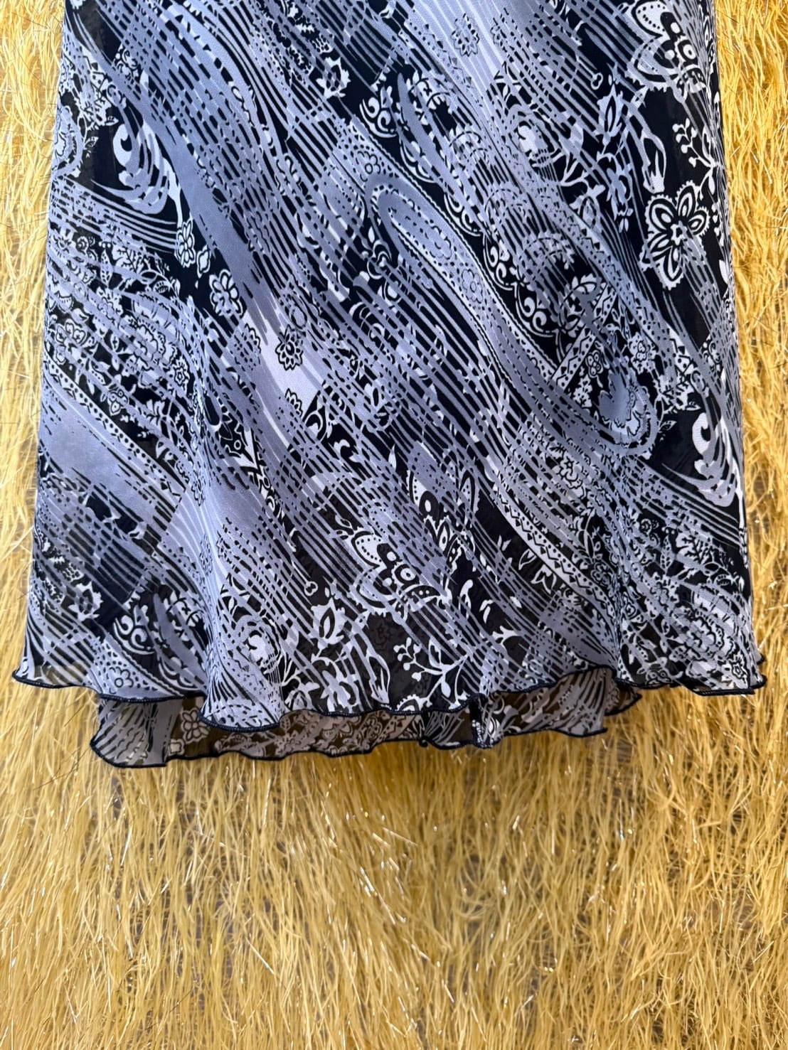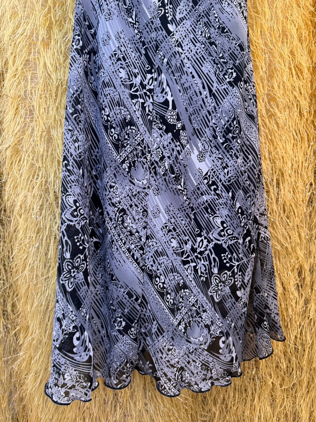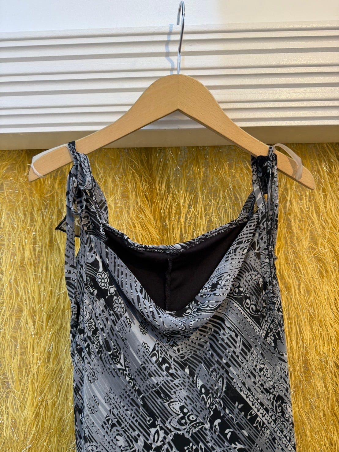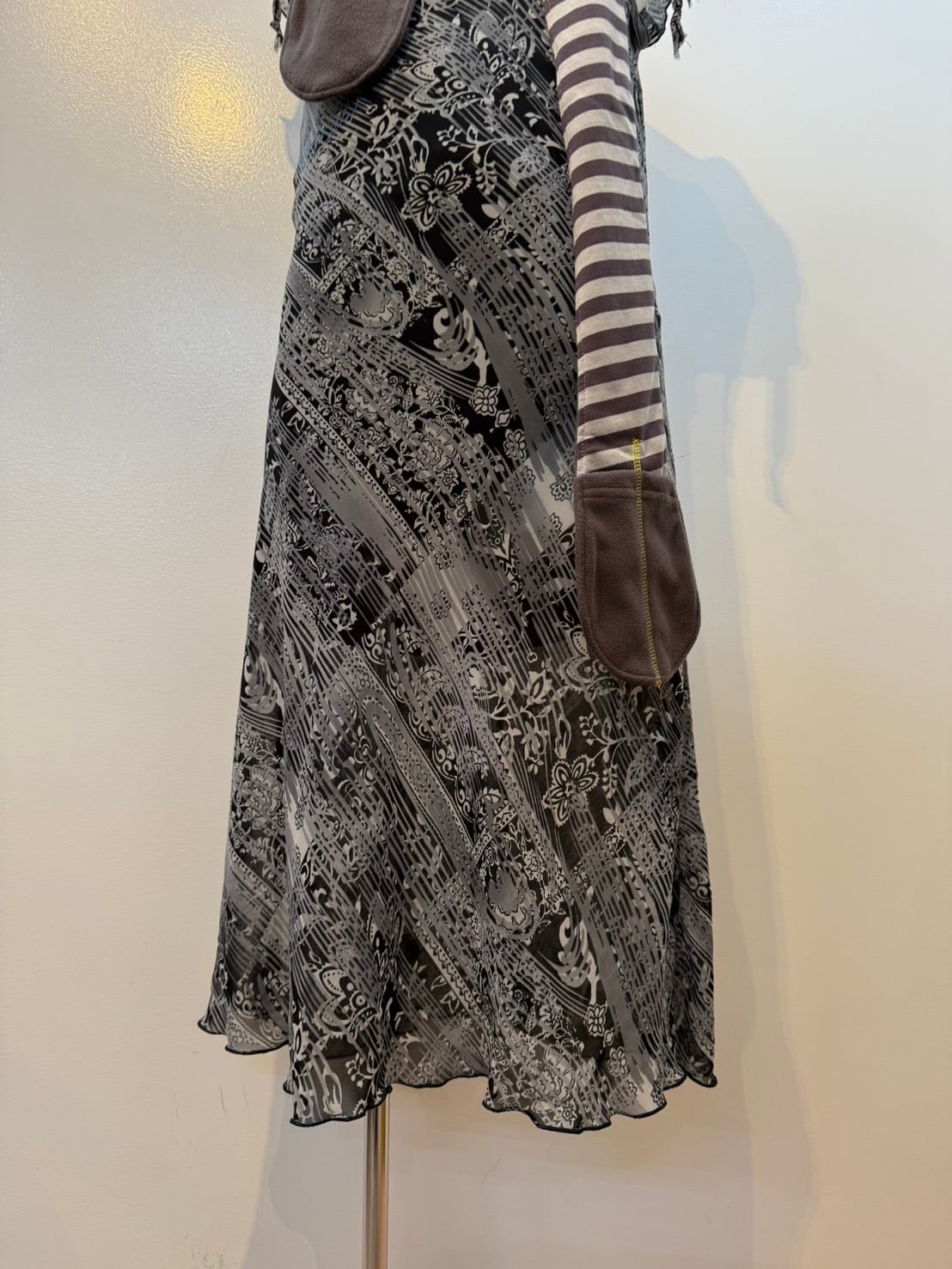 素材: Polyester(表記なし) サイズ: 肩幅26cm 身幅44cm 総丈104cm ダメージ: 写真20枚目のような電線している部分があります。
