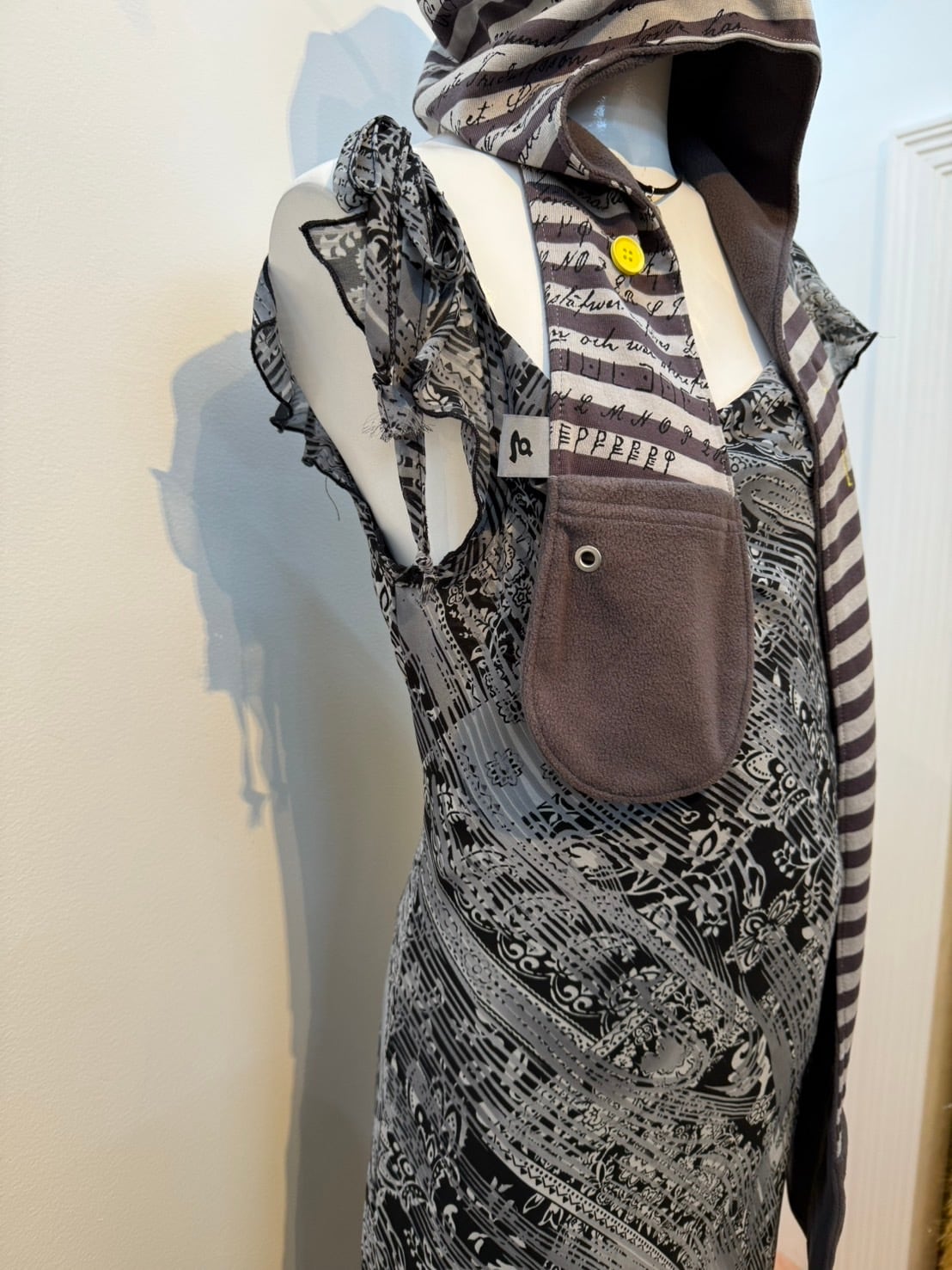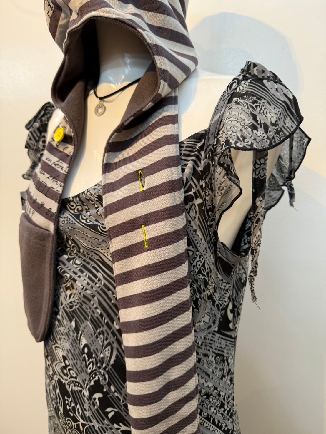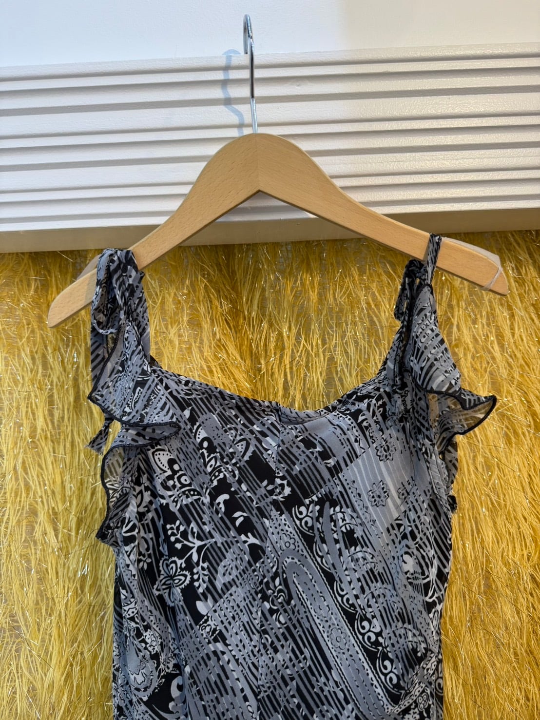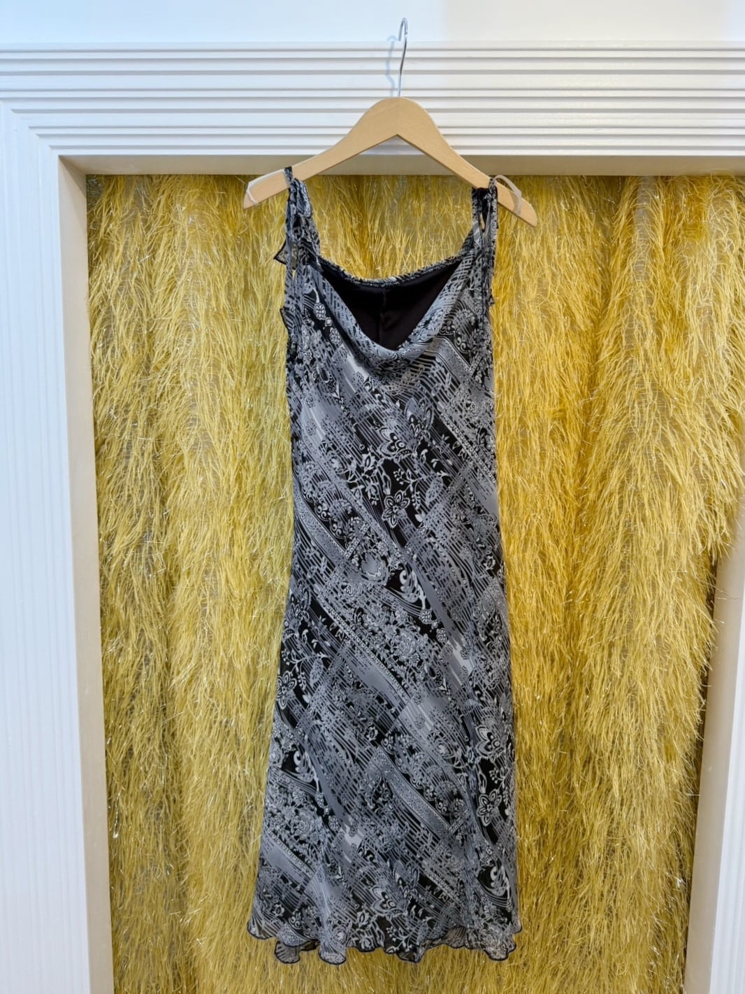 素材: Polyester(表記なし) サイズ: 肩幅26cm 身幅44cm 総丈104cm ダメージ: 写真20枚目のような電線している部分があります。
