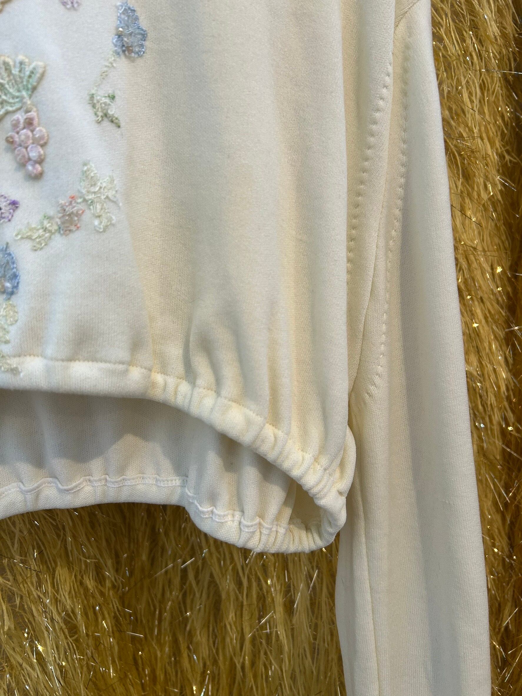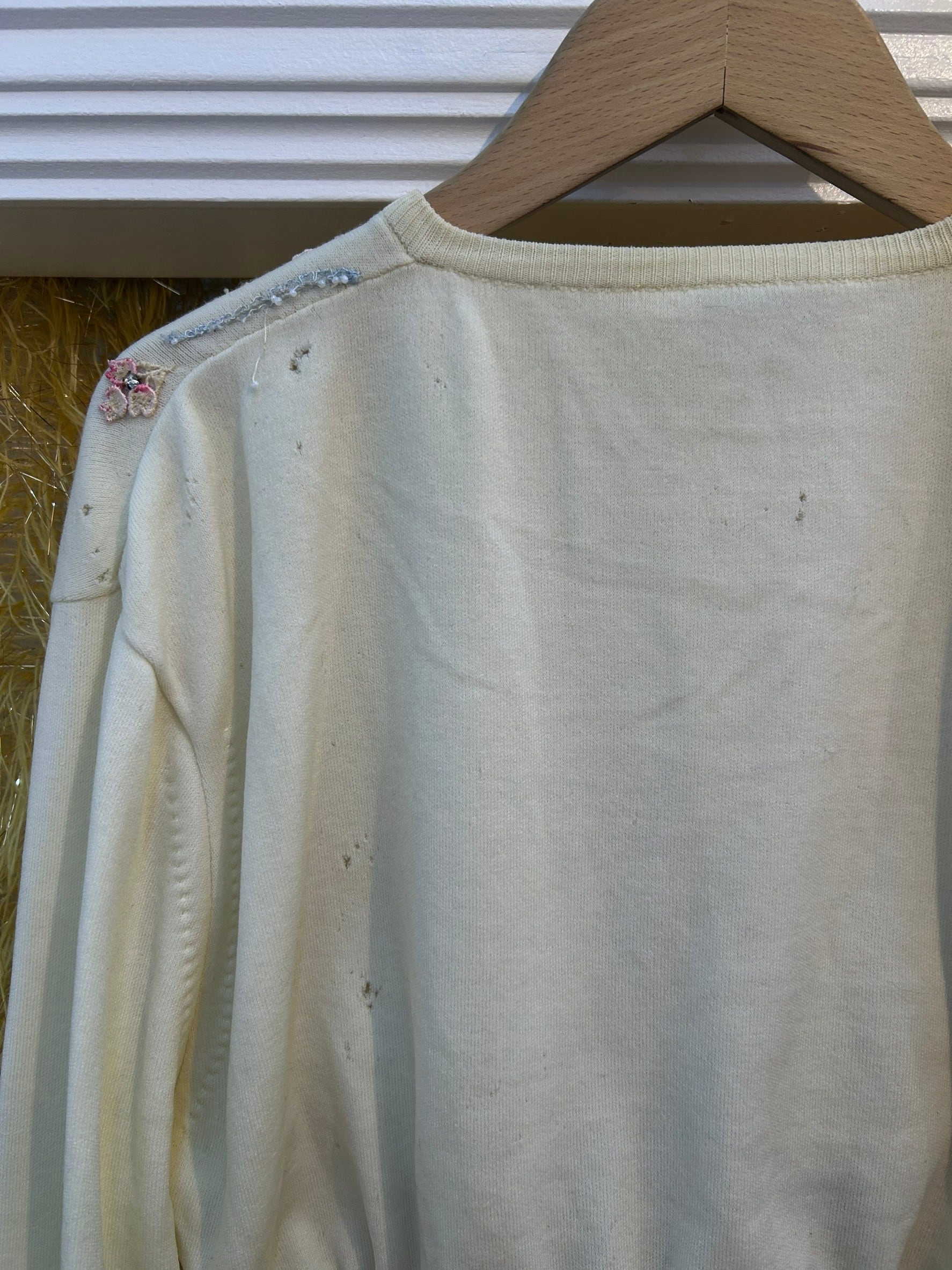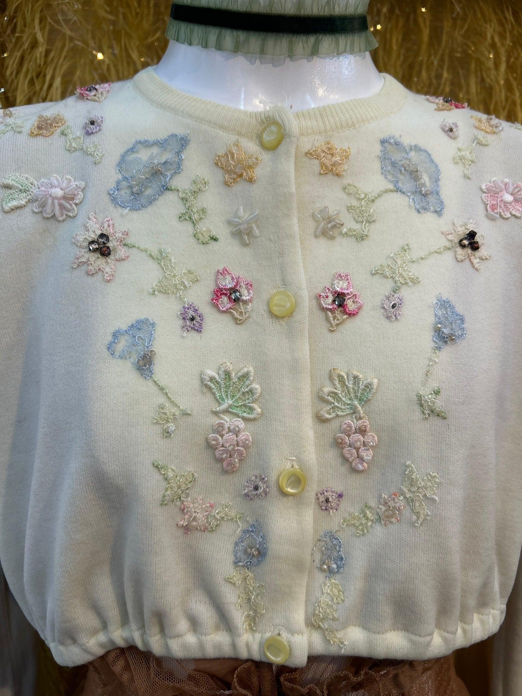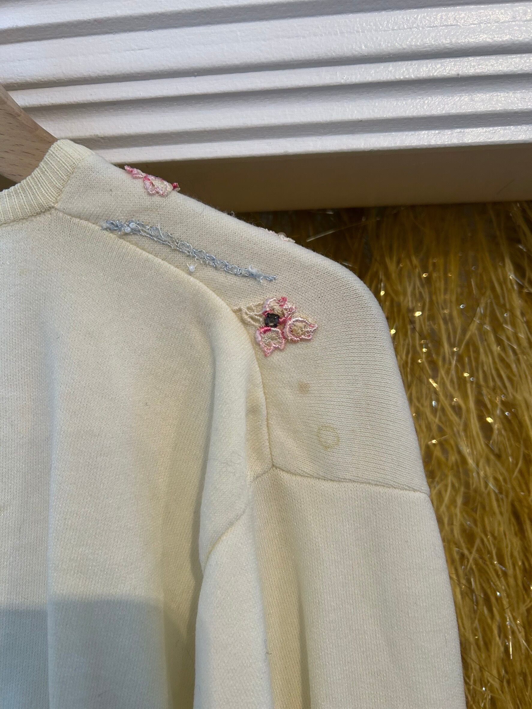 素材: Acrylic(表記なし) サイズ: 着丈35cm 肩幅45cm 身幅41cm 袖丈59cm ダメージ: 写真11〜19枚目の汚れ、生地のダメージ、20枚目の装飾の糸緩みがあります