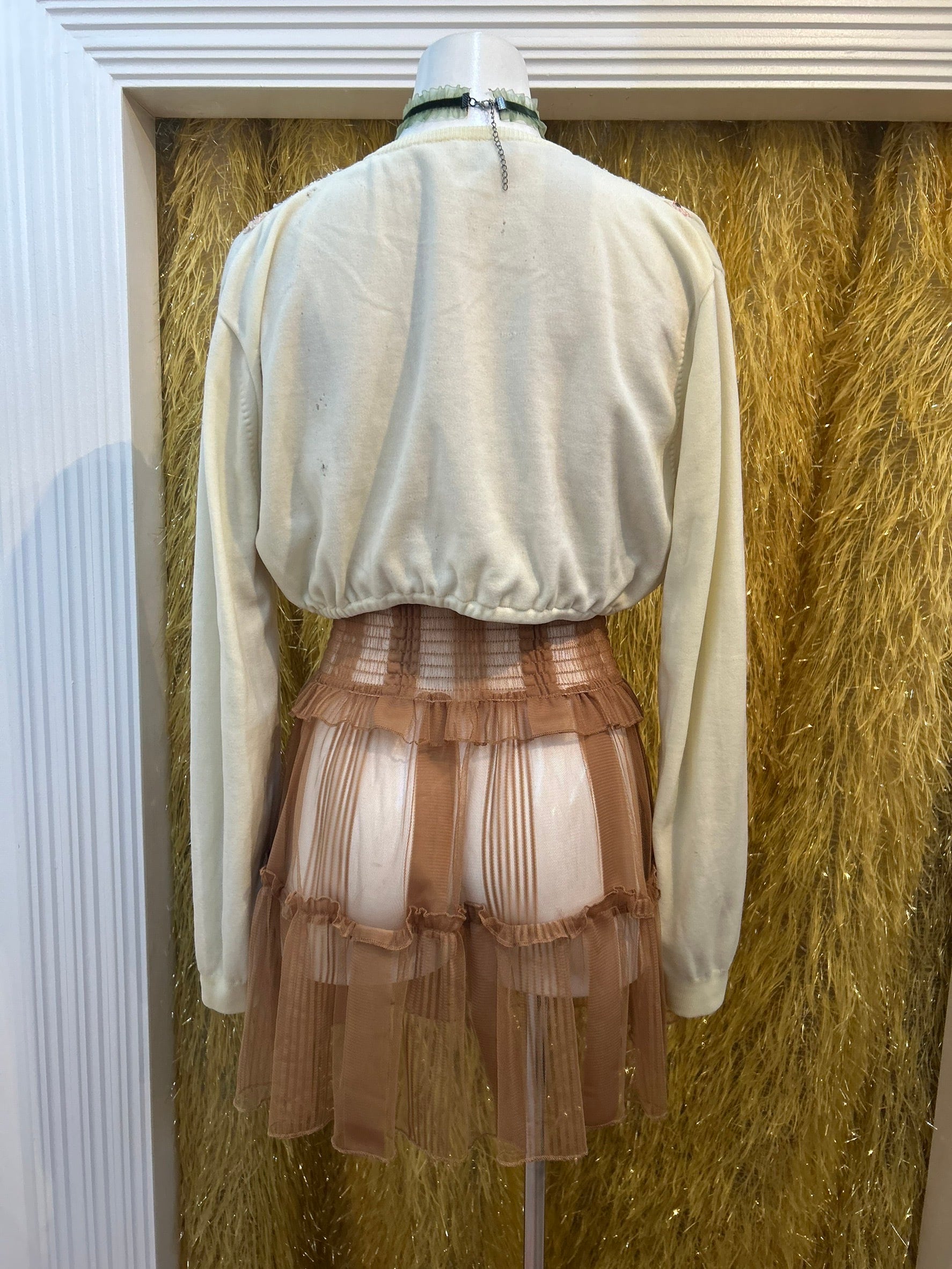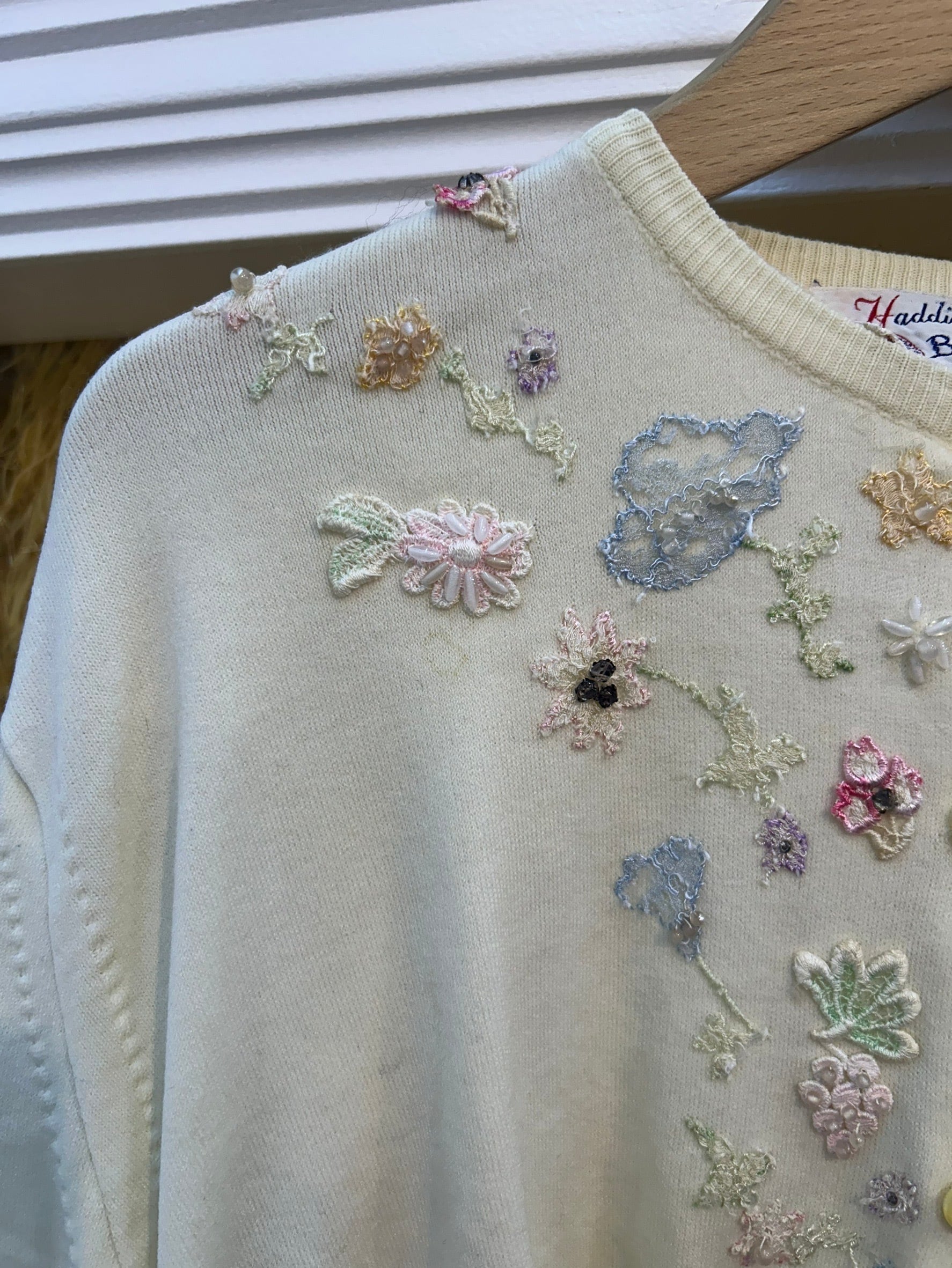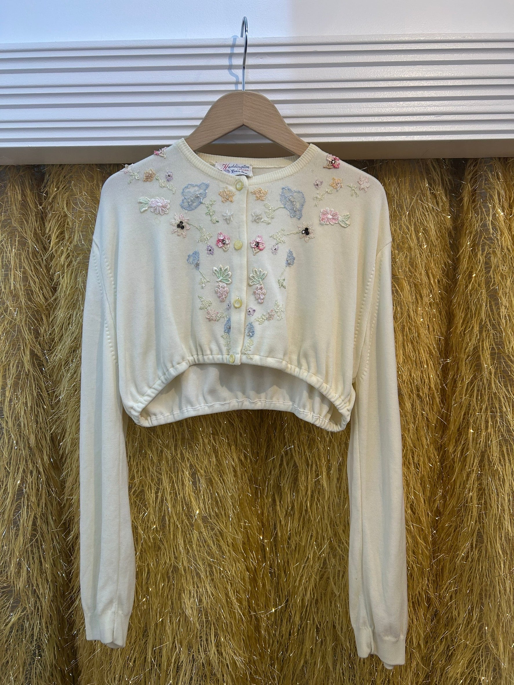 素材: Acrylic(表記なし) サイズ: 着丈35cm 肩幅45cm 身幅41cm 袖丈59cm ダメージ: 写真11〜19枚目の汚れ、生地のダメージ、20枚目の装飾の糸緩みがあります