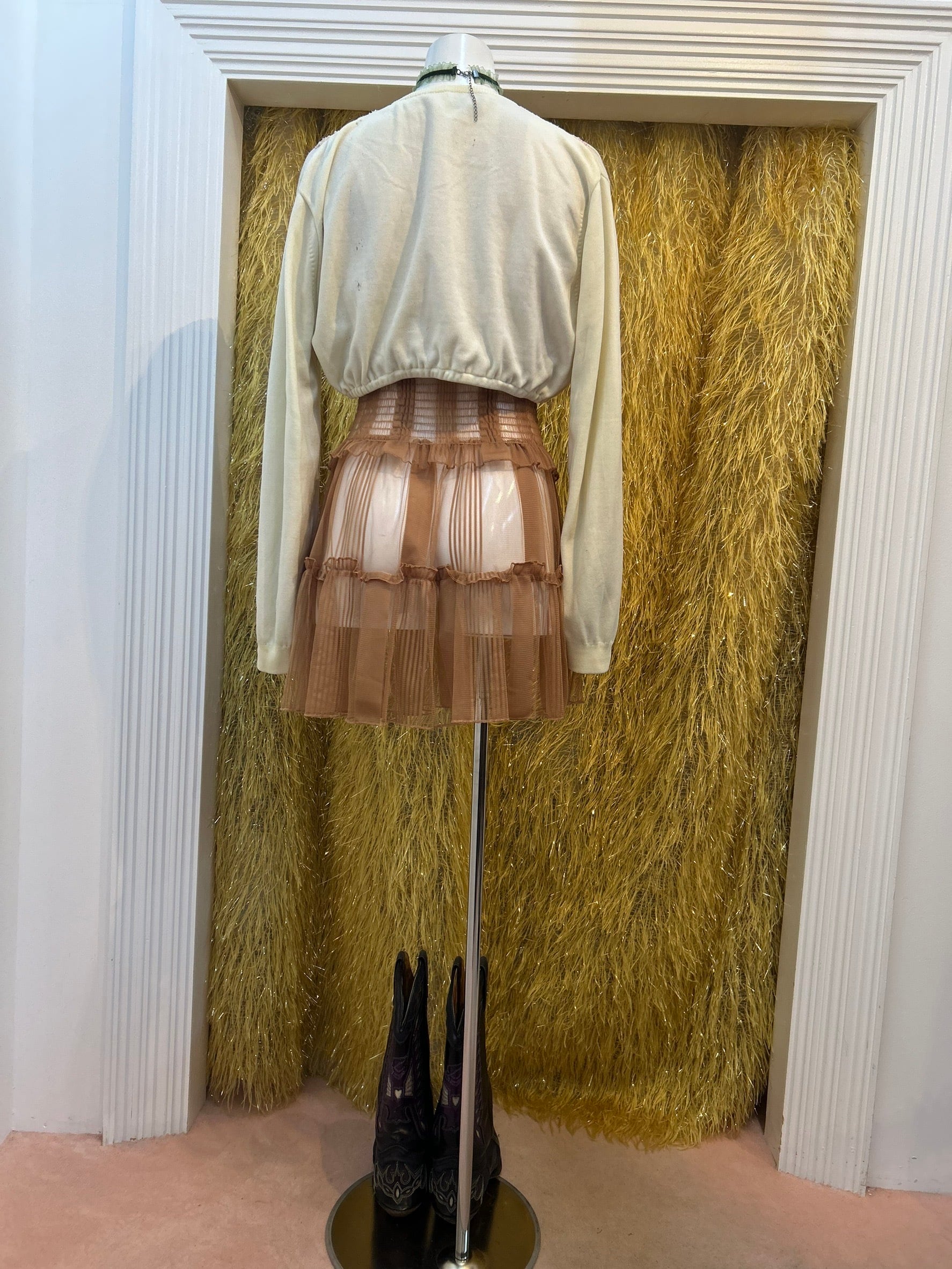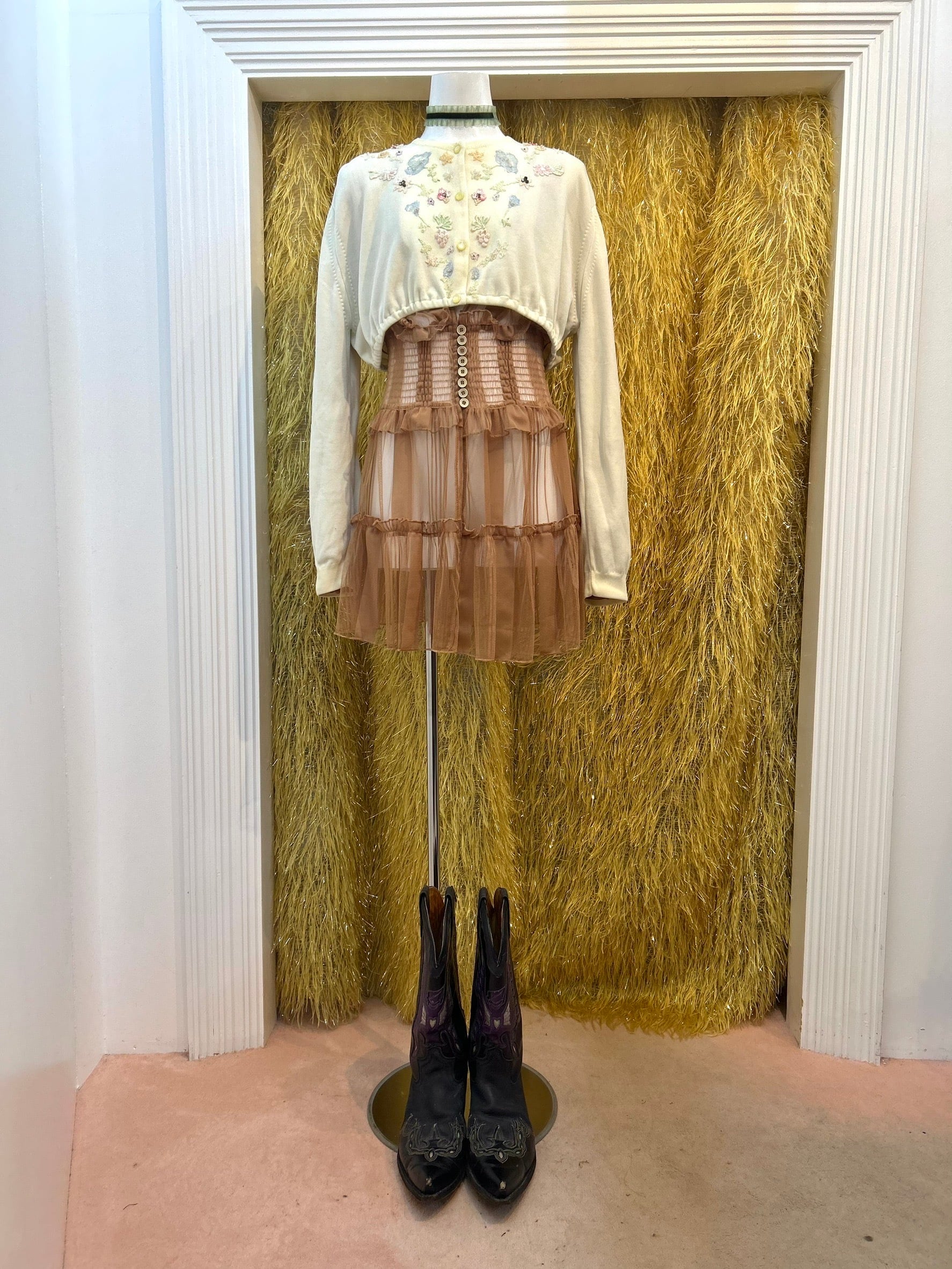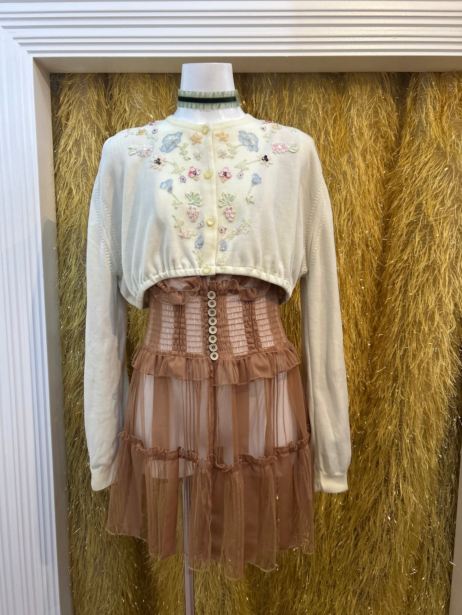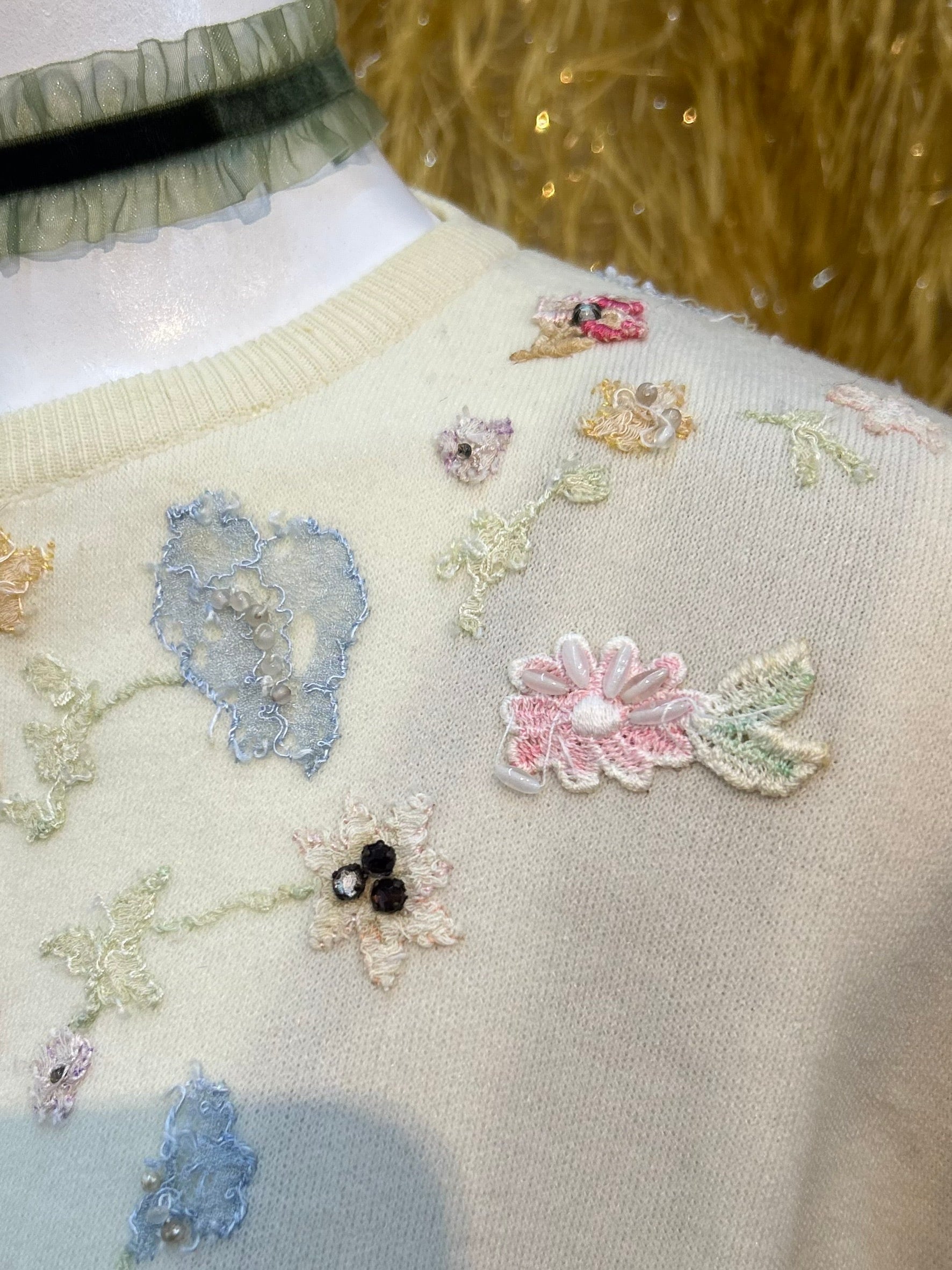 素材: Acrylic(表記なし) サイズ: 着丈35cm 肩幅45cm 身幅41cm 袖丈59cm ダメージ: 写真11〜19枚目の汚れ、生地のダメージ、20枚目の装飾の糸緩みがあります