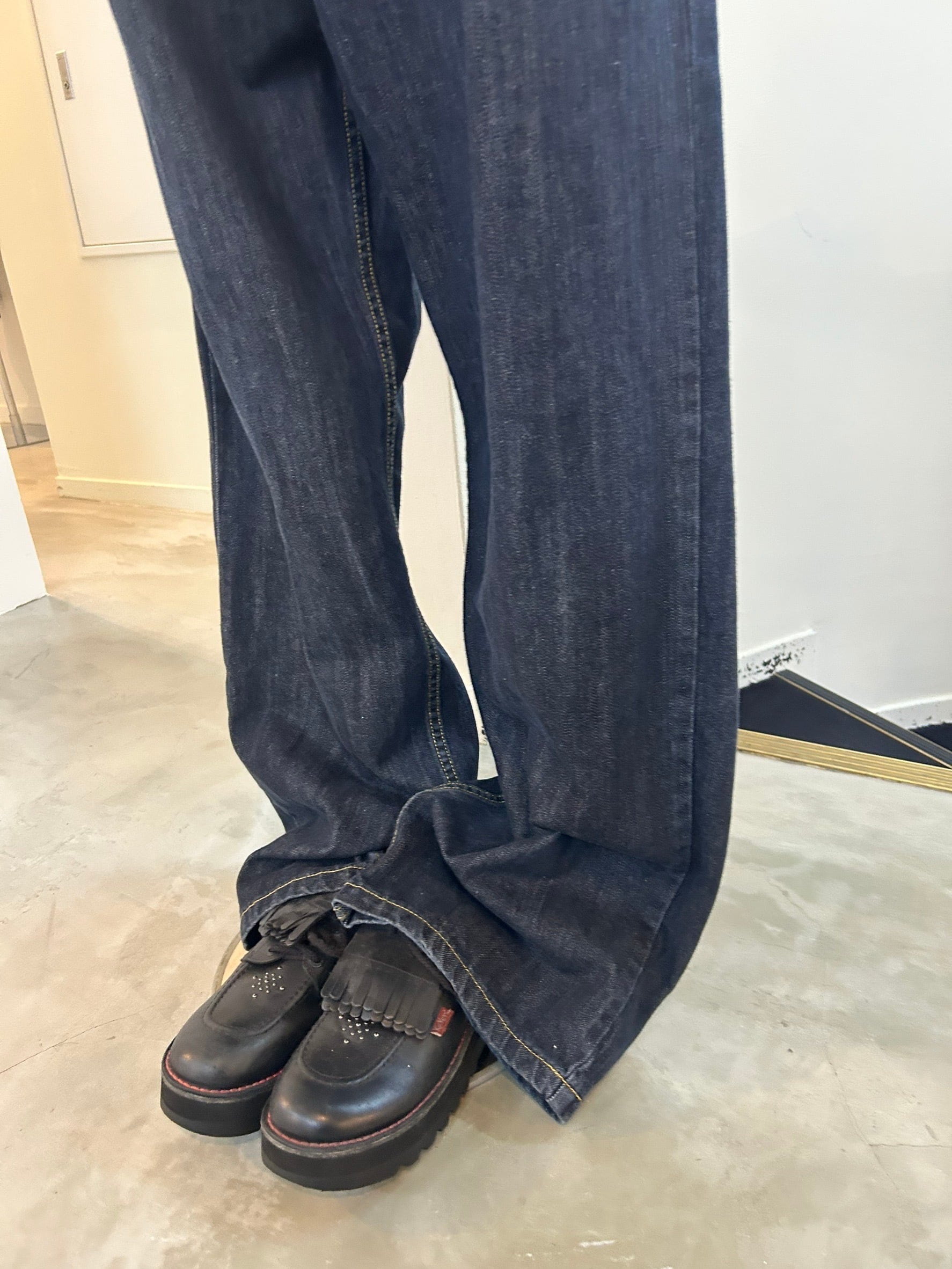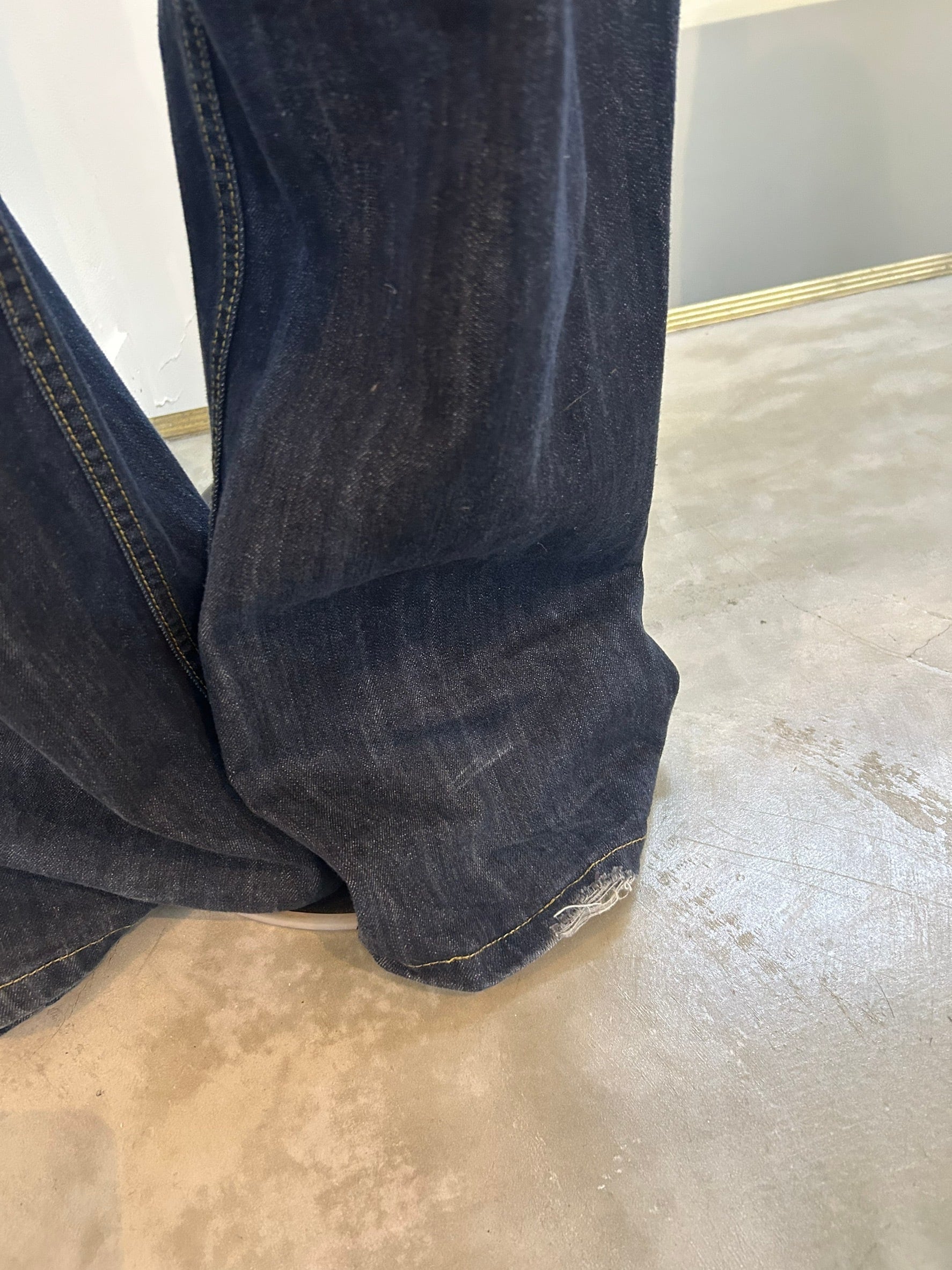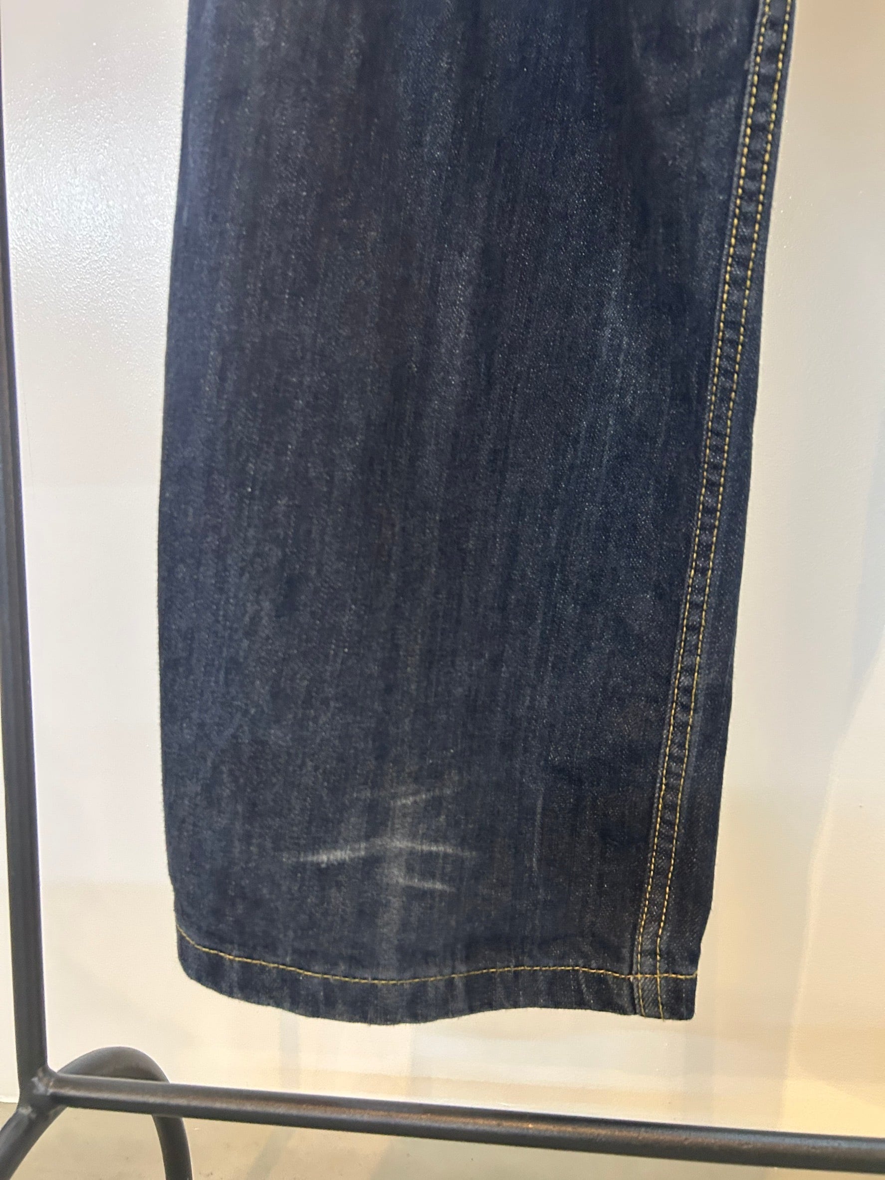 素材: Cotton サイズ: ウエスト幅43.5cm ヒップ幅55cm 股上36cm 股下79cm わたり幅35cm 裾幅26cm ダメージ: 写真18〜20枚目の汚れ、生地のダメージがあります