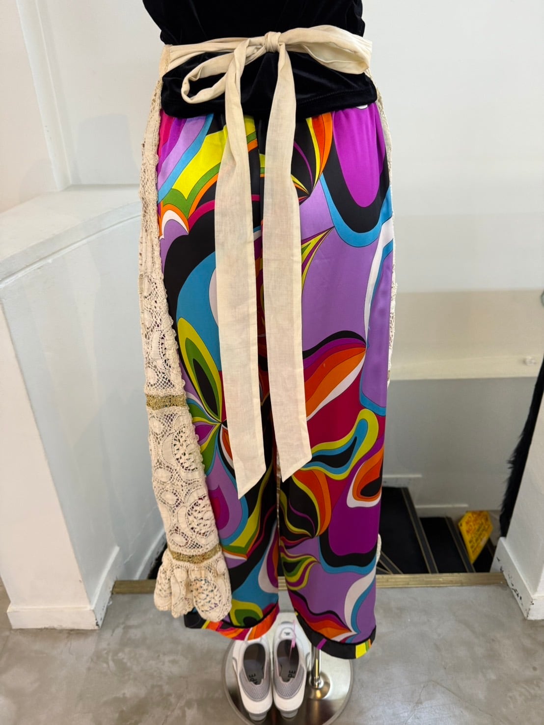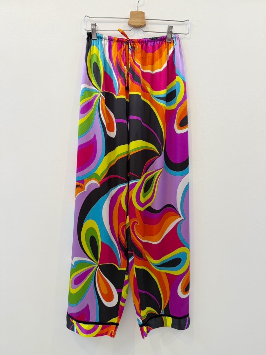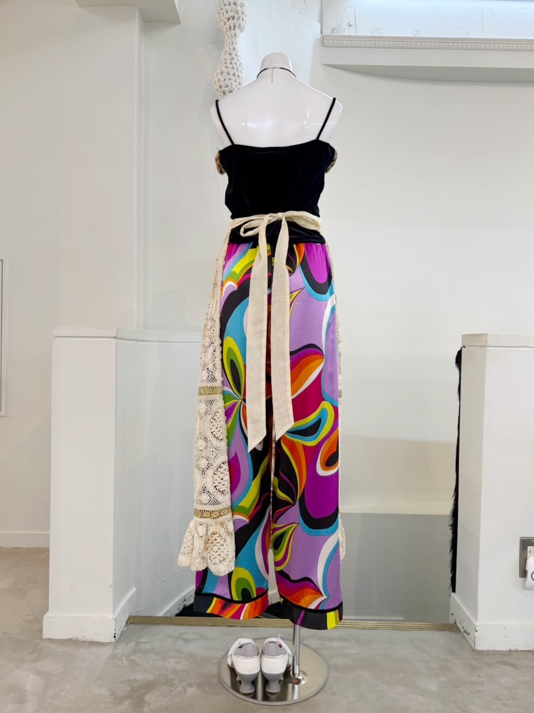 素材: 100%Polyester サイズ: XS(表記) ウエスト幅29cm 股上32cm 股下71cm わたり幅33cm 裾幅23.5cm ダメージ: 写真12〜15枚目のような短い電線や小さな凹みがあります。