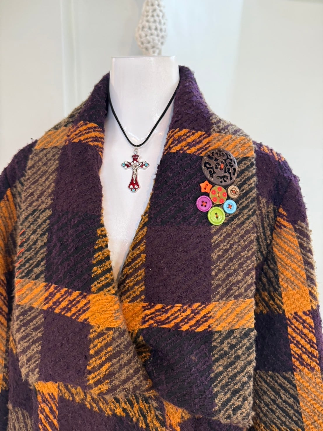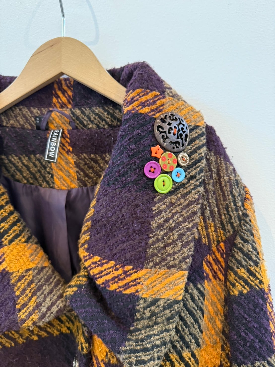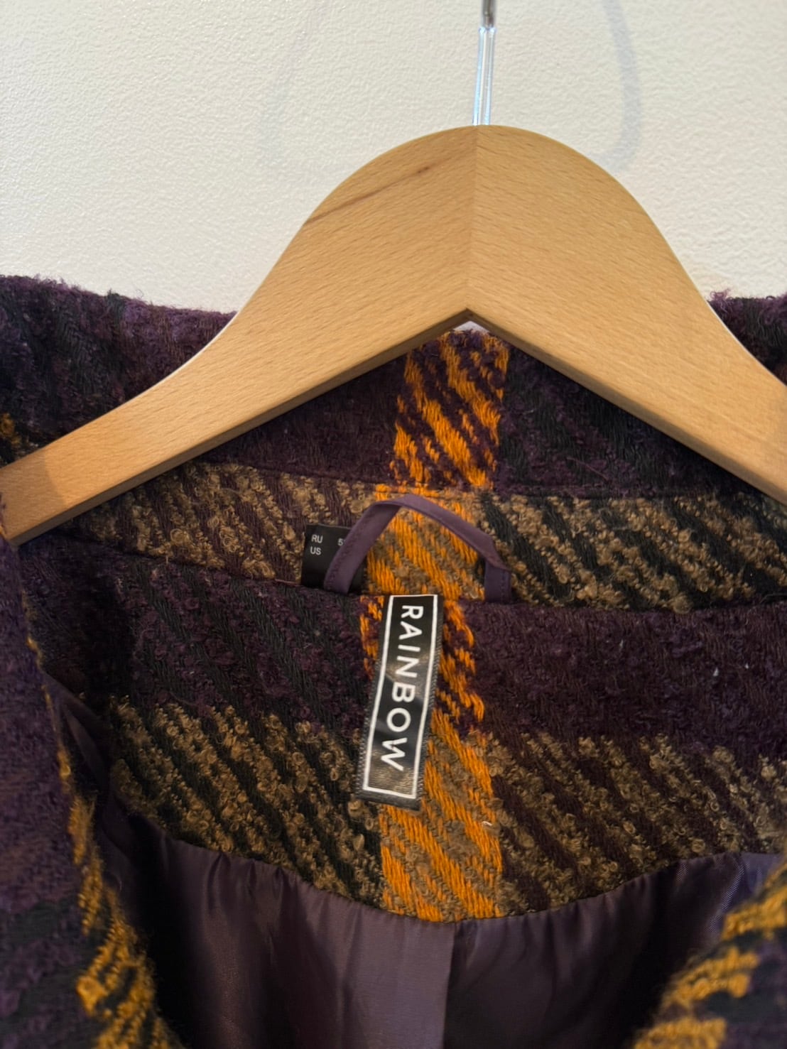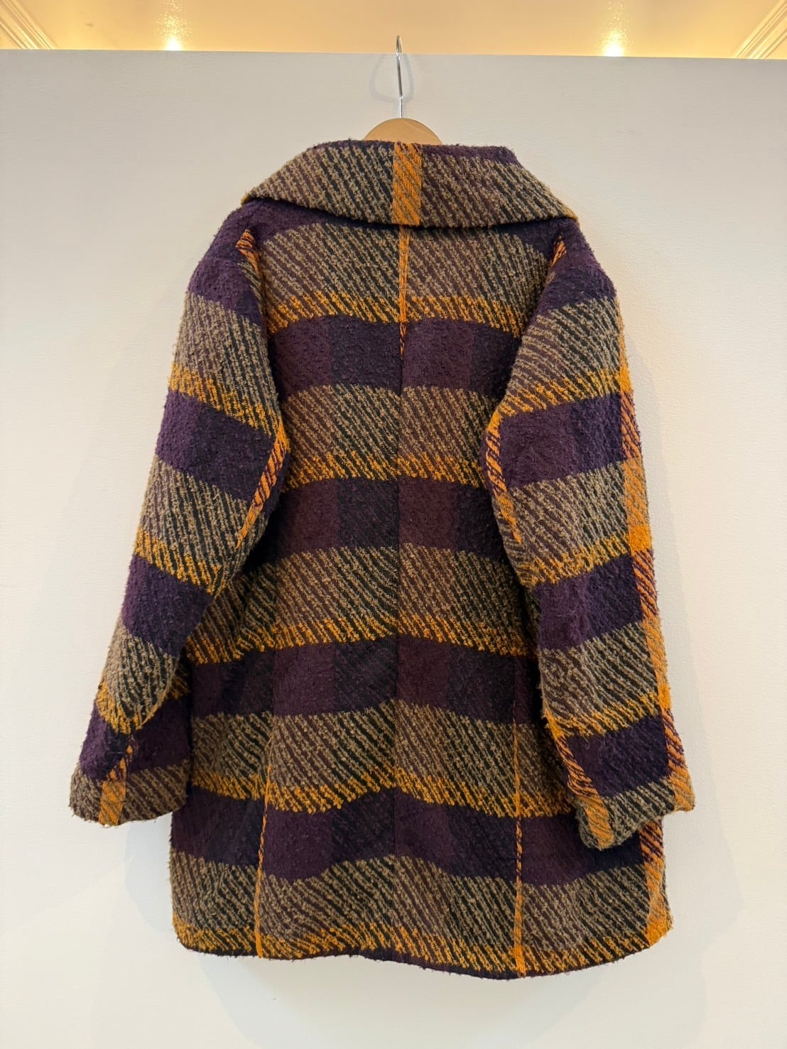 素材: 95%Polyester 5%Wool サイズ: 肩幅41cm 袖丈65cm 身幅60cm 身丈87cm 衿幅18cm(最大) ダメージ: 写真16枚目のような全体的に毛羽立ちがあります。
