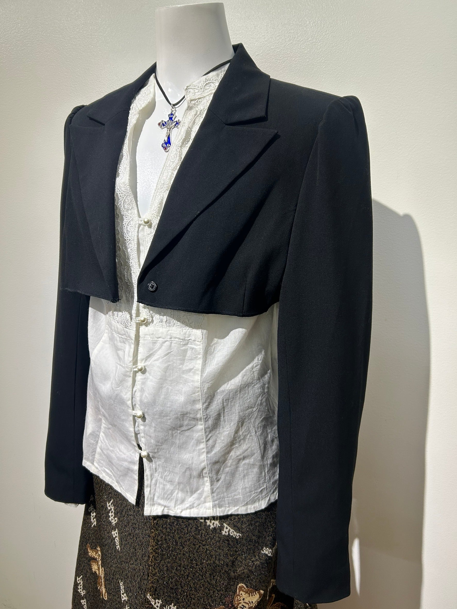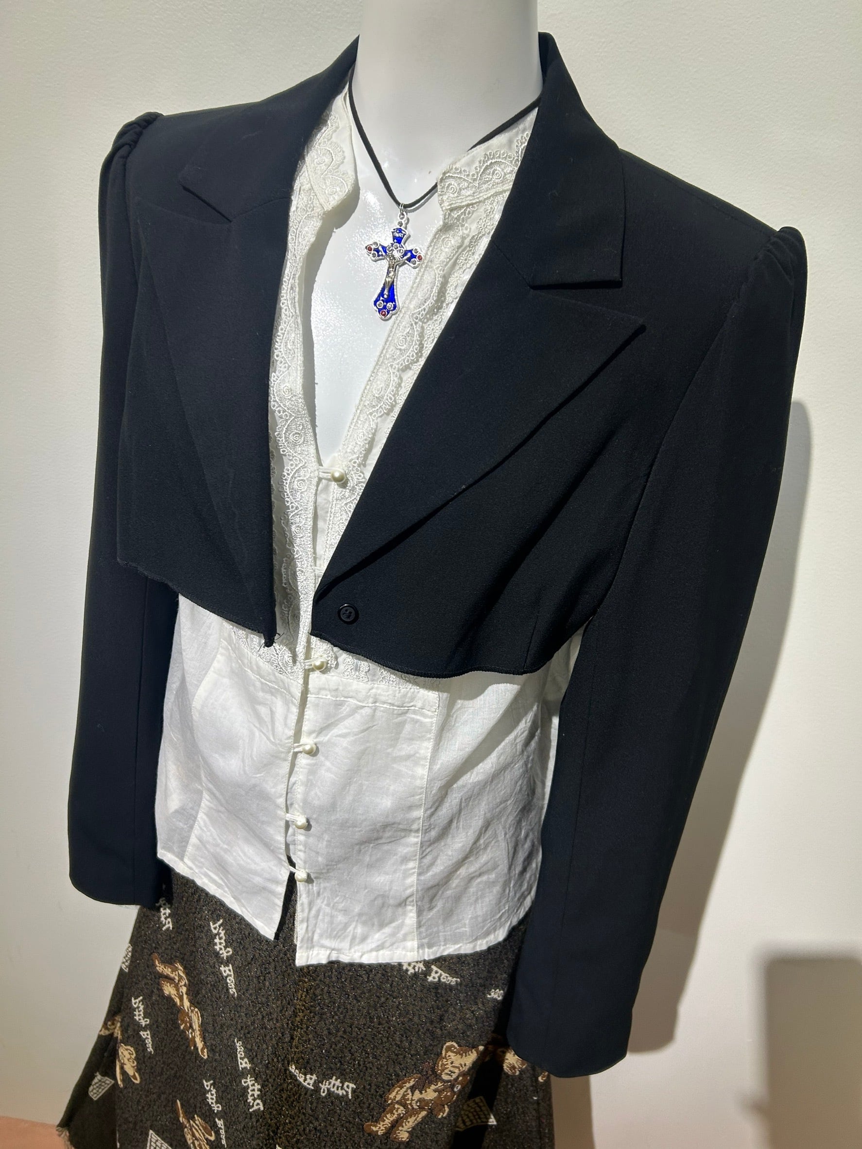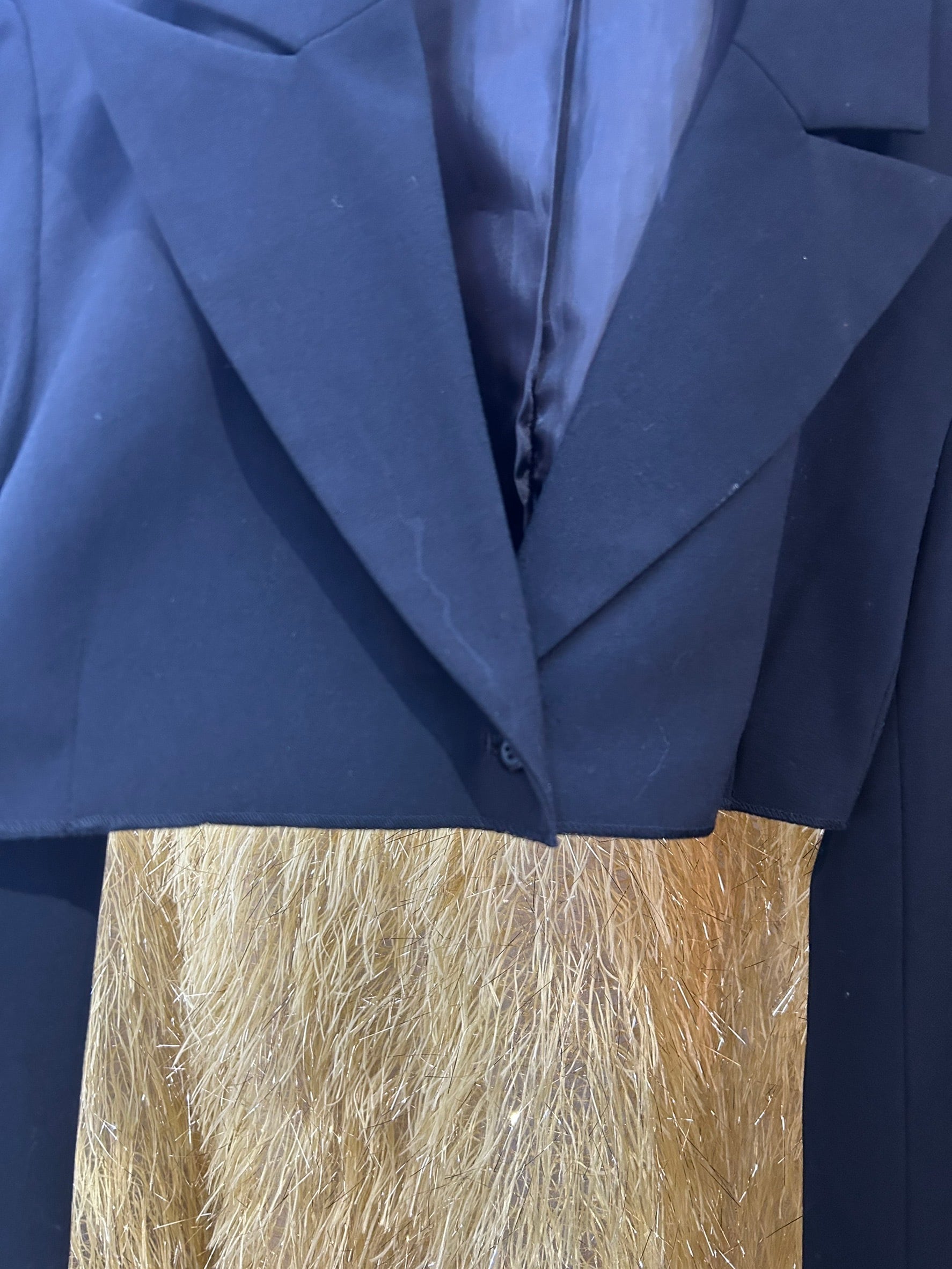 素材: 79%Polyester 15%Rayon 6%Spandex サイズ: 着丈33cm 肩幅38cm 身幅44cm 袖丈64cm ダメージ: 写真12〜16枚目のシミ、生地のダメージがあります