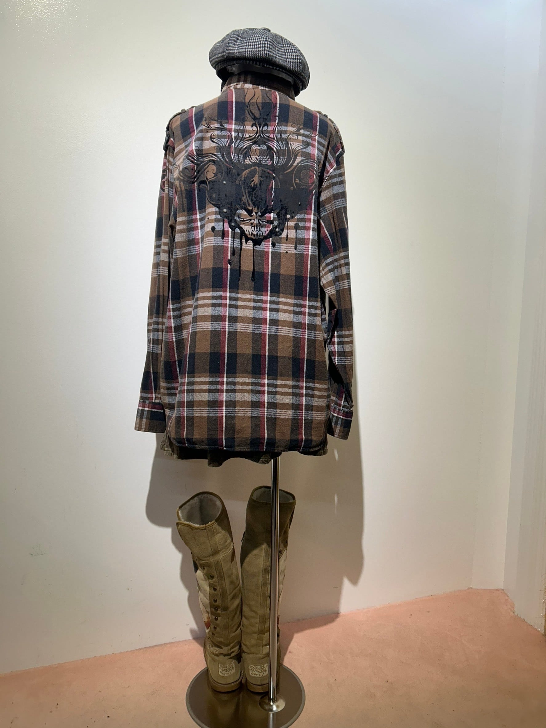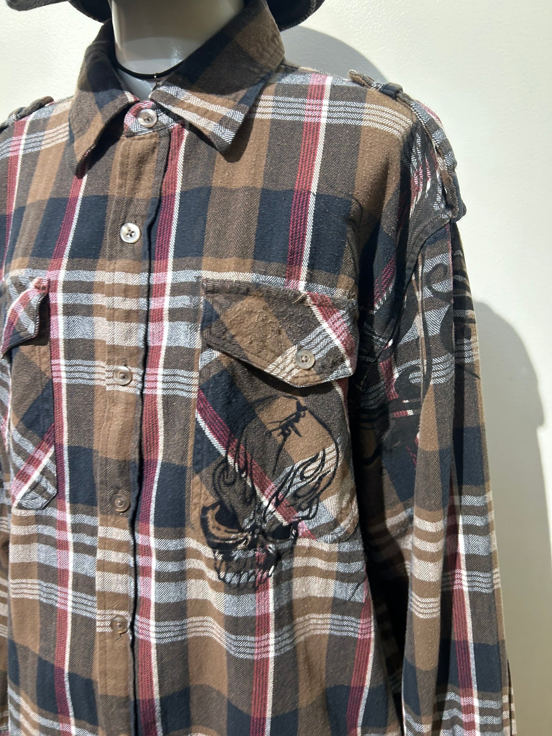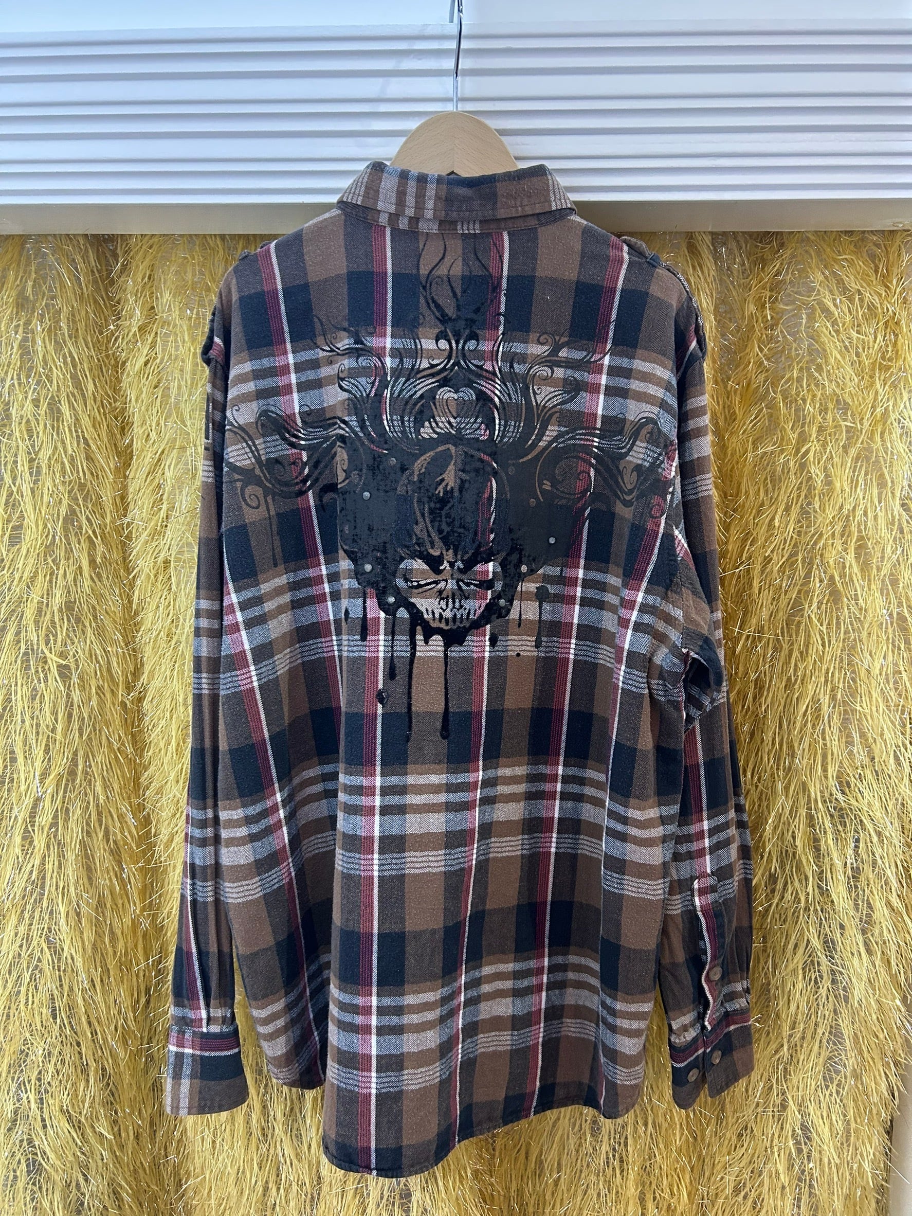 素材: 100%Cotton サイズ: XL(表記) 着丈78cm 肩幅49.5cm 身幅61cm 袖丈65cm ダメージ: 写真15枚目のような毛羽立ち。16〜18枚目の塗装の剥がれ、ストーンの取れている箇所があります。