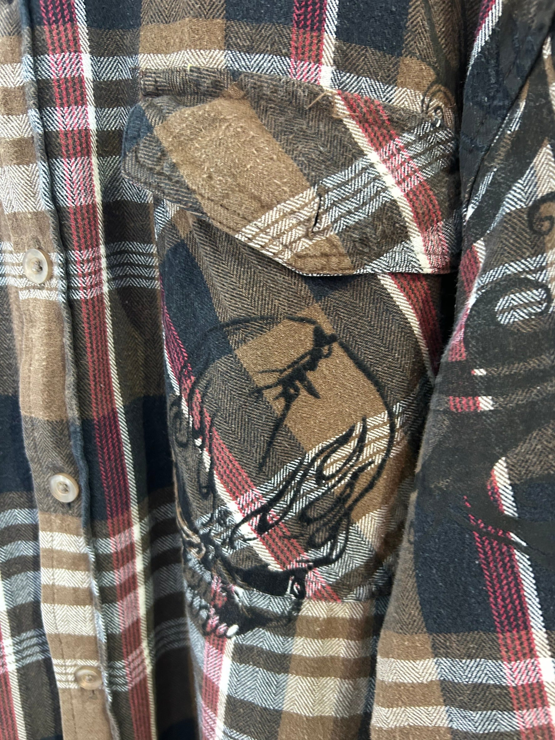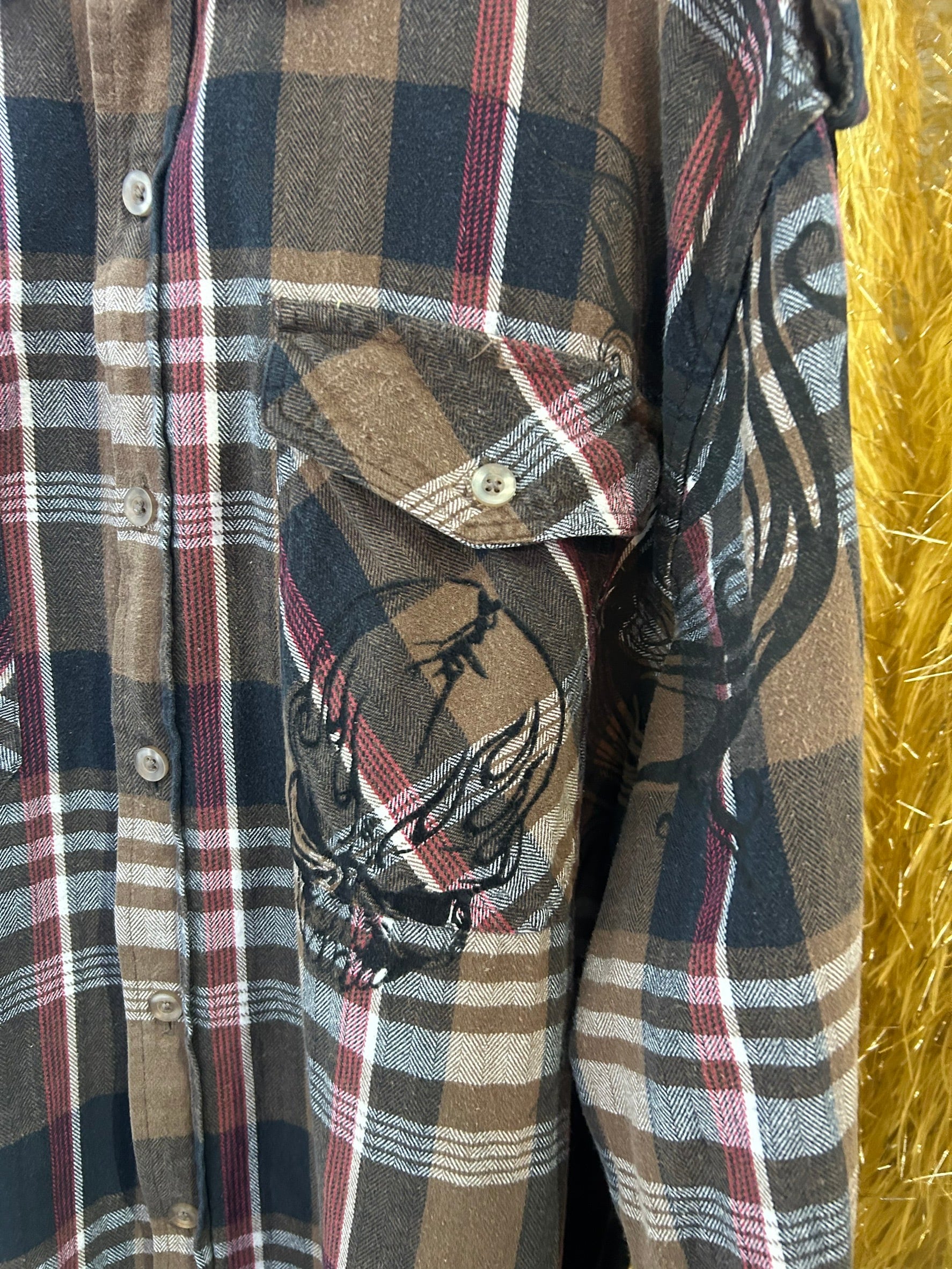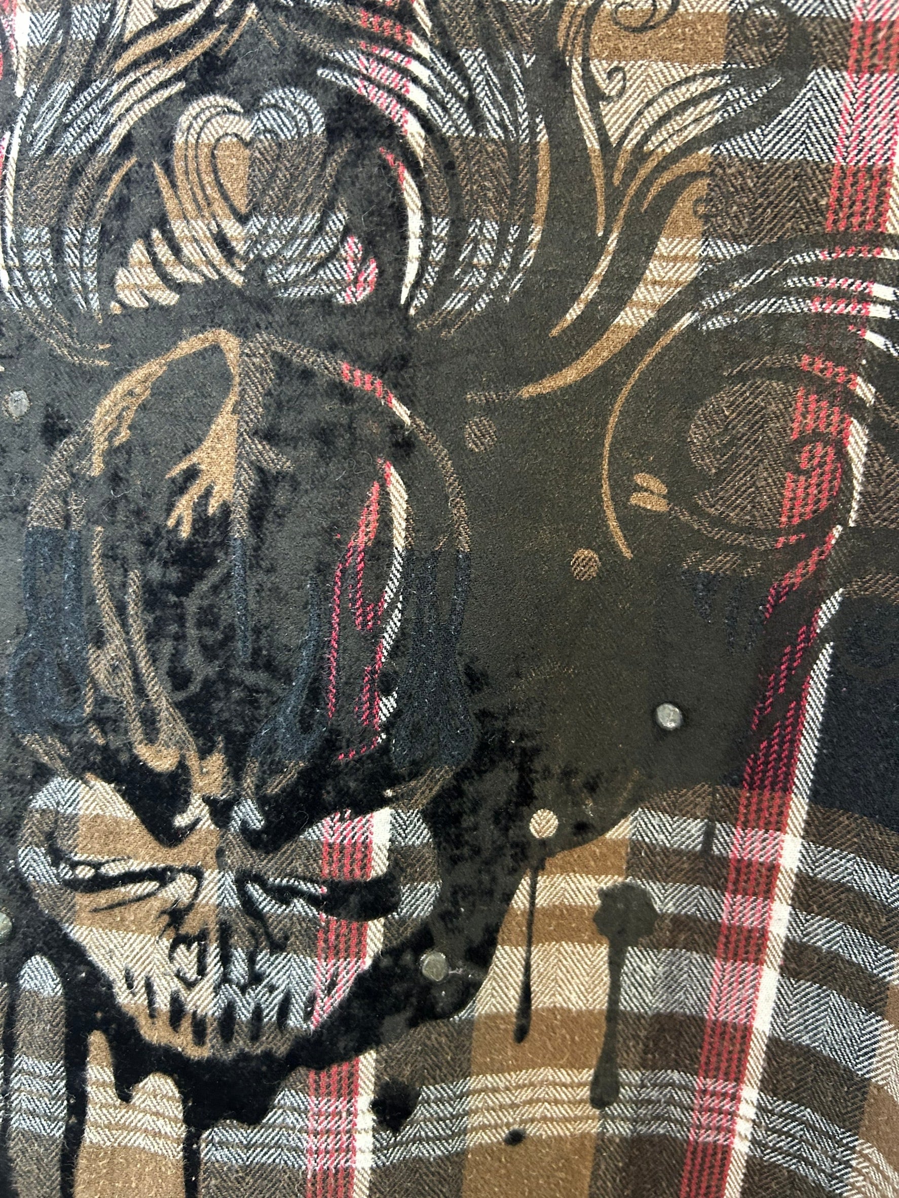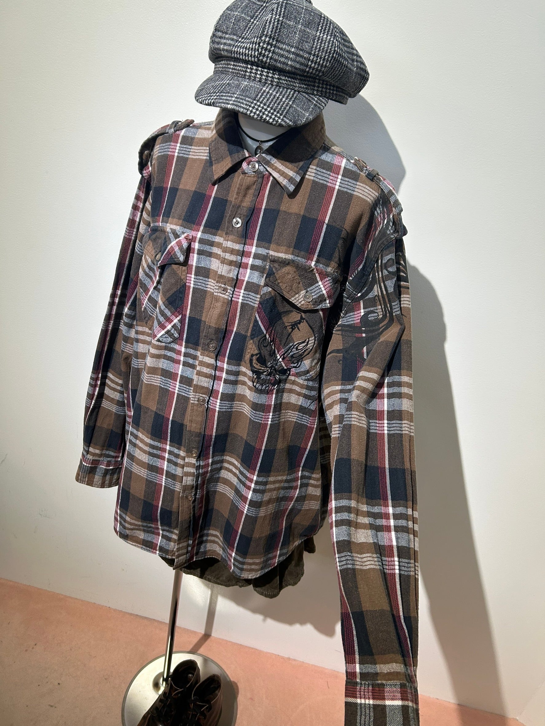 素材: 100%Cotton サイズ: XL(表記) 着丈78cm 肩幅49.5cm 身幅61cm 袖丈65cm ダメージ: 写真15枚目のような毛羽立ち。16〜18枚目の塗装の剥がれ、ストーンの取れている箇所があります。