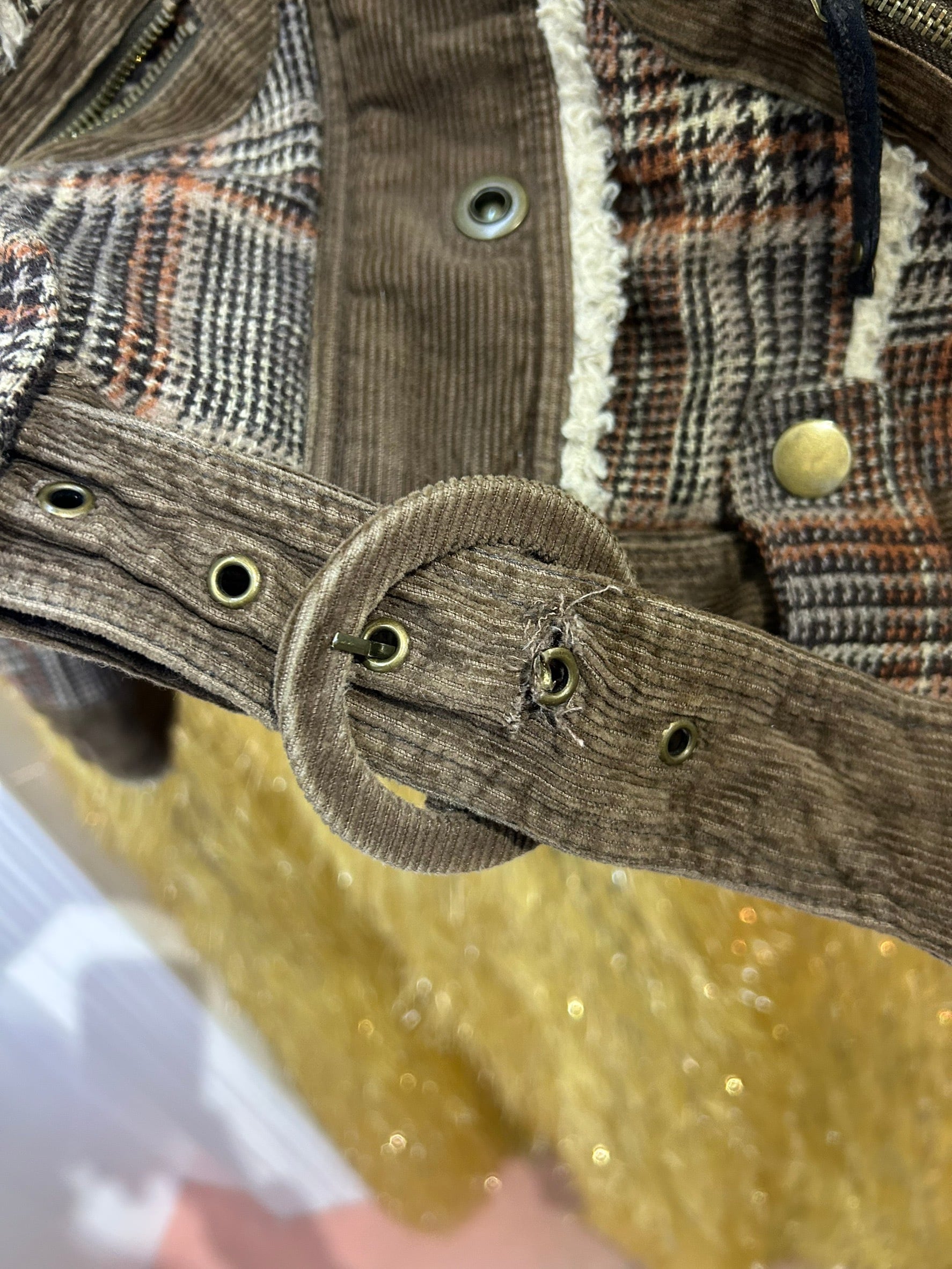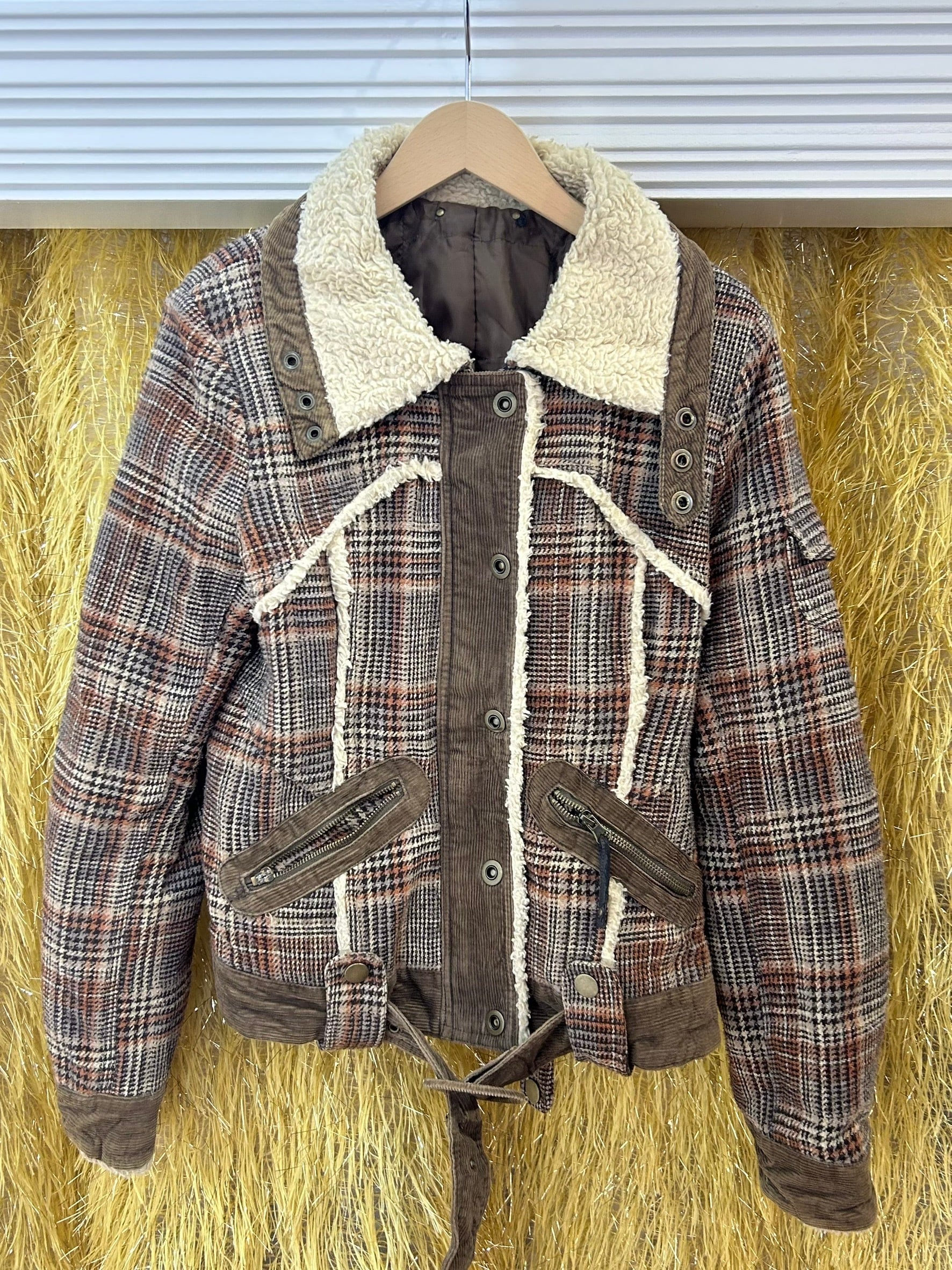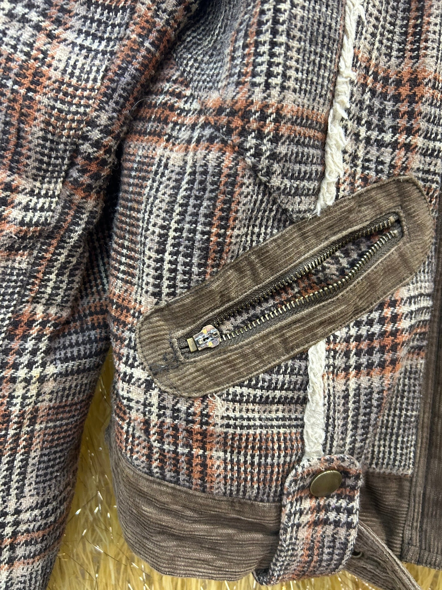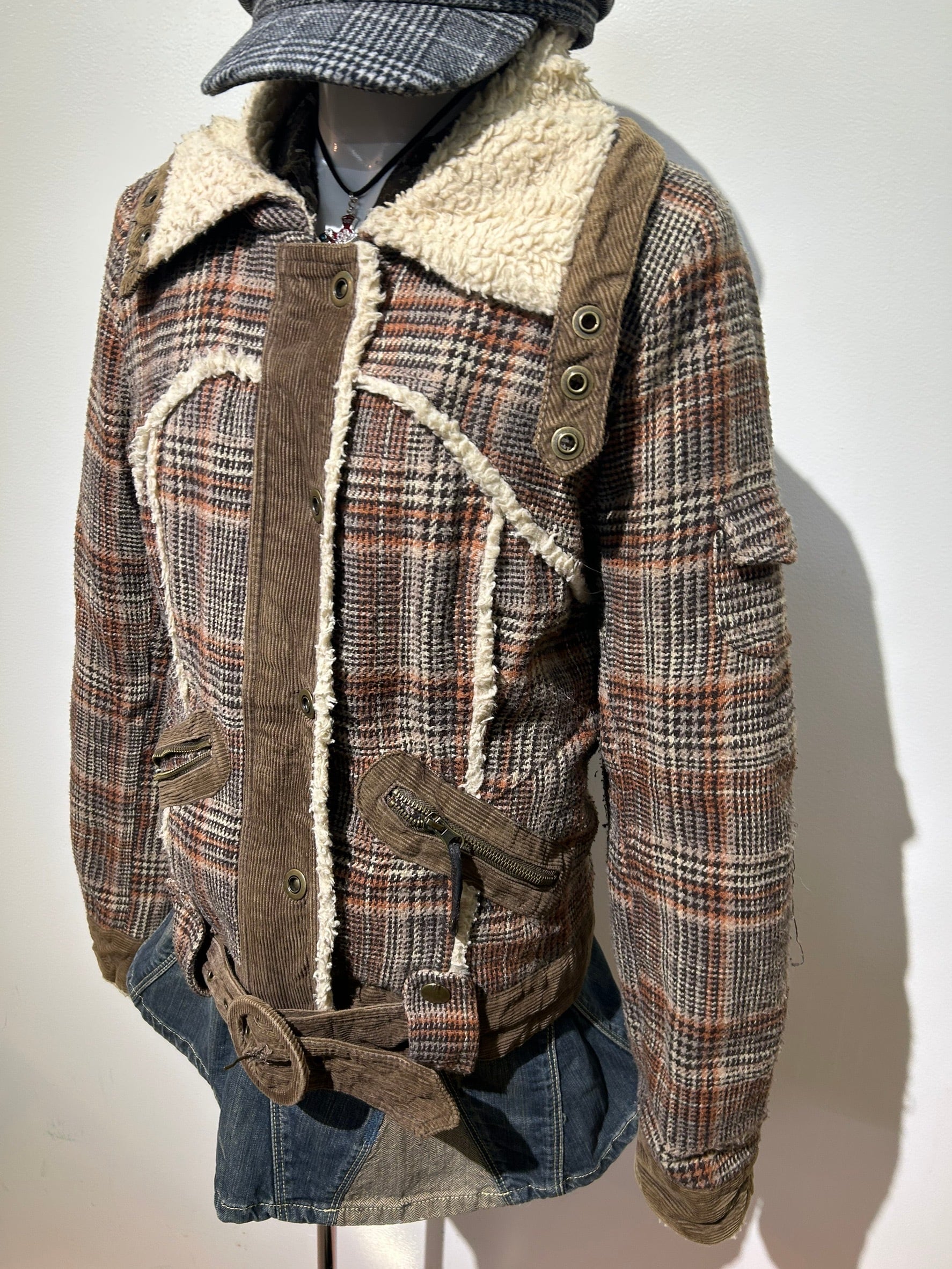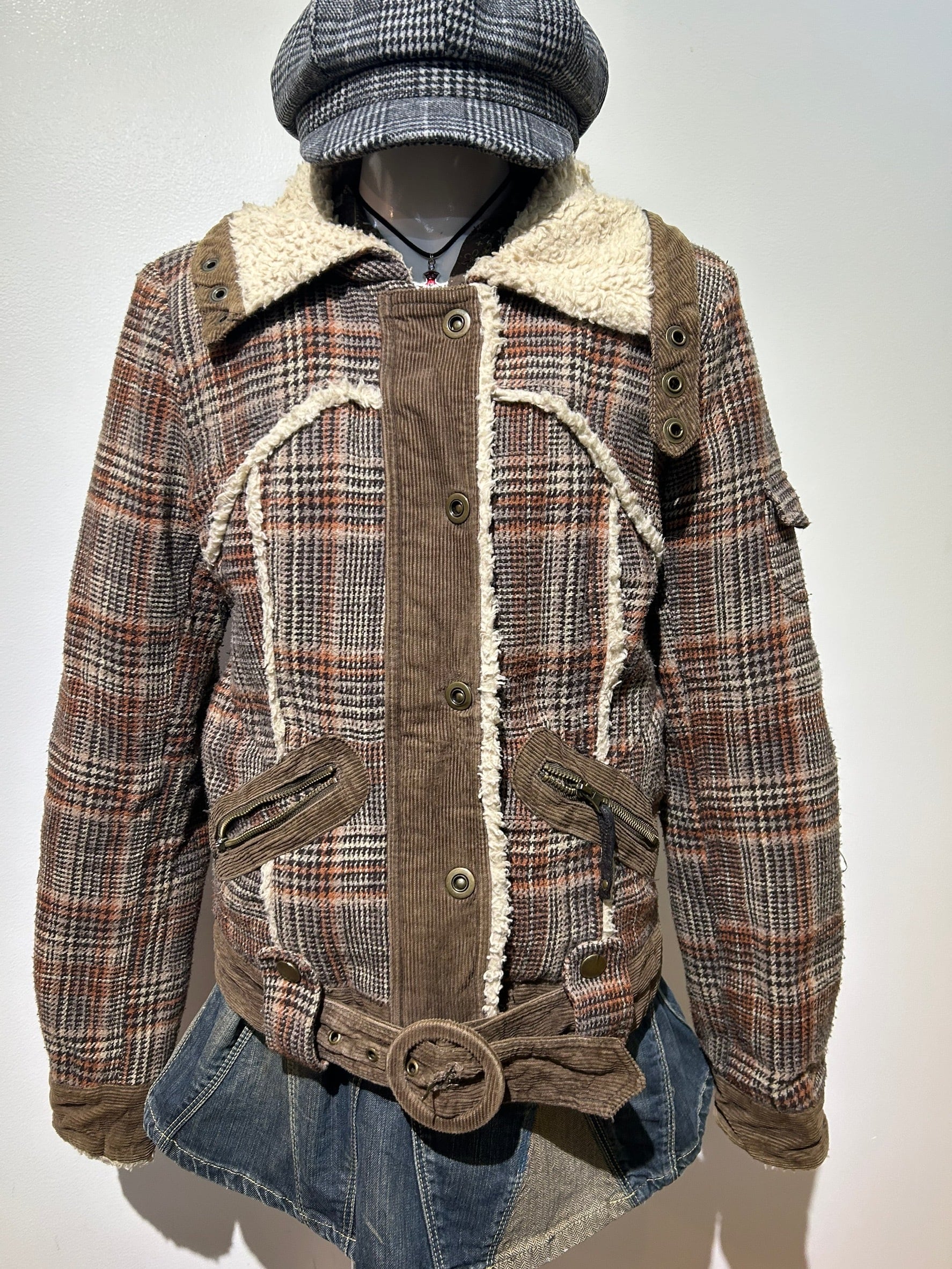 素材: 30%Wool 40%Polyester 30%Viscose サイズ: M(表記) 着丈55cm 肩幅42cm 身幅44cm 袖丈66cm ダメージ: 写真19枚目のファスナー欠損、20枚目のベルト穴ダメージがあります