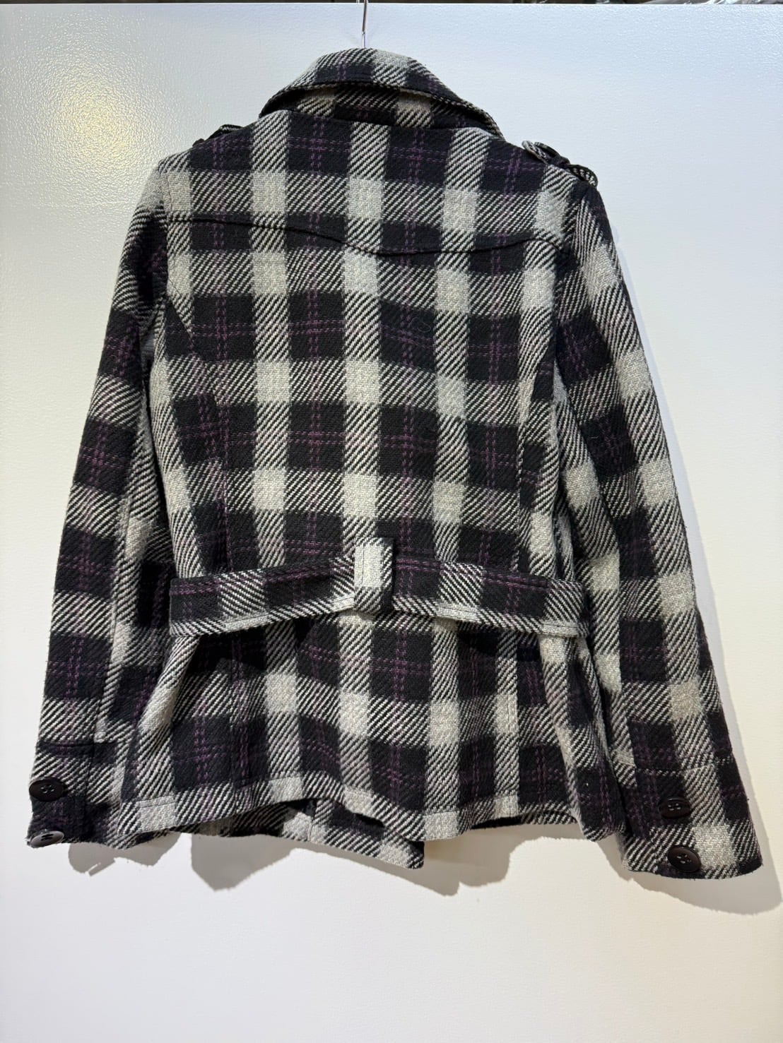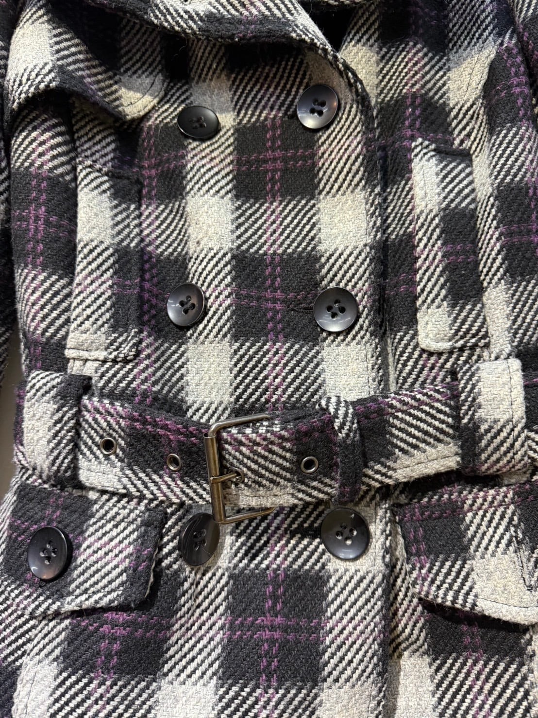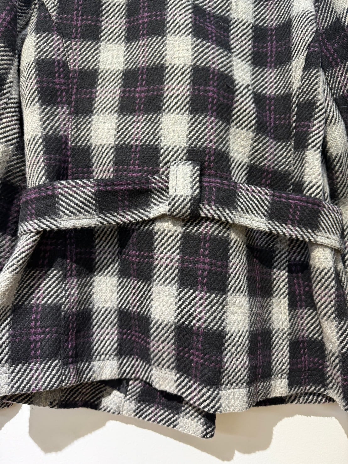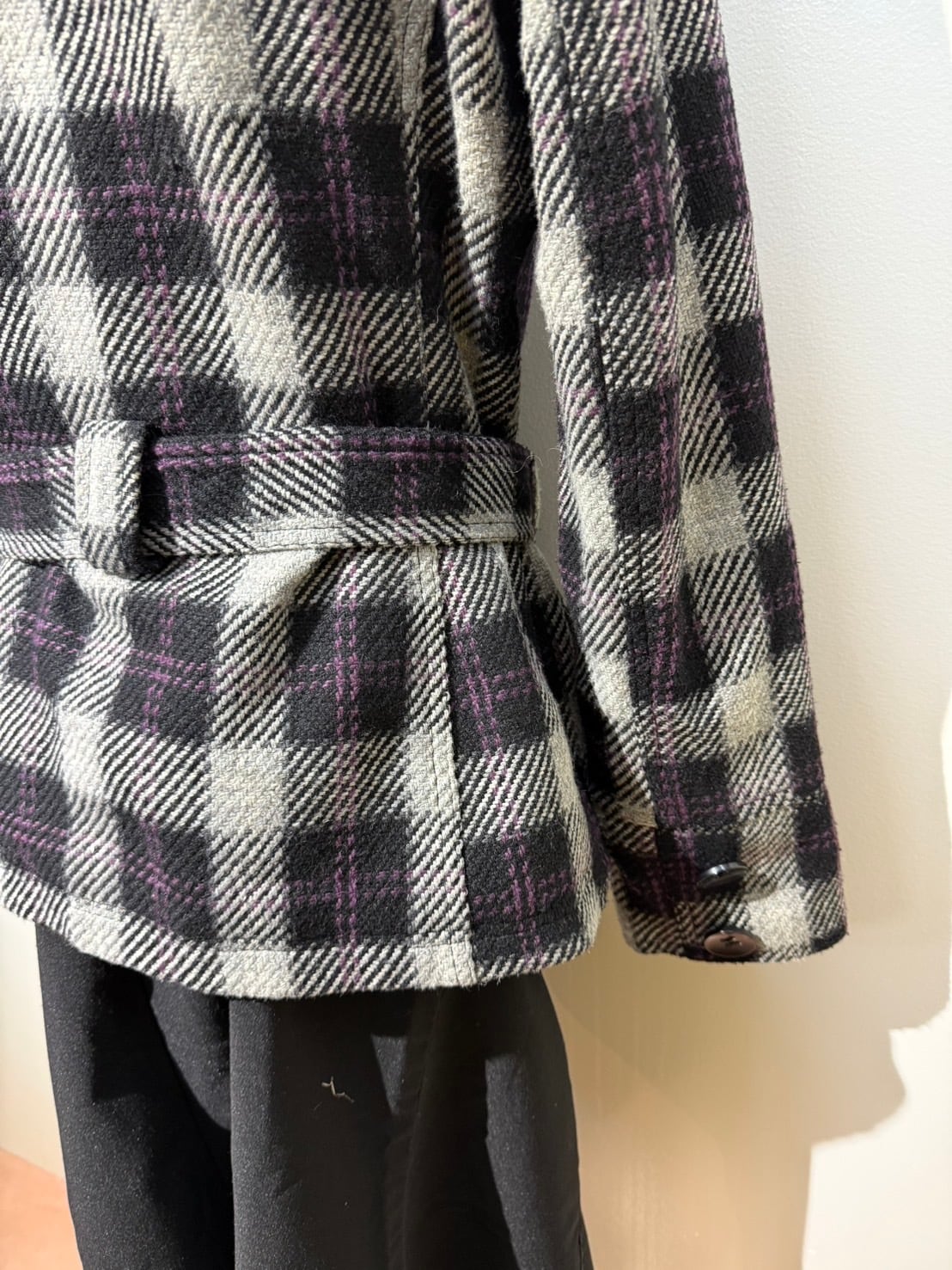 素材: 50%Polyester 33%Acrylic 10%Wool 3%Polyamide サイズ: 肩幅41cm 袖丈60.5cm 身幅61.5cm 身丈64cm 襟幅26cm ベルト全長106cm ダメージ: 写真20枚目のような糸のほつれが背中側にあります。