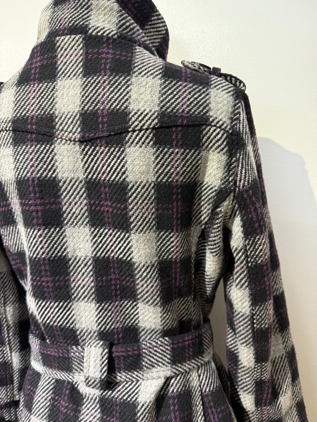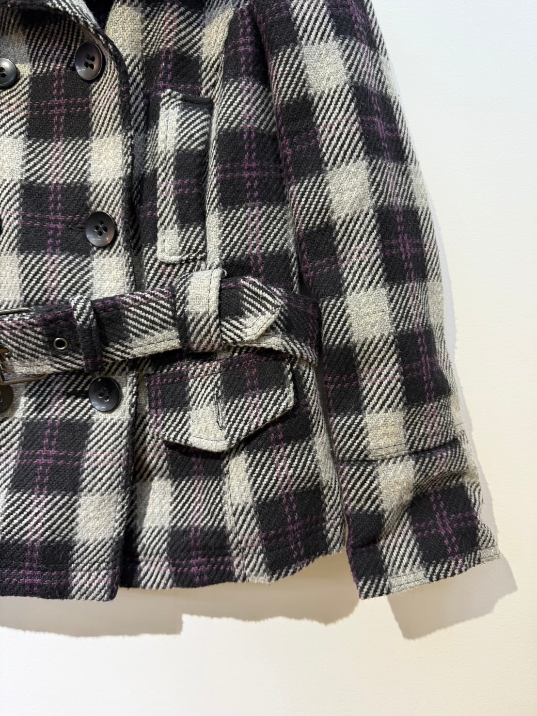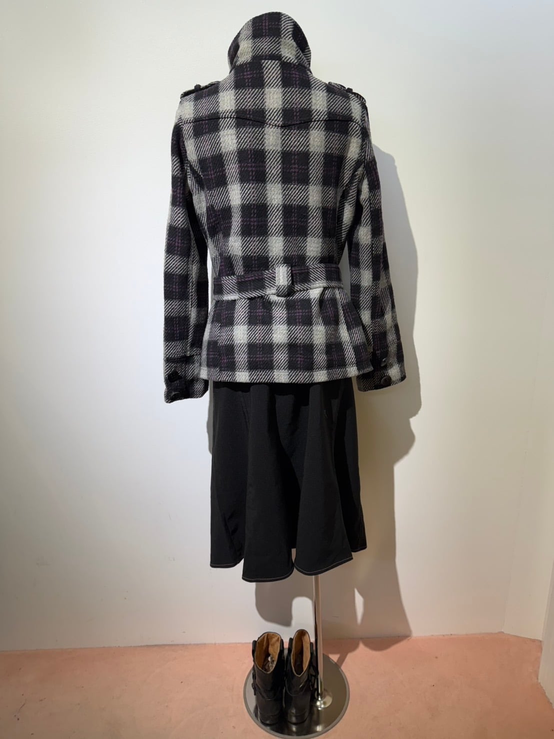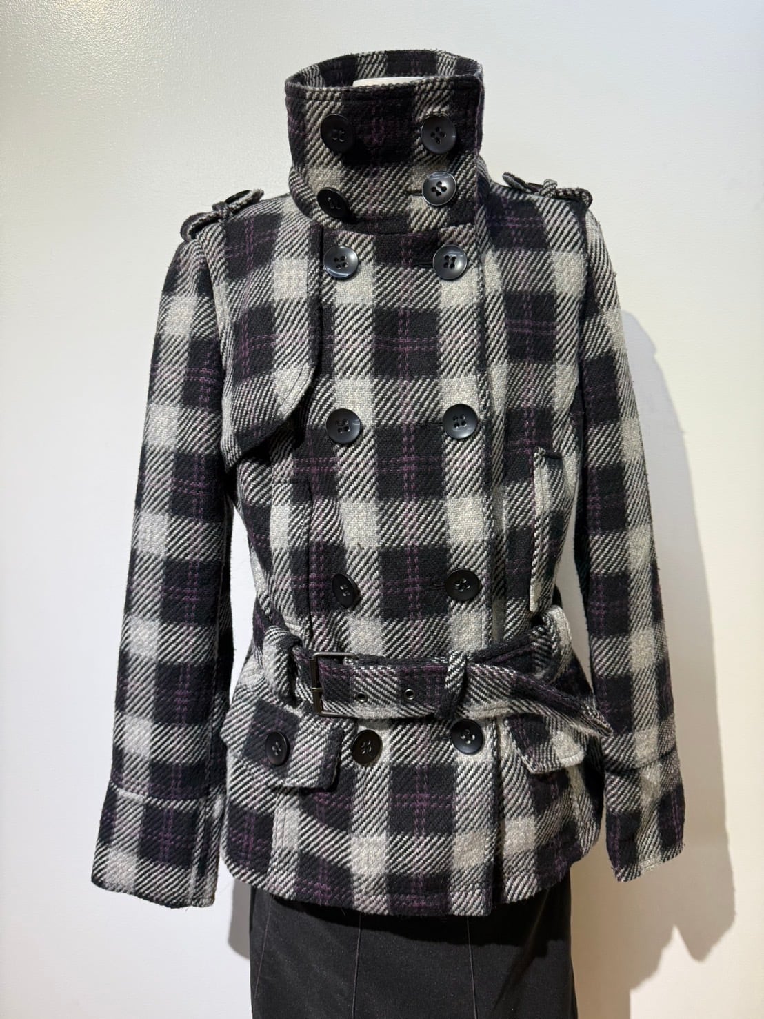 素材: 50%Polyester 33%Acrylic 10%Wool 3%Polyamide サイズ: 肩幅41cm 袖丈60.5cm 身幅61.5cm 身丈64cm 襟幅26cm ベルト全長106cm ダメージ: 写真20枚目のような糸のほつれが背中側にあります。