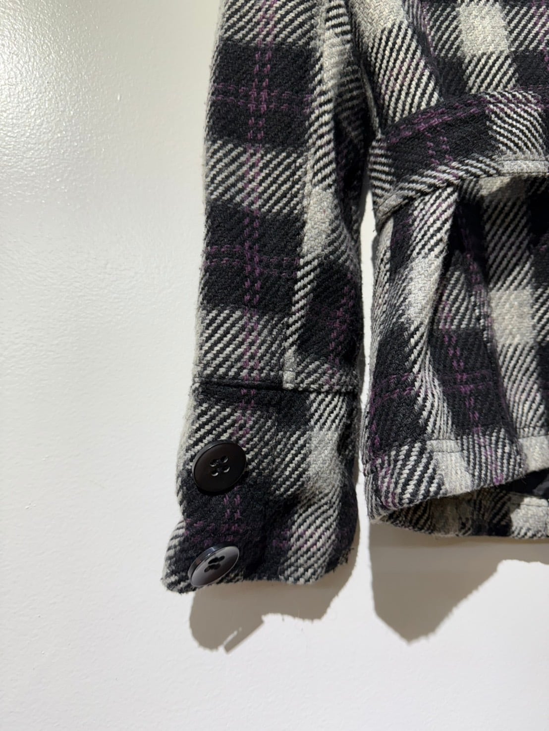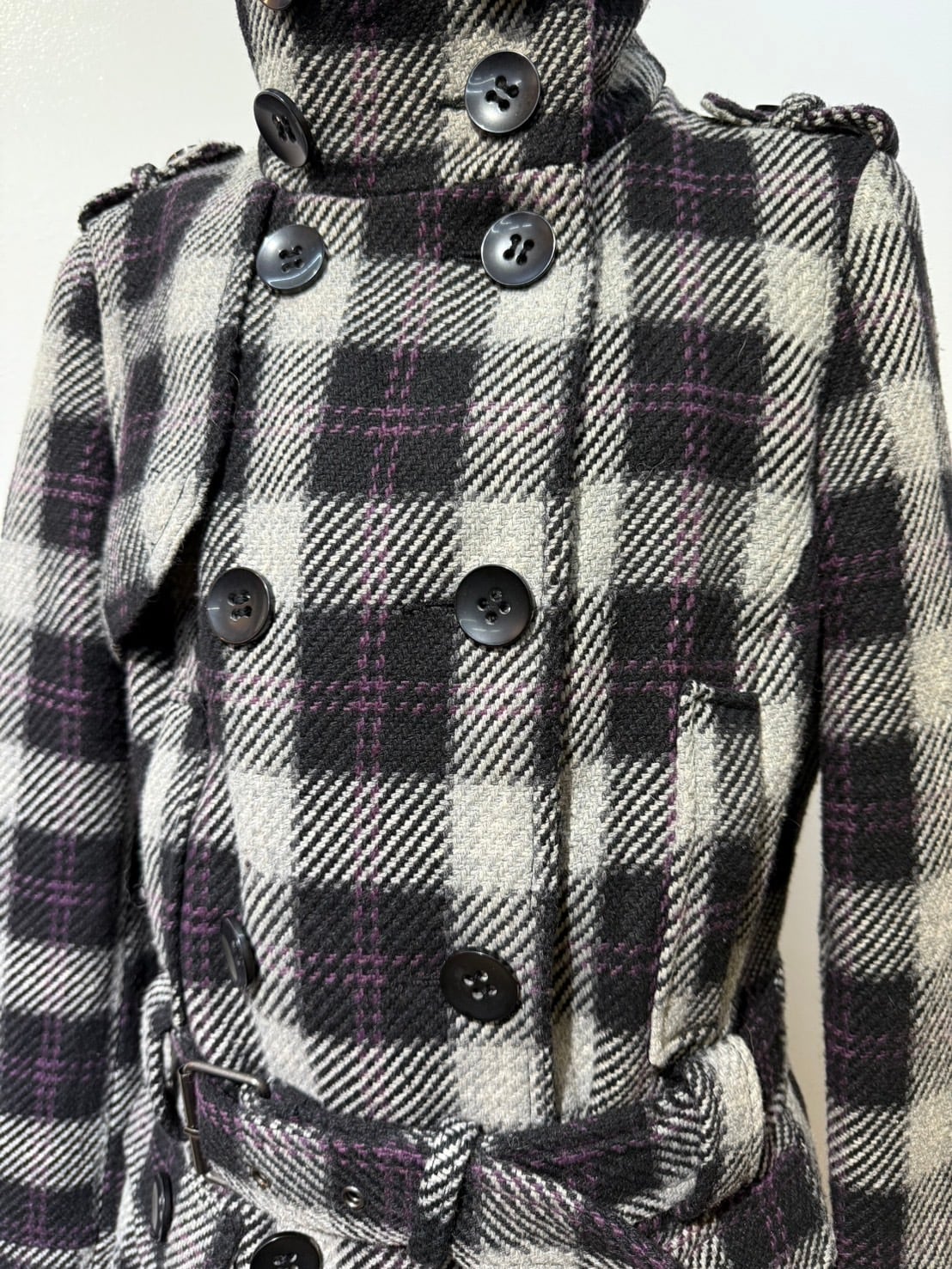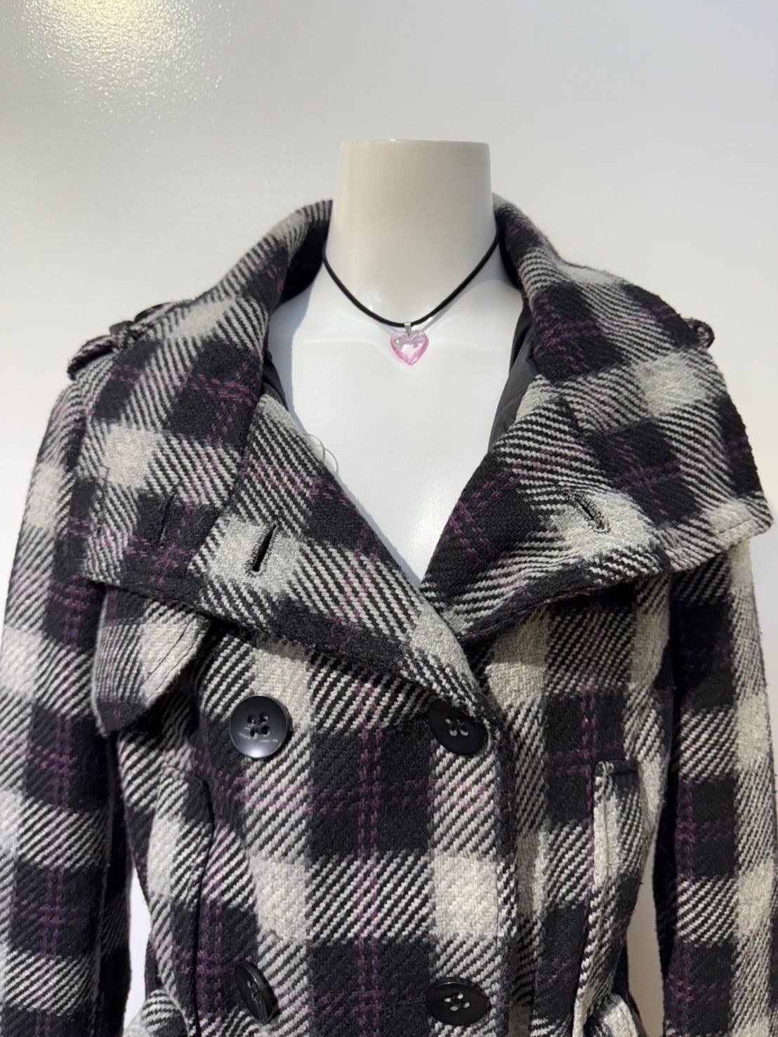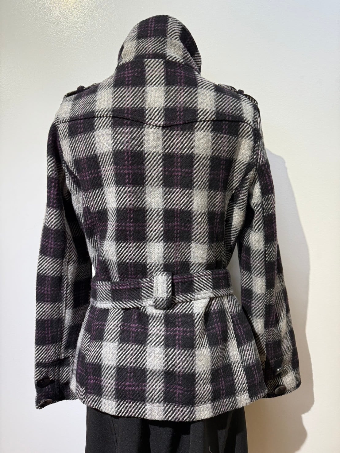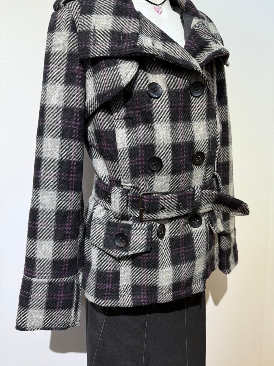 素材: 50%Polyester 33%Acrylic 10%Wool 3%Polyamide サイズ: 肩幅41cm 袖丈60.5cm 身幅61.5cm 身丈64cm 襟幅26cm ベルト全長106cm ダメージ: 写真20枚目のような糸のほつれが背中側にあります。