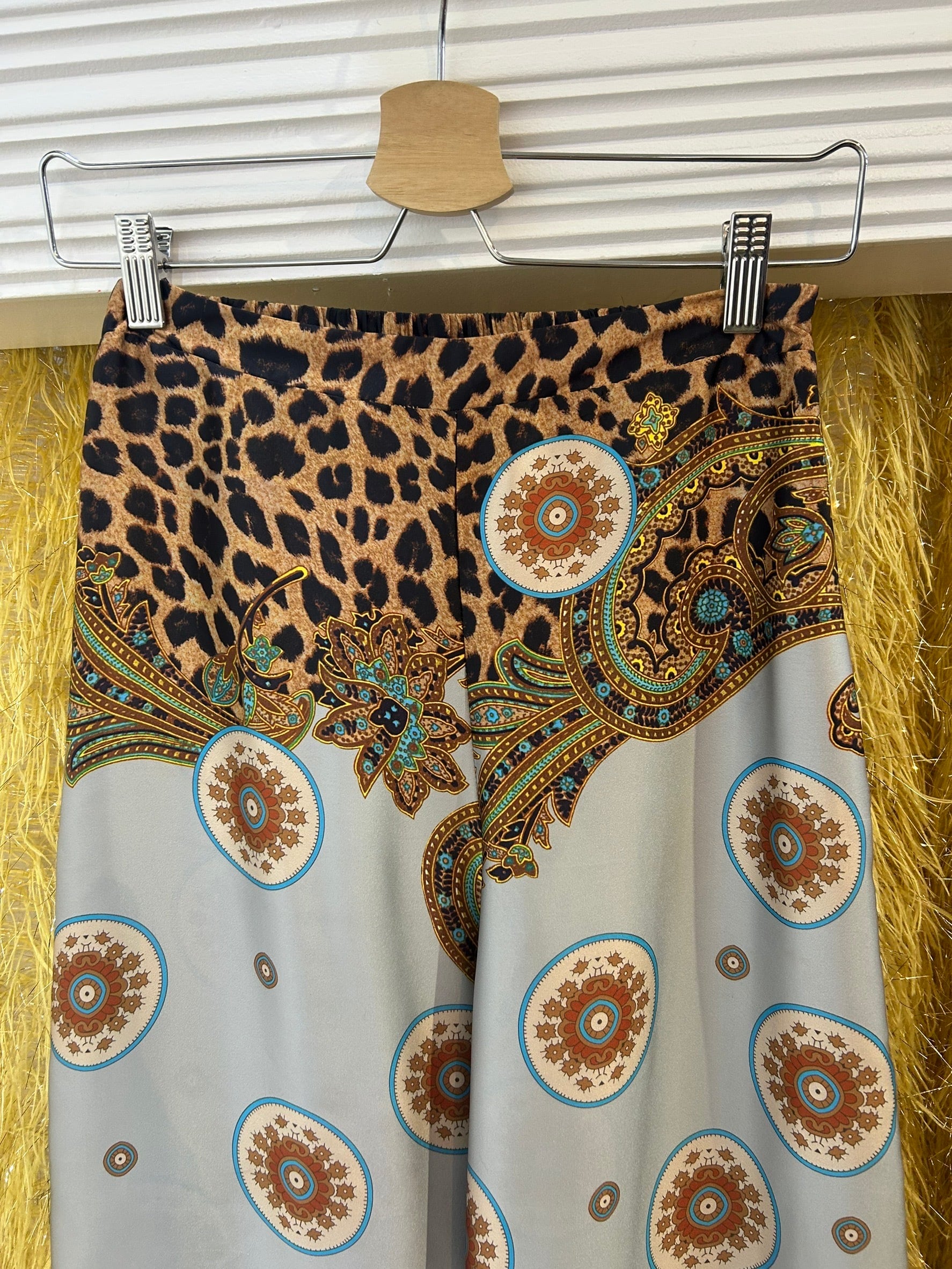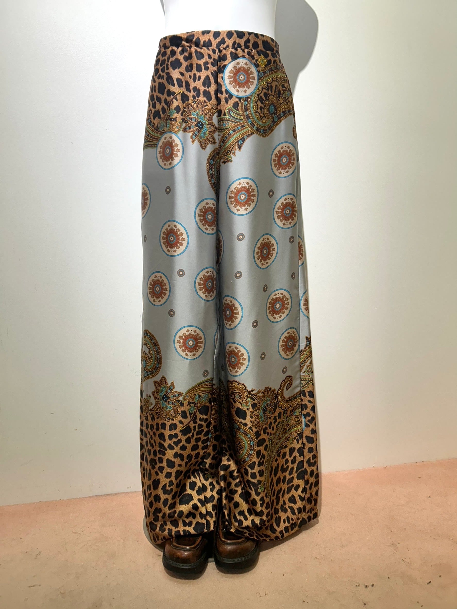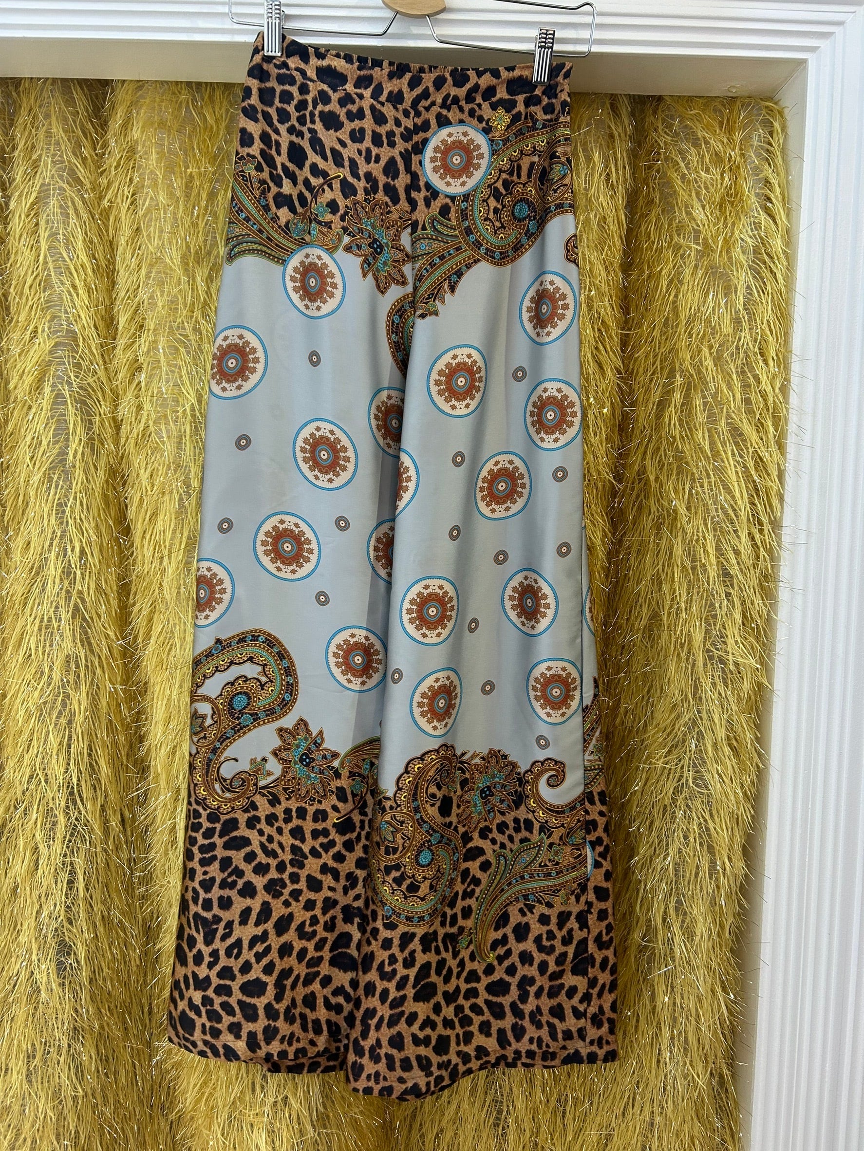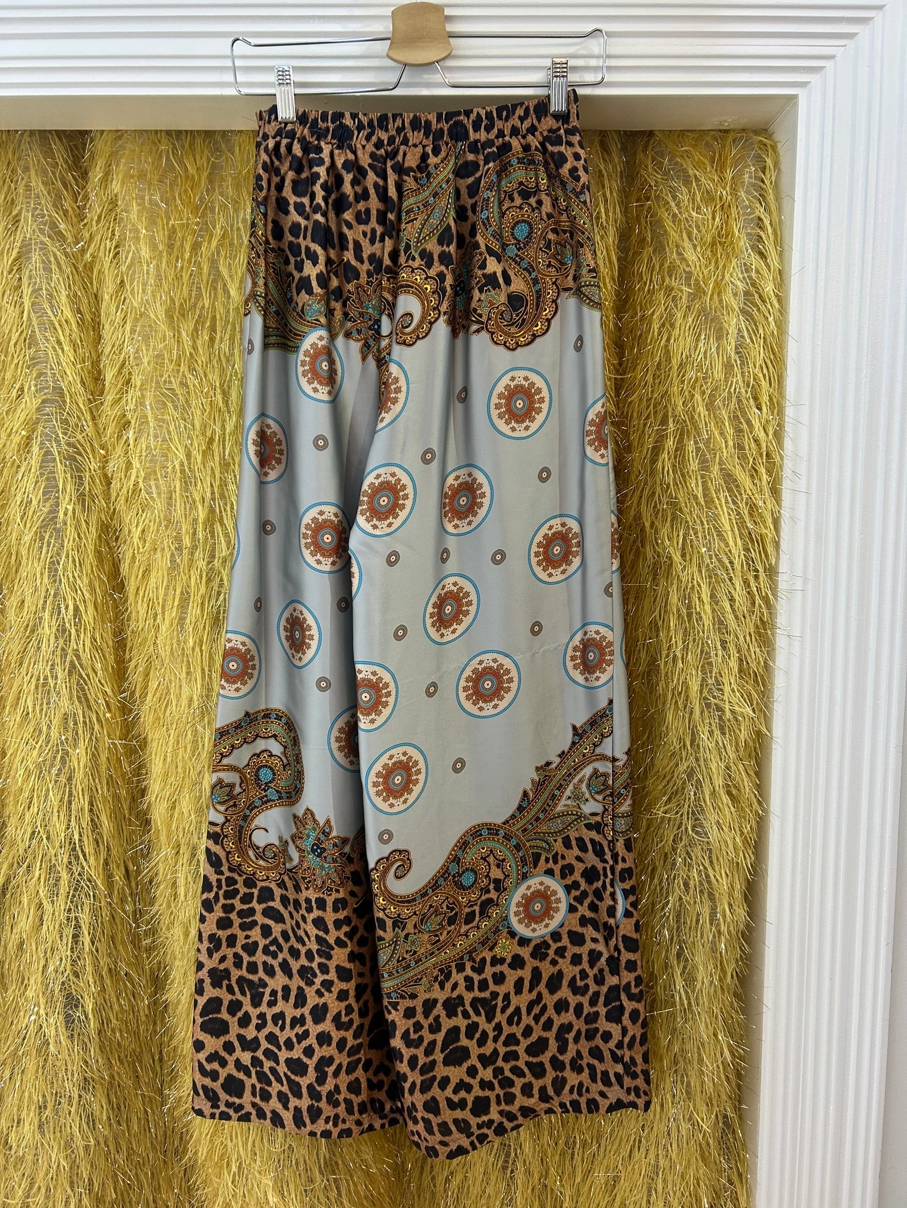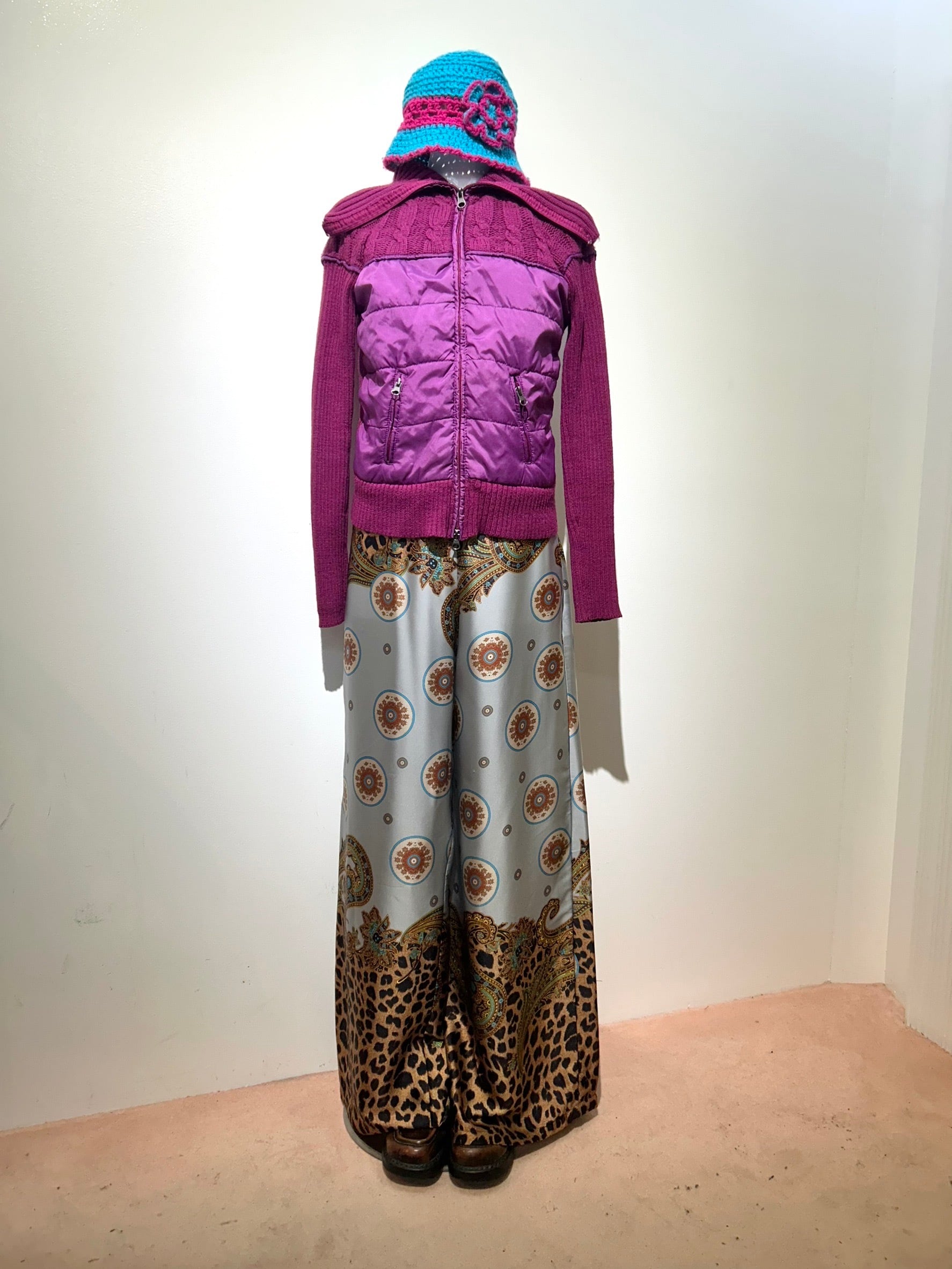 素材: 100%Polyester サイズ: S(表記) ウエスト幅32cm(後ろがゴムになっています) ヒップ幅44cm 股上35cm 股下73cm わたり幅33cm 裾幅32.5cm ダメージ: 写真17.18枚目のひきつれのダメージがあります
