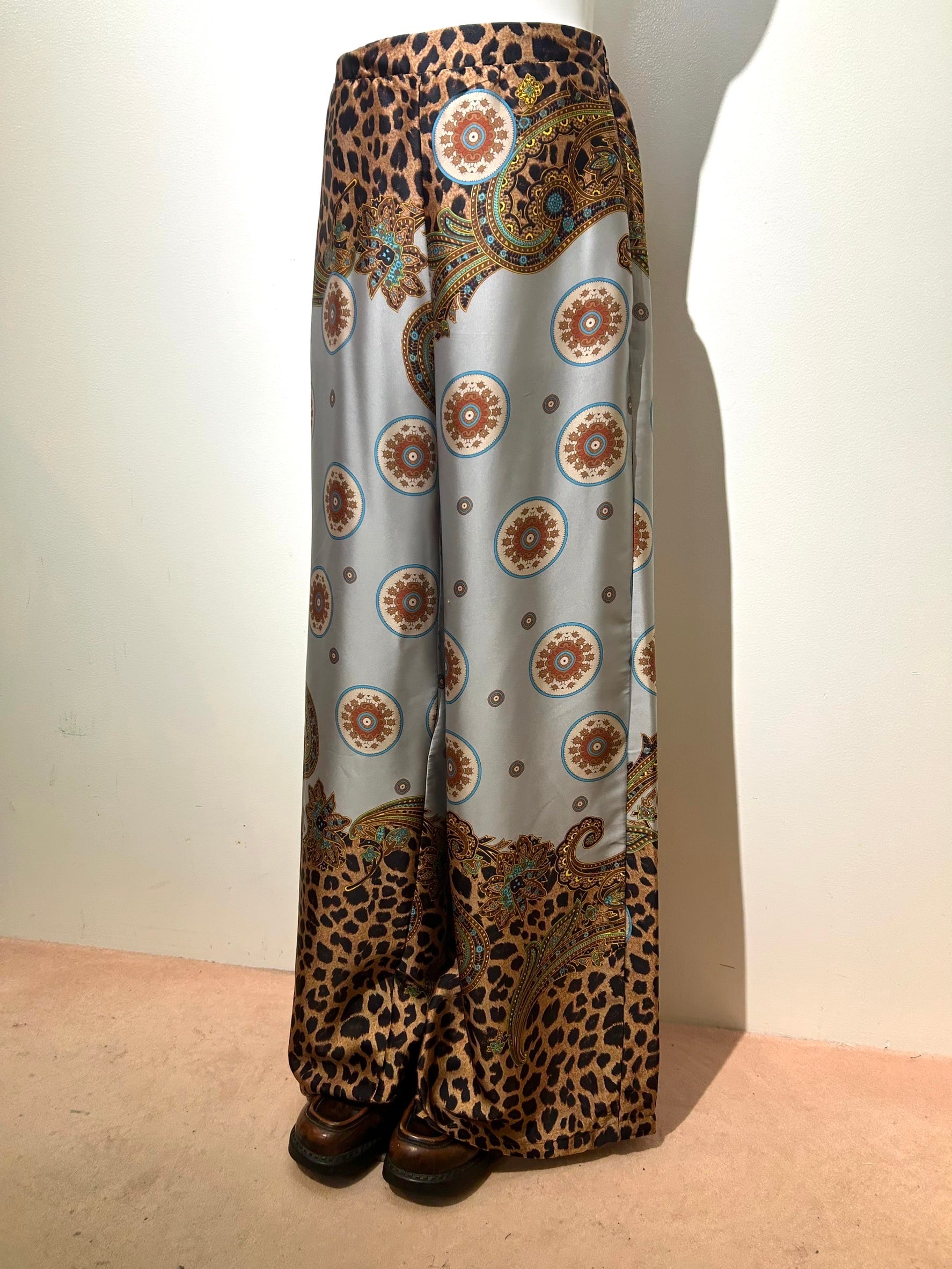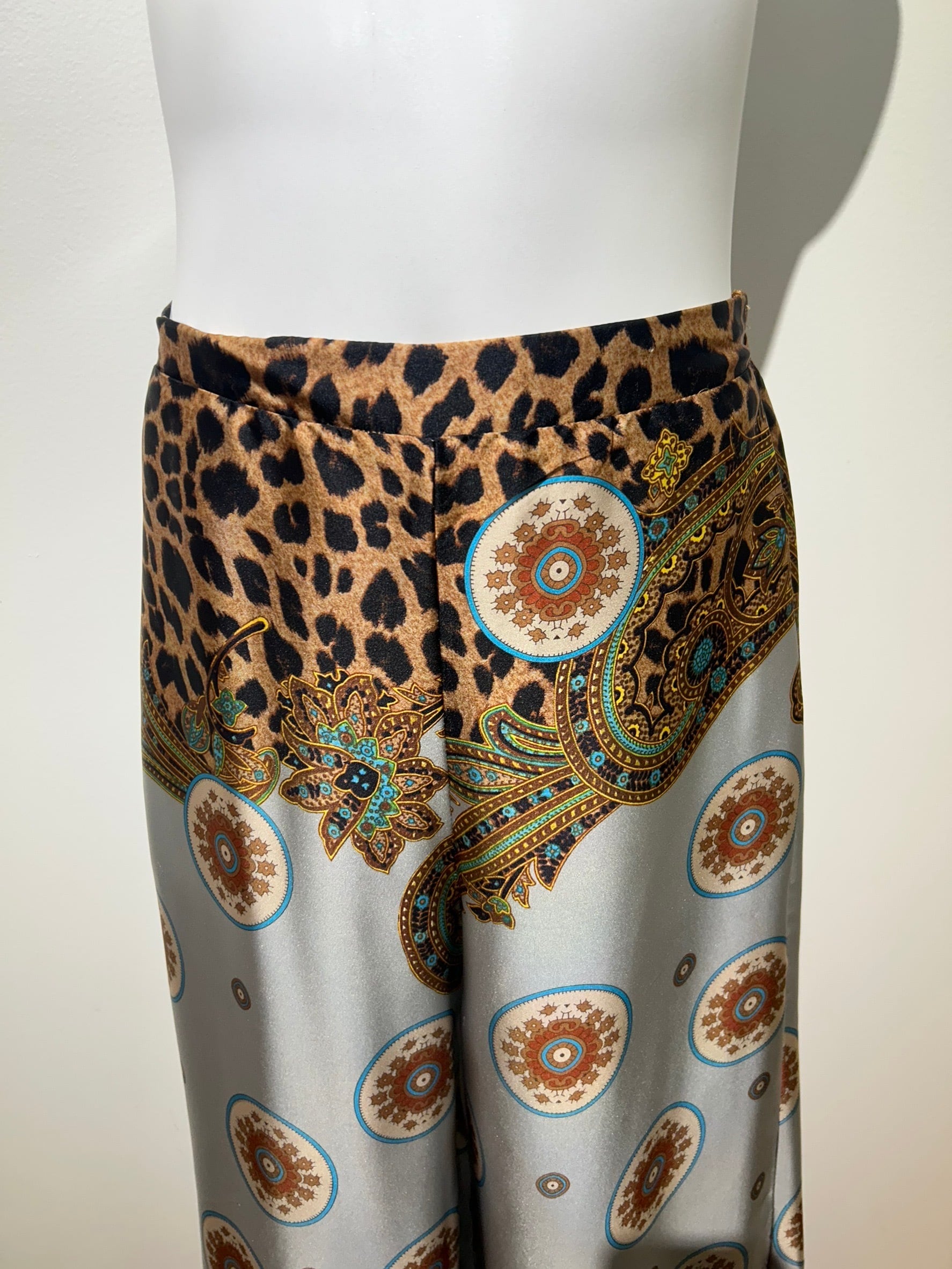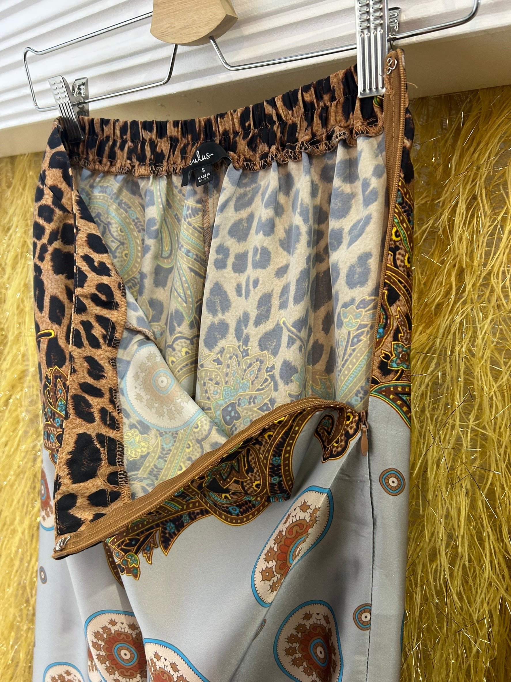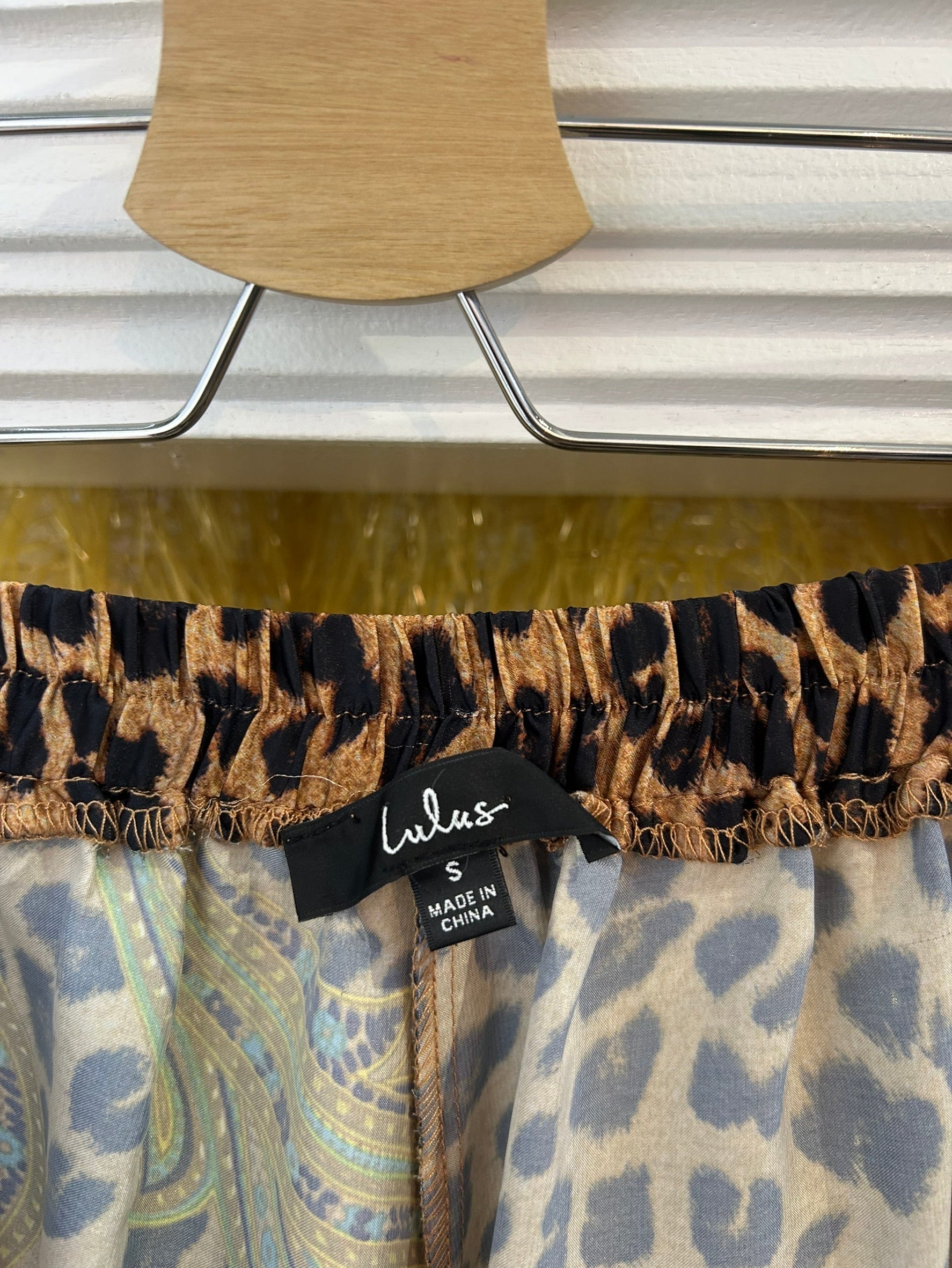 素材: 100%Polyester サイズ: S(表記) ウエスト幅32cm(後ろがゴムになっています) ヒップ幅44cm 股上35cm 股下73cm わたり幅33cm 裾幅32.5cm ダメージ: 写真17.18枚目のひきつれのダメージがあります