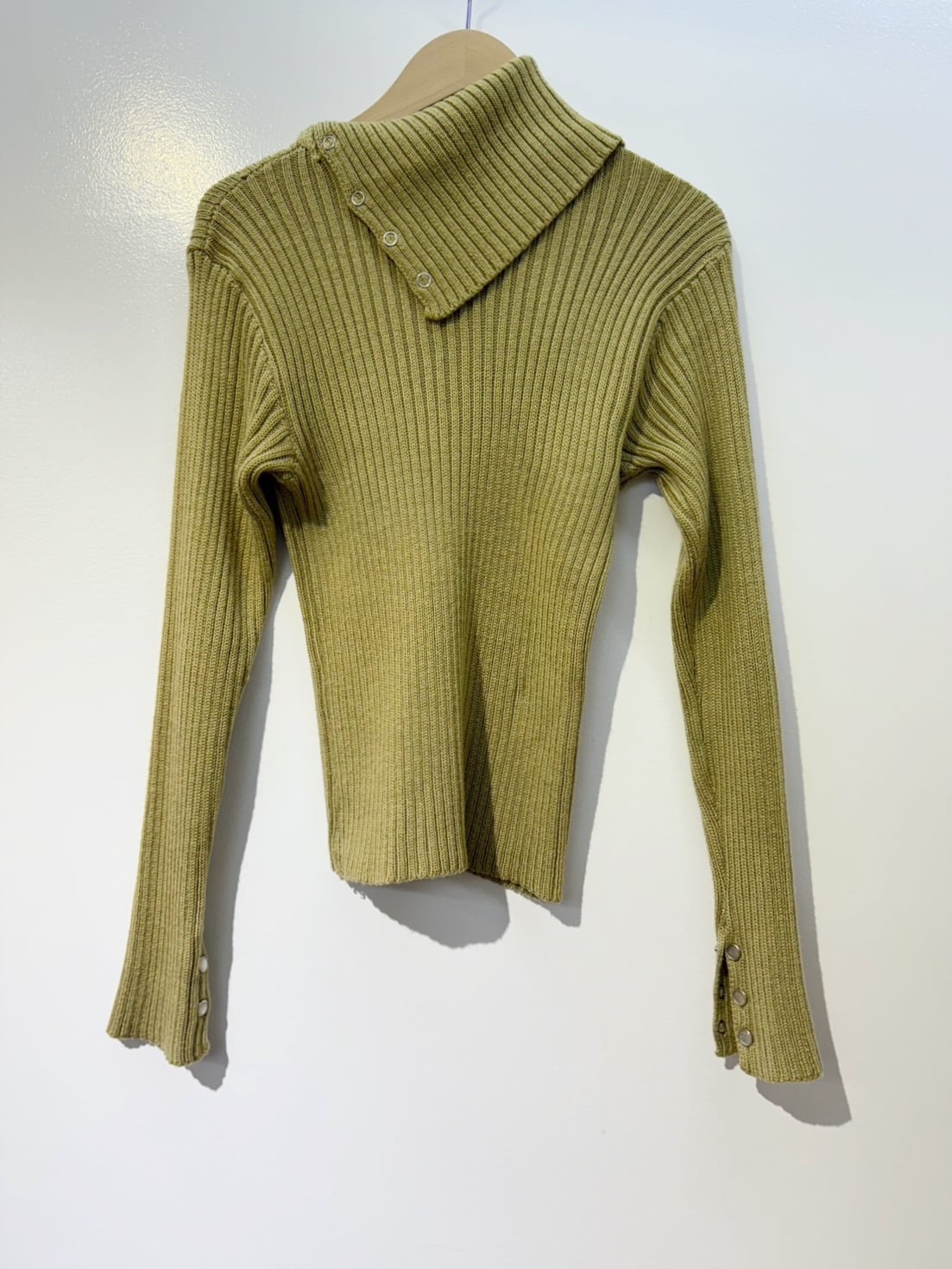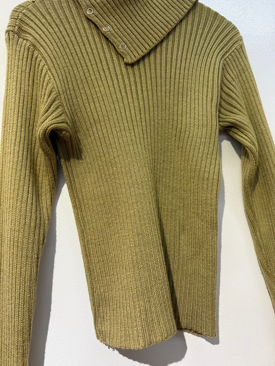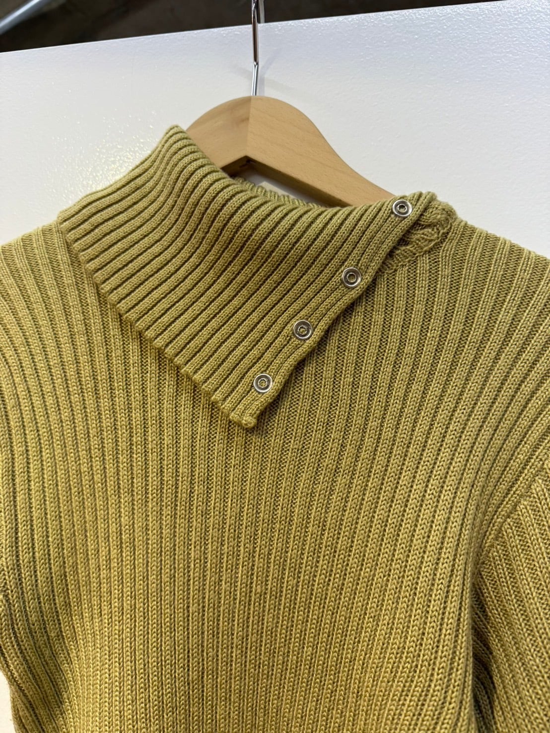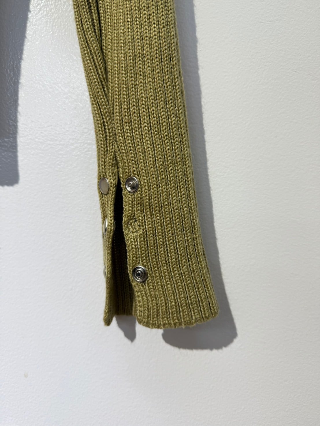 素材: Acrylic(表記なし) 折り返しのボタンでタートルネックになるデザインです。 サイズ: 肩幅41cm 袖丈57cm 身幅39cm 身丈51cm 折り返し丈15cm ダメージ: 写真19枚目のようなボタンの止め具が外れている部分とタートルの2番目のボタンが止まりづらいです。