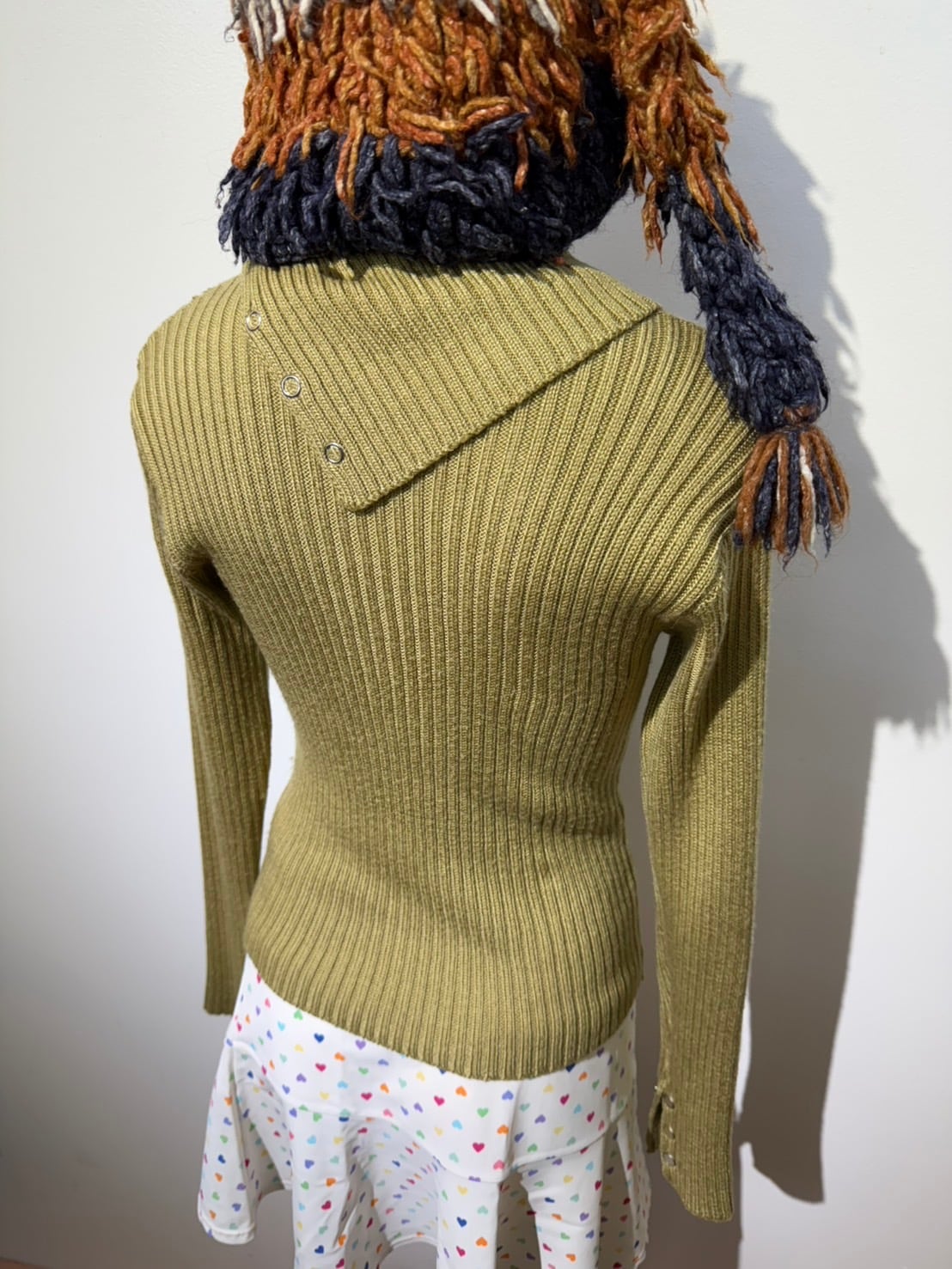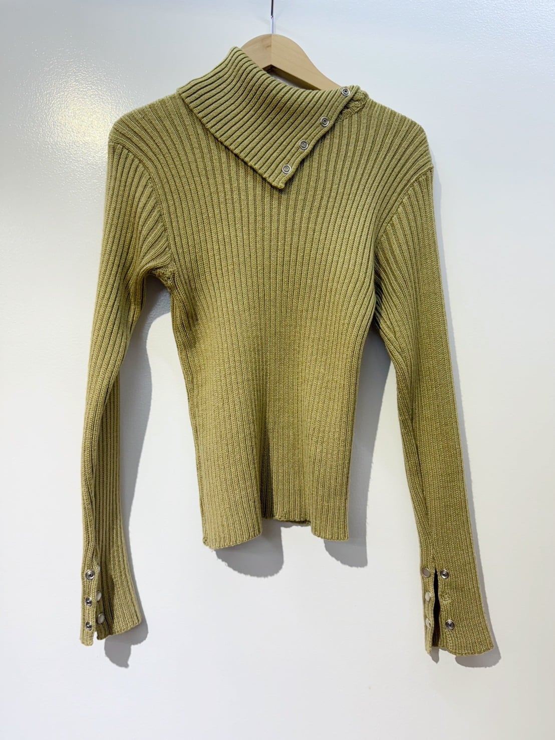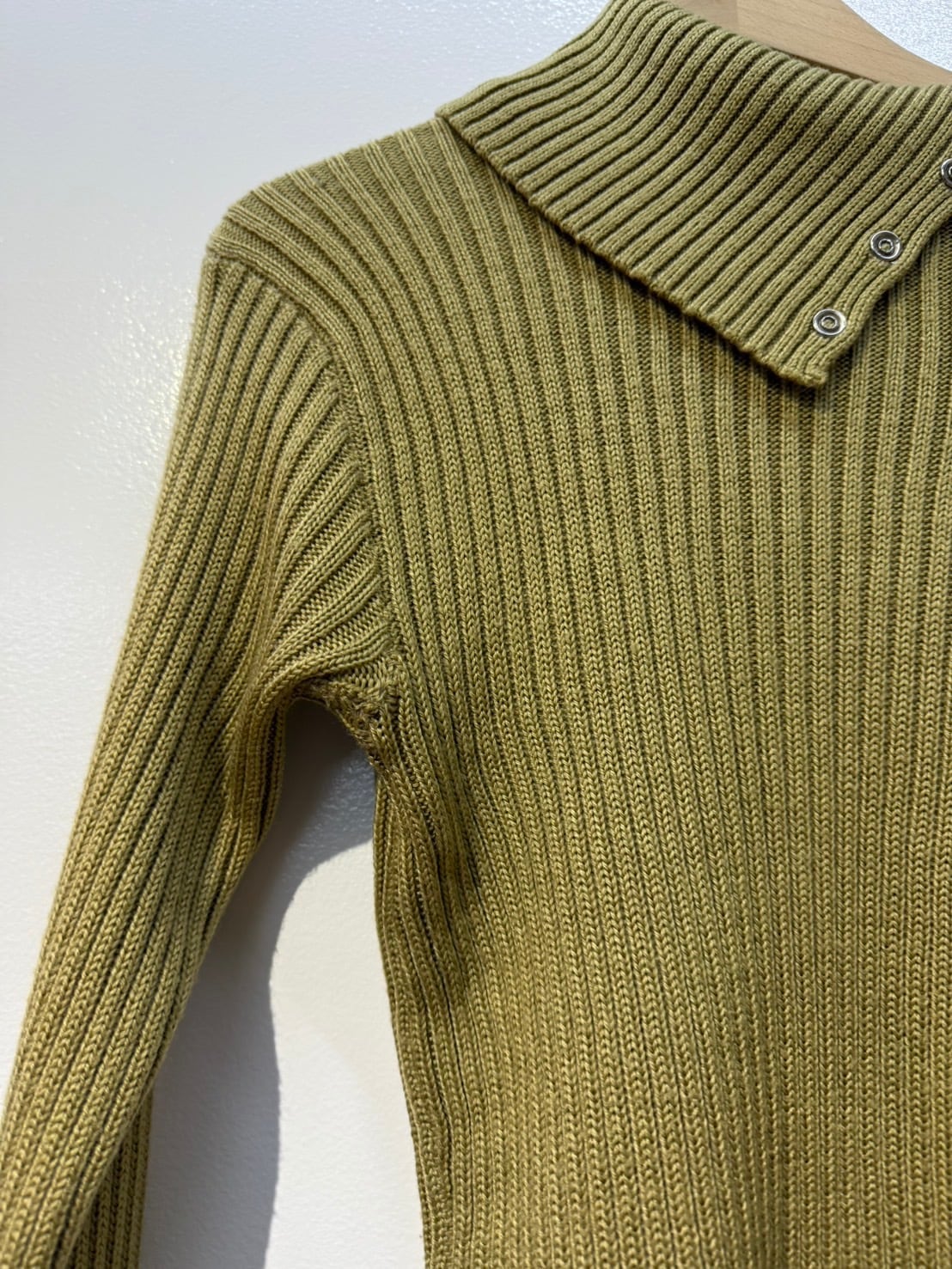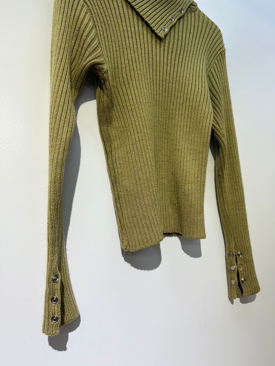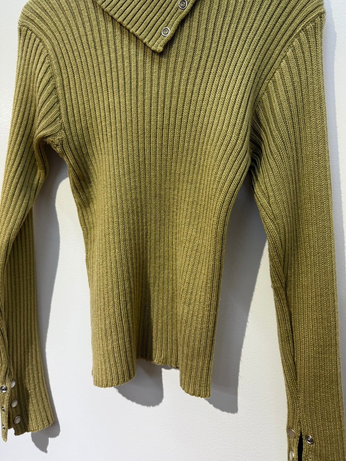 素材: Acrylic(表記なし) 折り返しのボタンでタートルネックになるデザインです。 サイズ: 肩幅41cm 袖丈57cm 身幅39cm 身丈51cm 折り返し丈15cm ダメージ: 写真19枚目のようなボタンの止め具が外れている部分とタートルの2番目のボタンが止まりづらいです。
