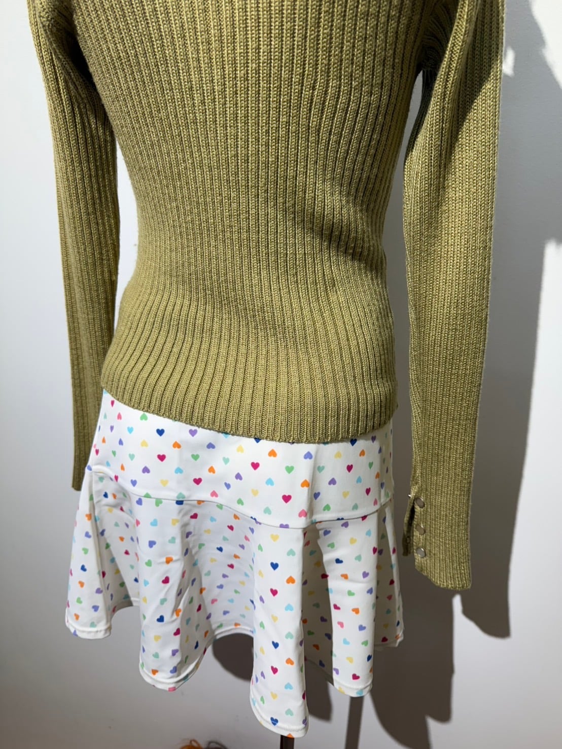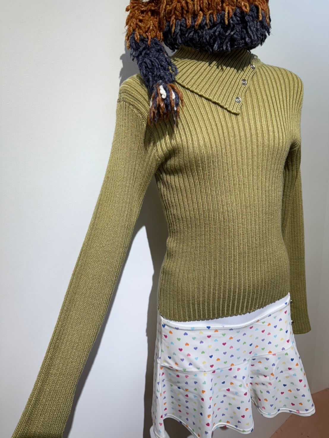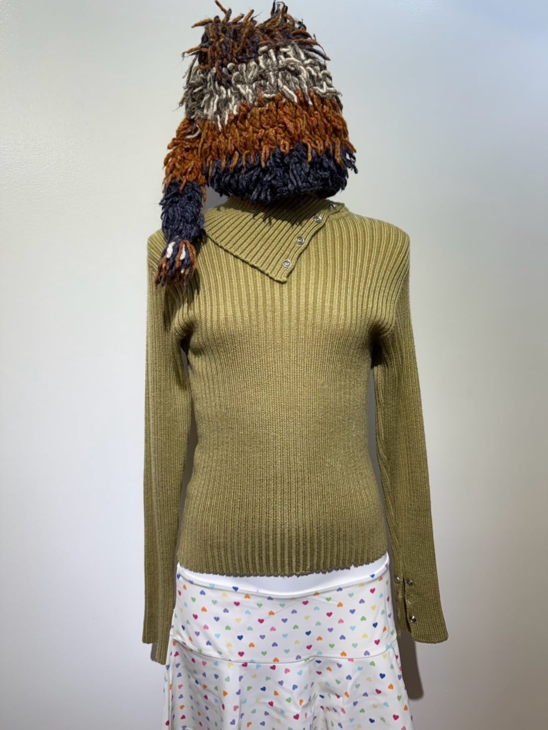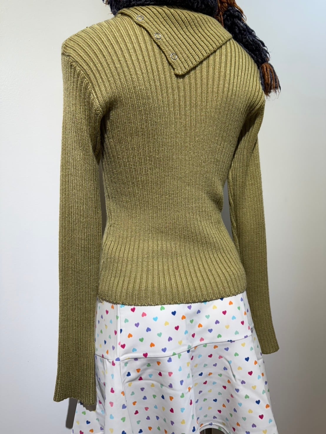 素材: Acrylic(表記なし) 折り返しのボタンでタートルネックになるデザインです。 サイズ: 肩幅41cm 袖丈57cm 身幅39cm 身丈51cm 折り返し丈15cm ダメージ: 写真19枚目のようなボタンの止め具が外れている部分とタートルの2番目のボタンが止まりづらいです。