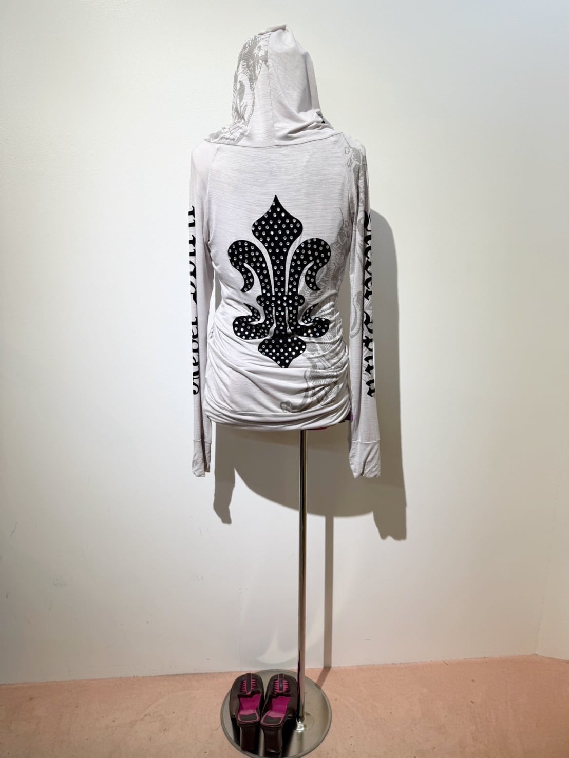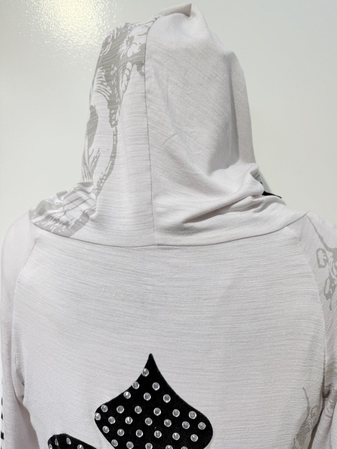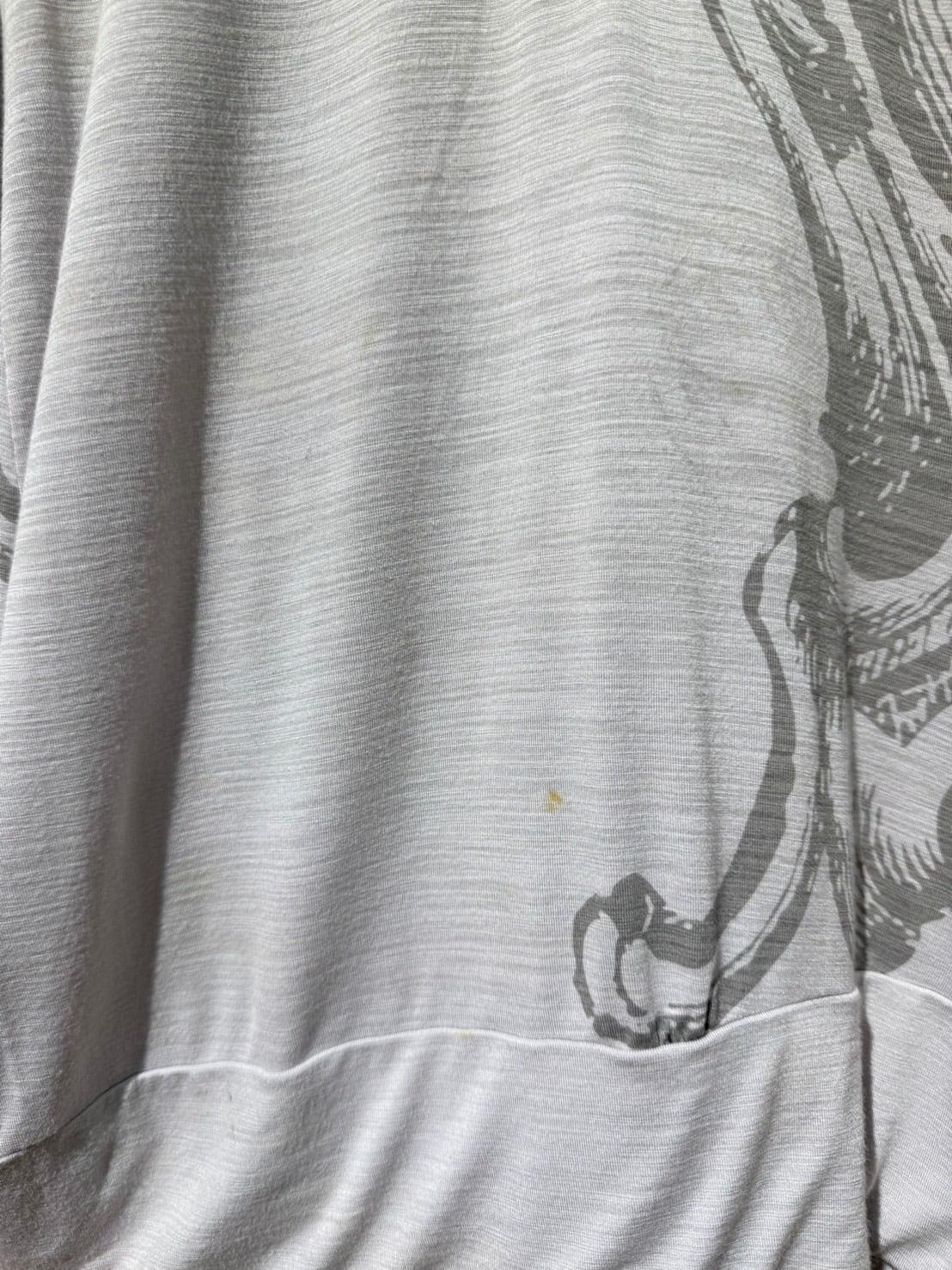 素材: 95%Rayon 5%Spandex サイズ: L(表記) 裄丈84cm 身幅43cm 身丈75cm フード丈22cm ダメージ: 写真13〜20枚目のような汚れ、毛玉、小さな穴、お直し跡が見られます。