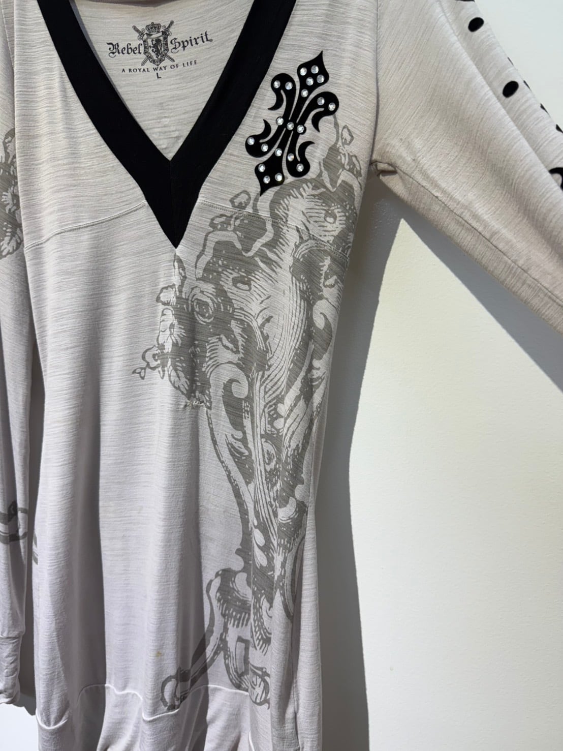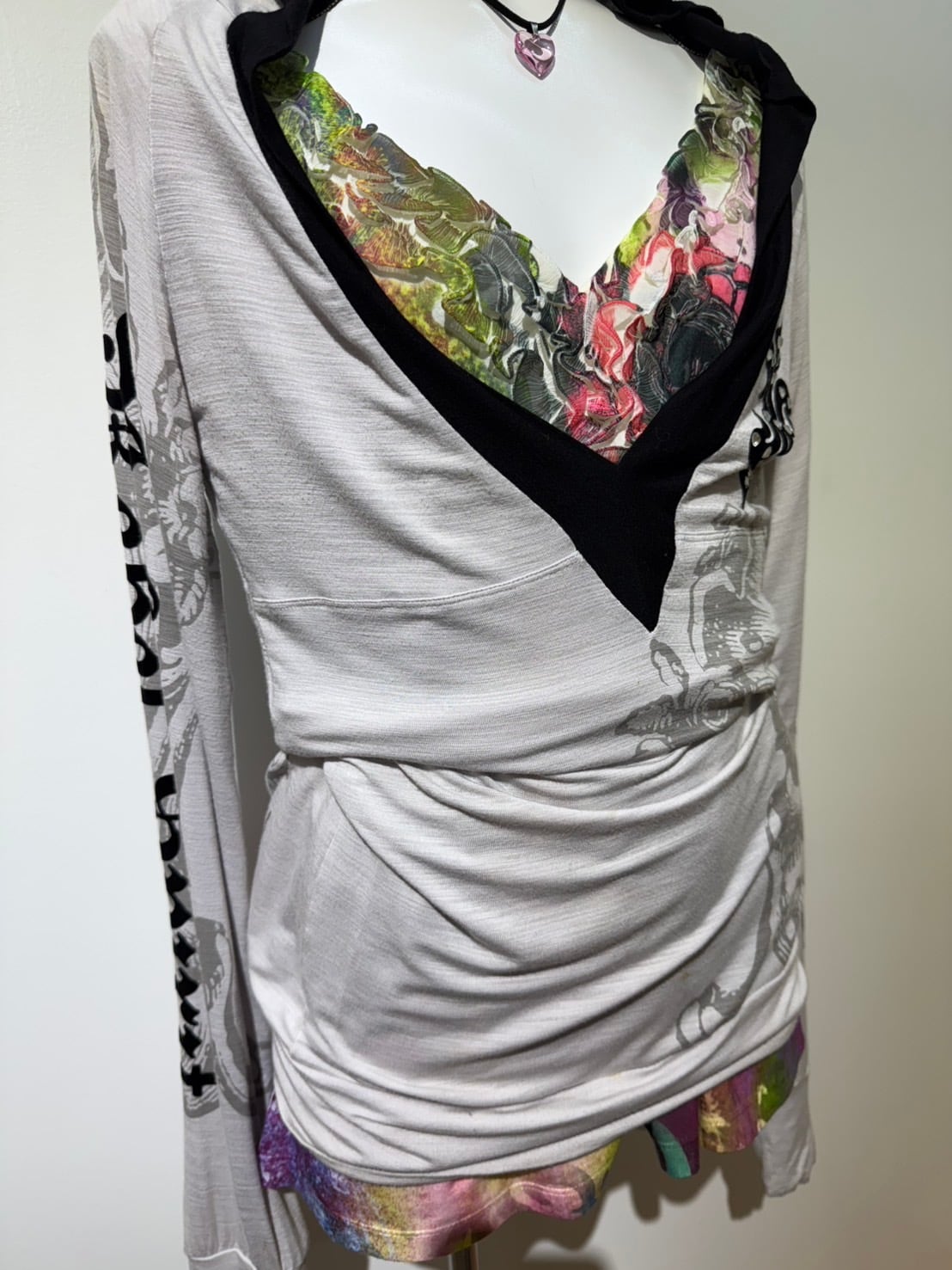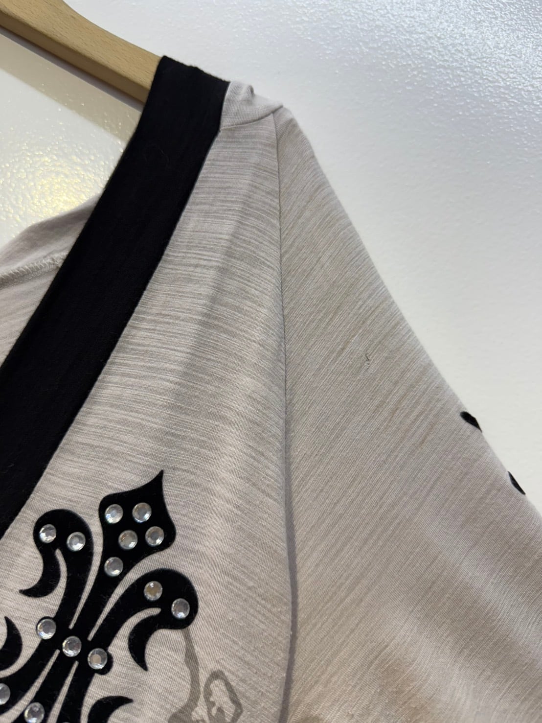 素材: 95%Rayon 5%Spandex サイズ: L(表記) 裄丈84cm 身幅43cm 身丈75cm フード丈22cm ダメージ: 写真13〜20枚目のような汚れ、毛玉、小さな穴、お直し跡が見られます。
