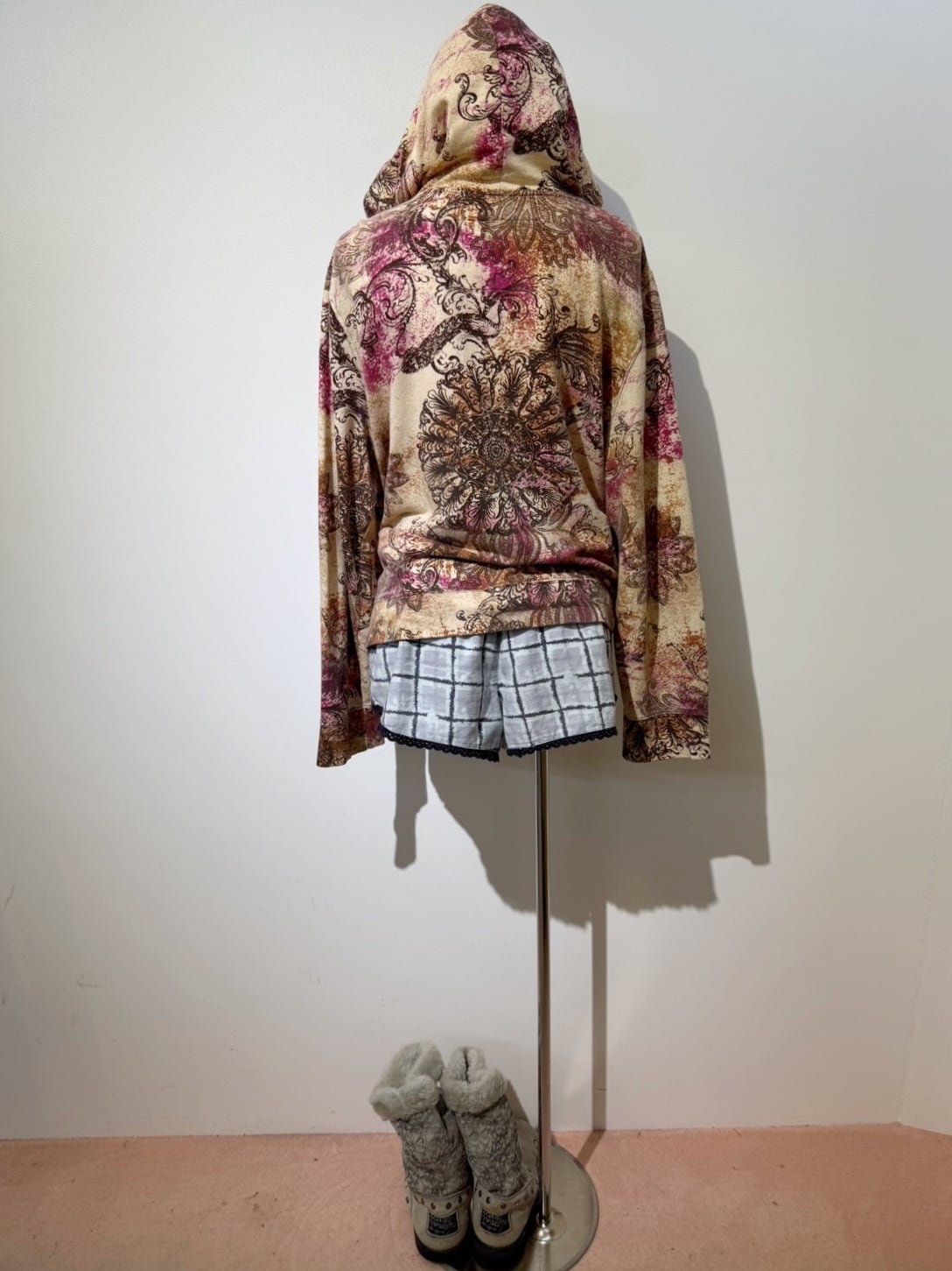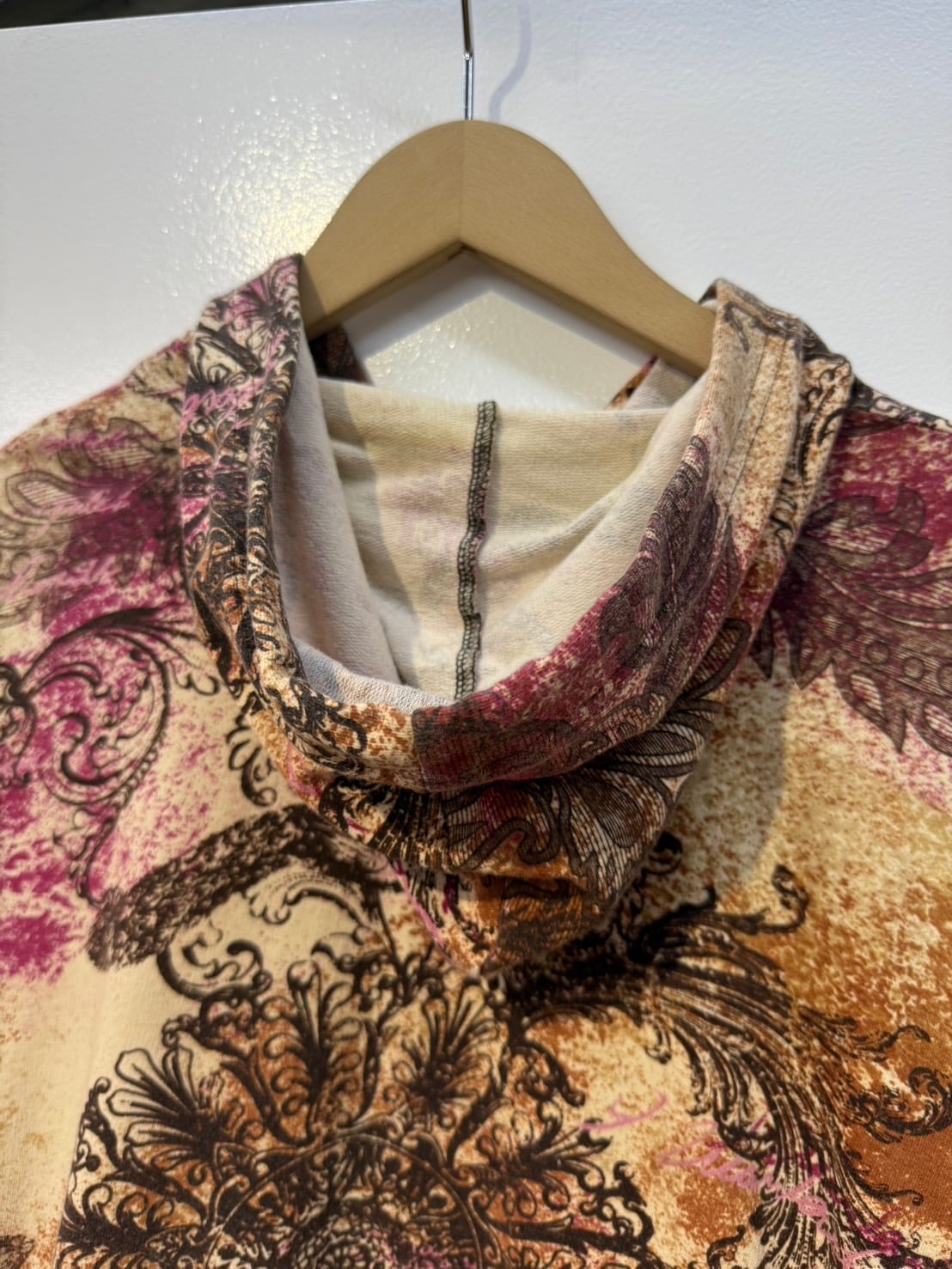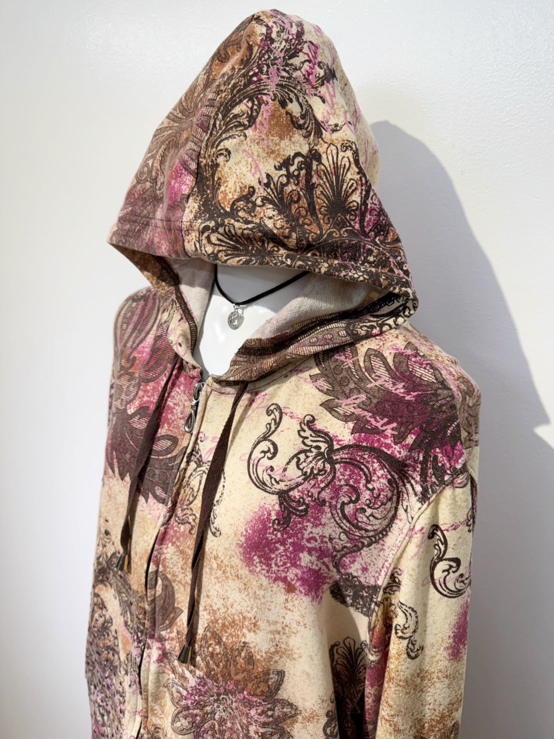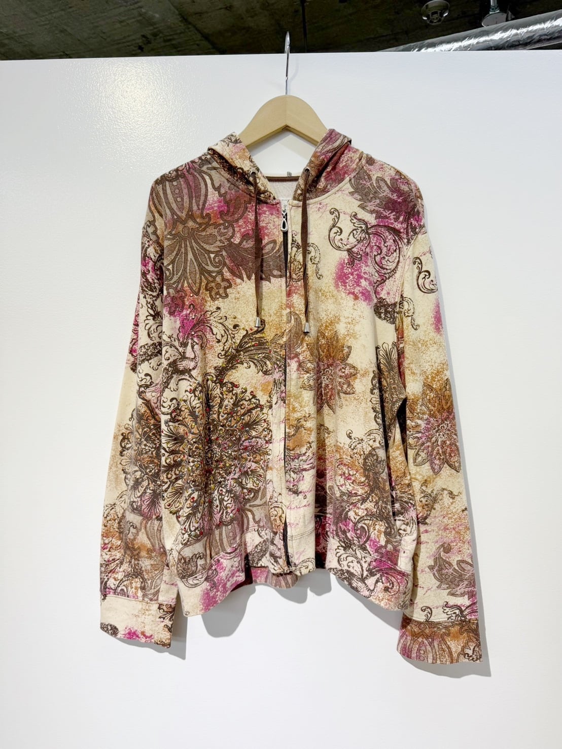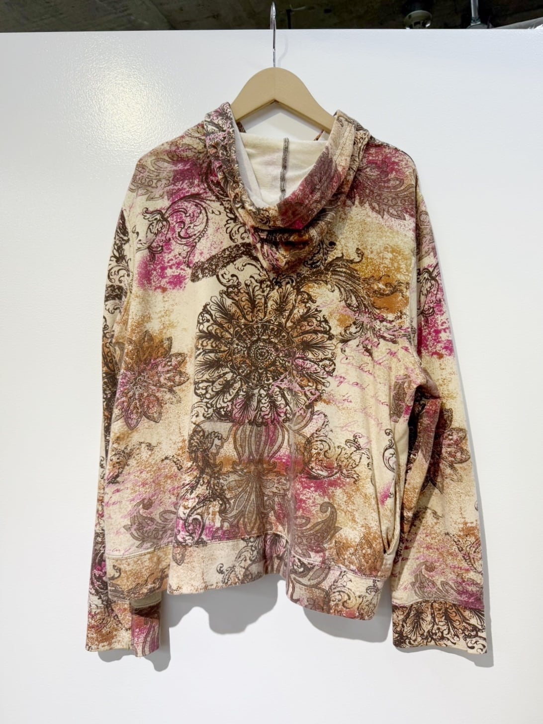 素材: 95%Cotton 5%Spandex サイズ: XL(表記) 肩幅53cm 袖丈62cm 身幅51.5cm 身丈55cm フード丈39.5cm ダメージ: 写真20枚目のようなフード下に糸のほつれが出ている箇所があります。