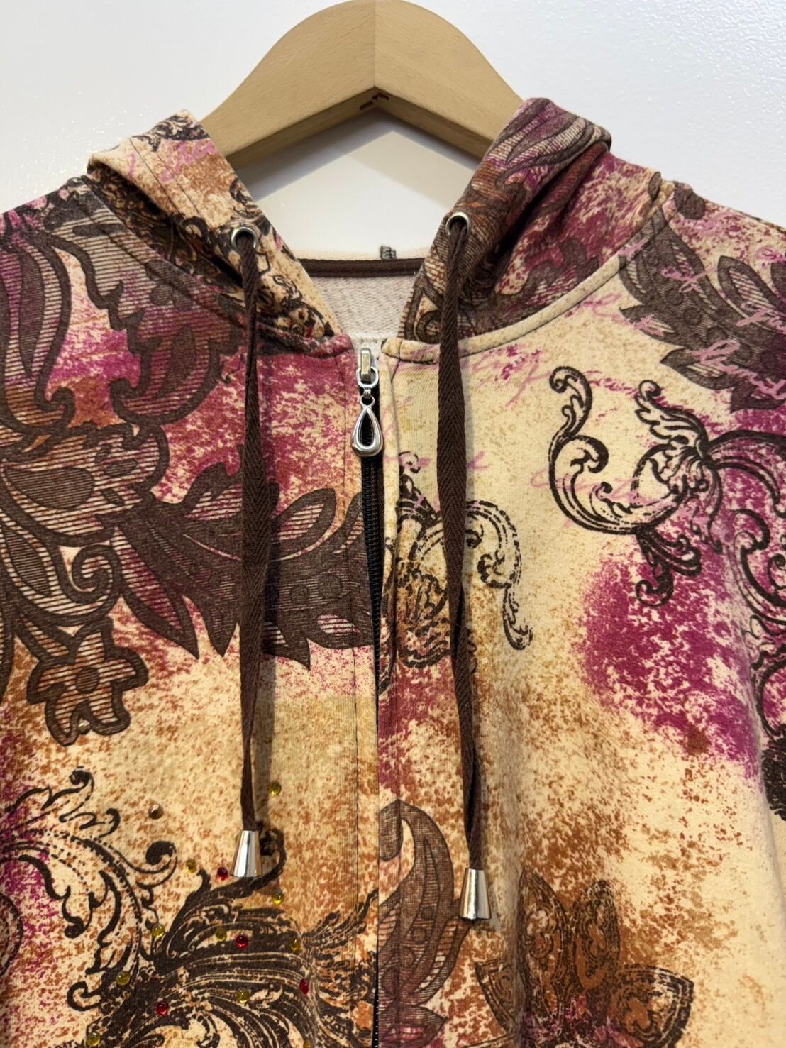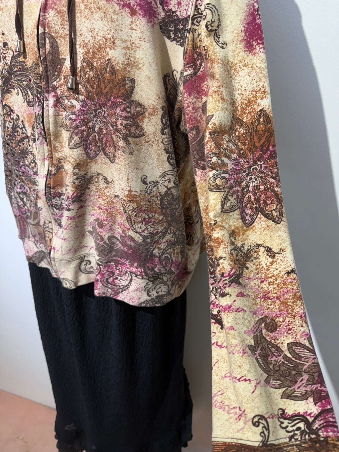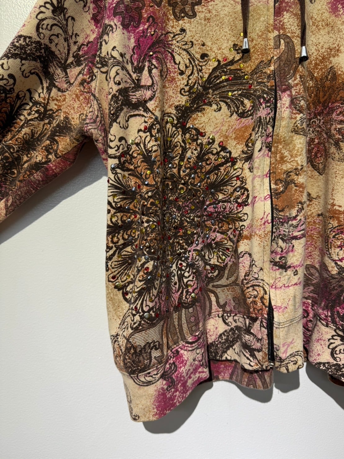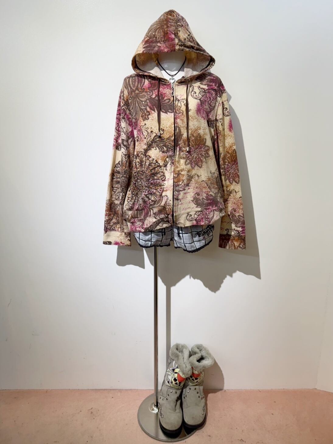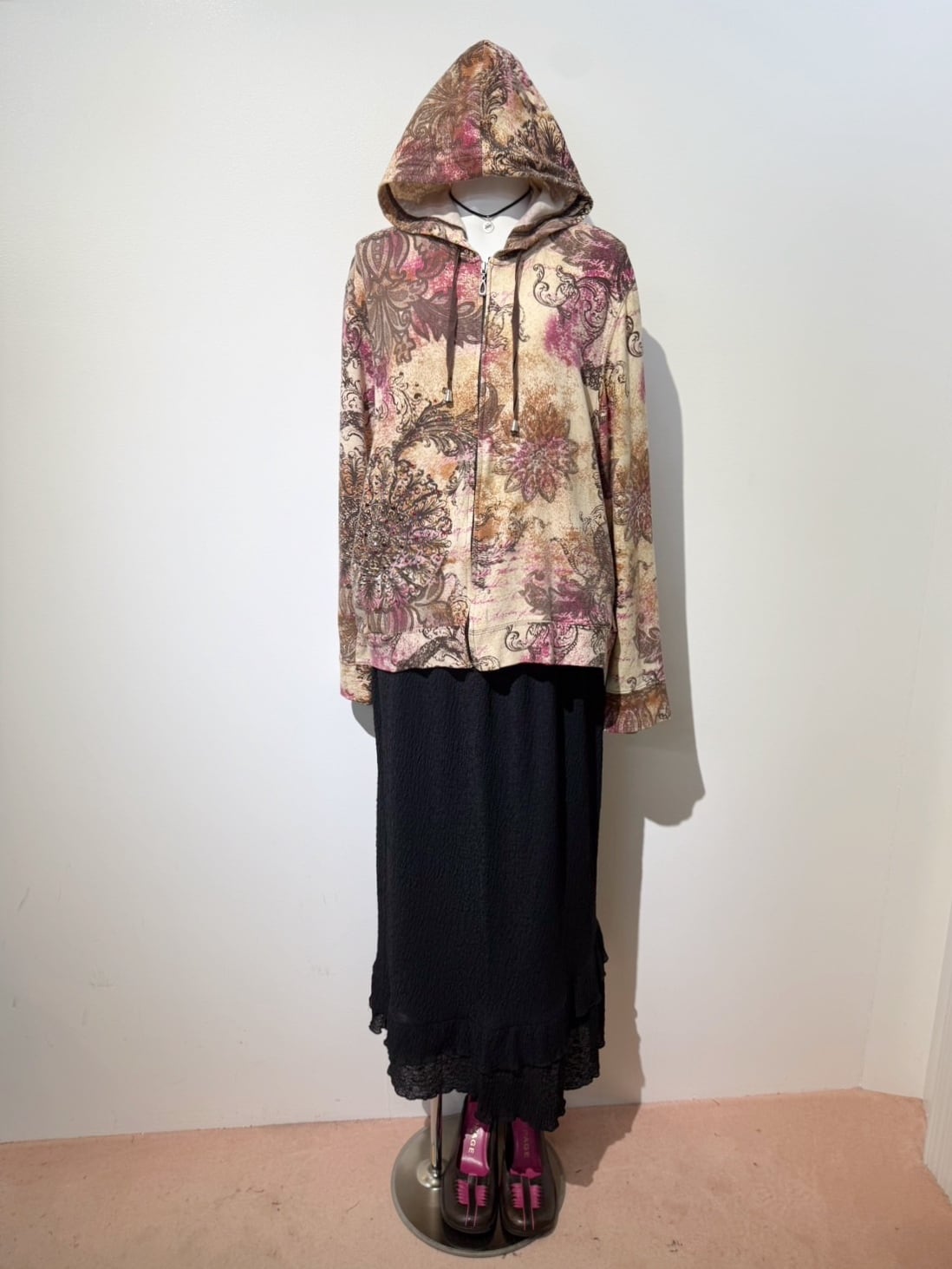 素材: 95%Cotton 5%Spandex サイズ: XL(表記) 肩幅53cm 袖丈62cm 身幅51.5cm 身丈55cm フード丈39.5cm ダメージ: 写真20枚目のようなフード下に糸のほつれが出ている箇所があります。