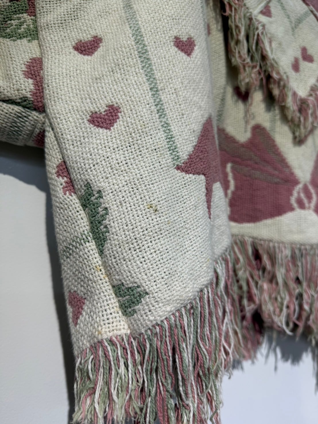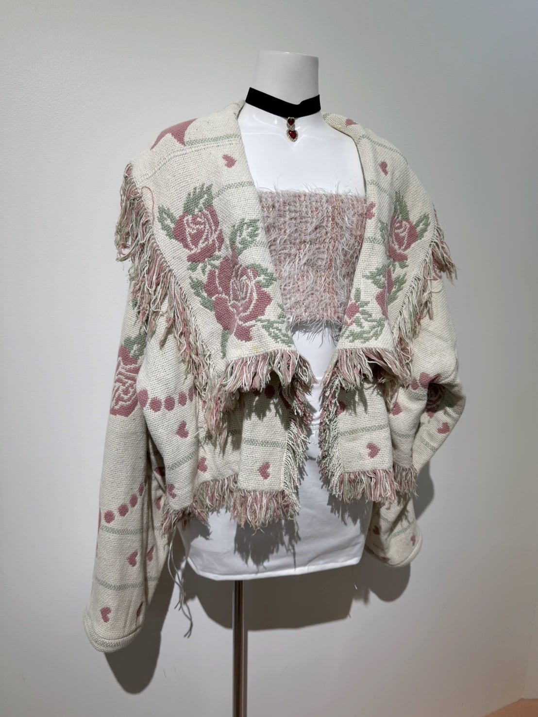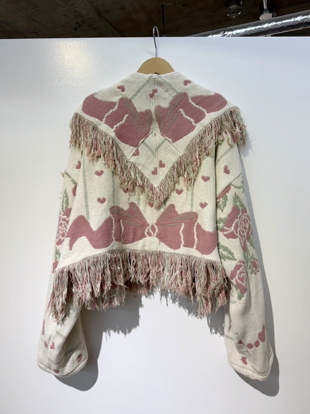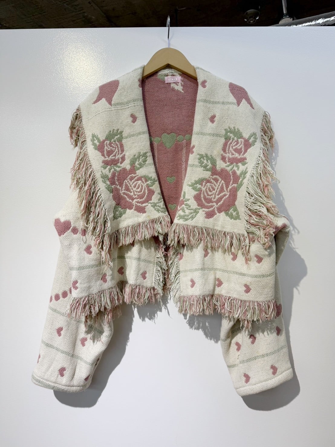 素材: Polyester(表記なし) サイズ: 肩幅62cm 袖丈51cm 身幅72cm 身丈55cm(フリンジ10cm) 衿幅17cm ダメージ: 写真10〜20枚目のようや汚れがあります。