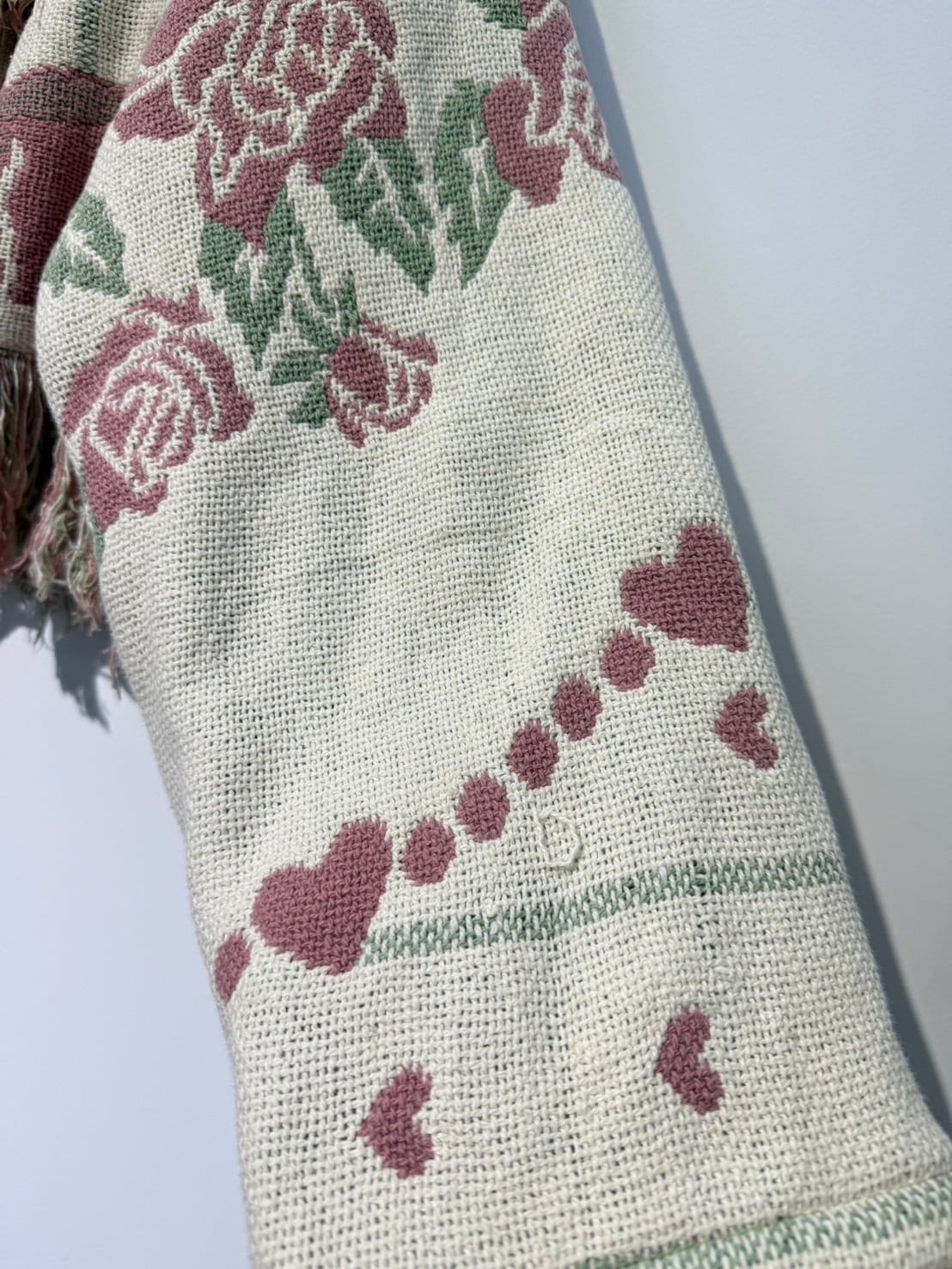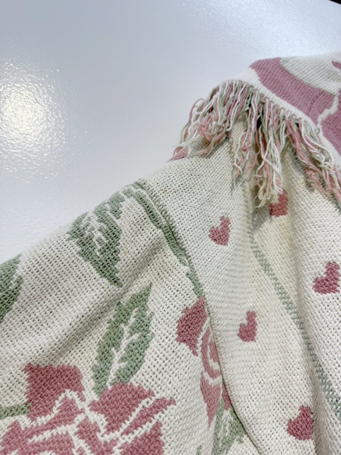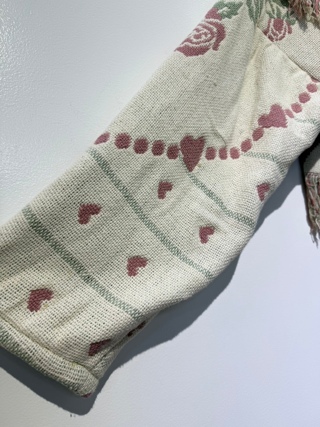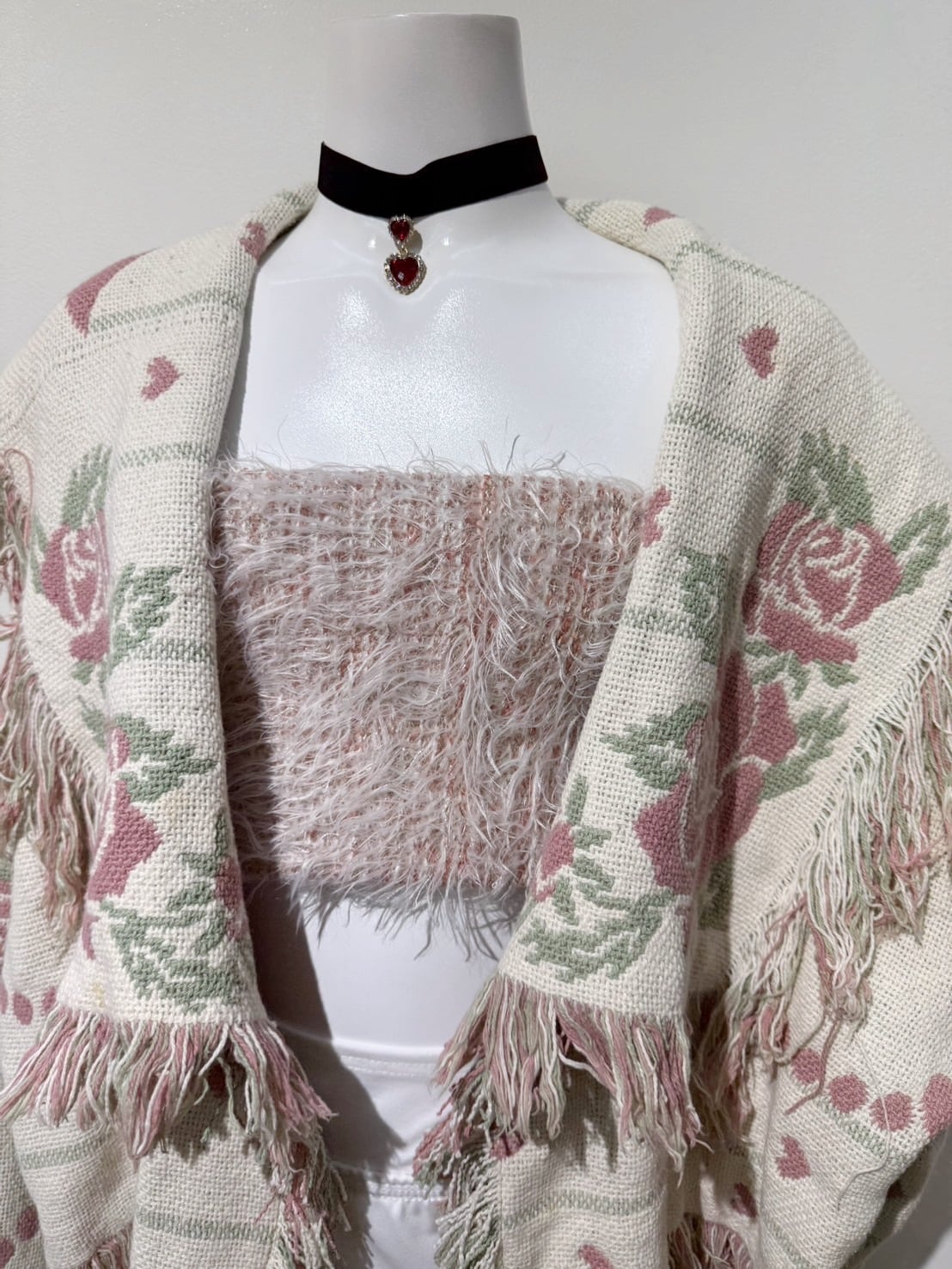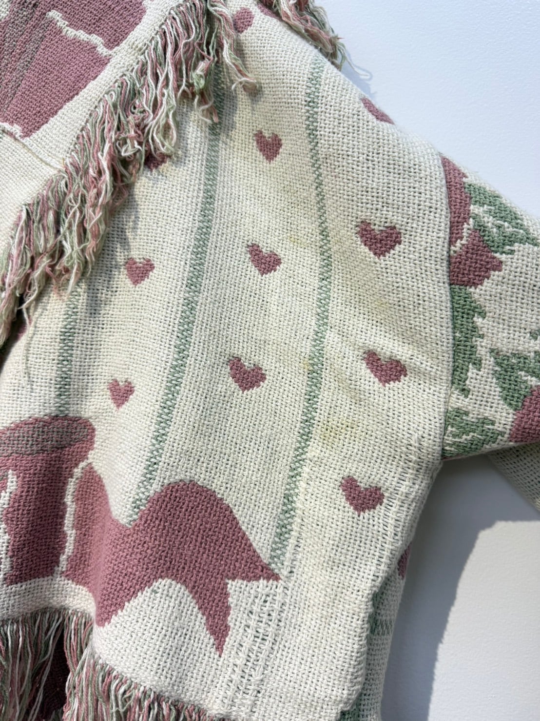 素材: Polyester(表記なし) サイズ: 肩幅62cm 袖丈51cm 身幅72cm 身丈55cm(フリンジ10cm) 衿幅17cm ダメージ: 写真10〜20枚目のようや汚れがあります。