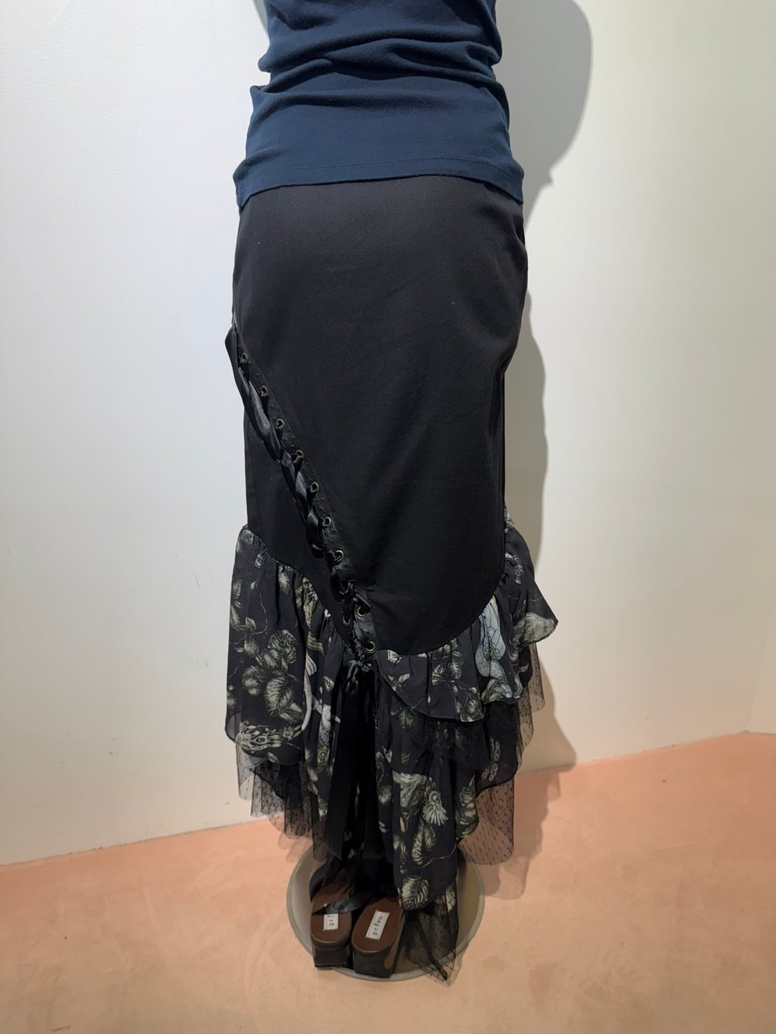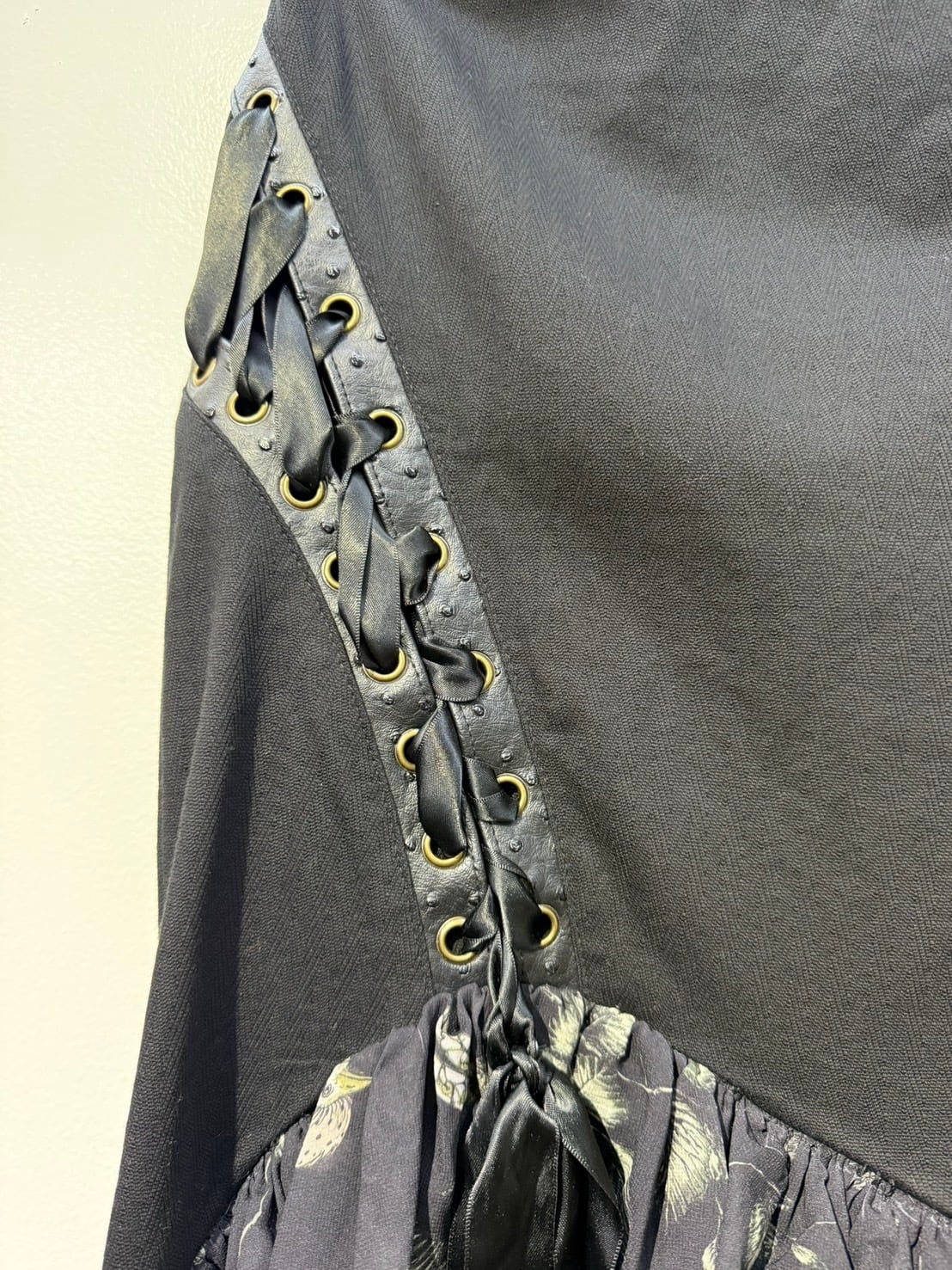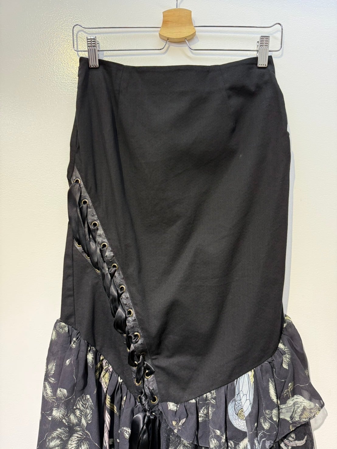 素材: Self 97%Cotton 3%Spandex Contrast 100%Polyester サイズ: ウエスト幅33cm ヒップ幅40cm 丈1m ダメージ: 写真16枚目のような汚れがあります。