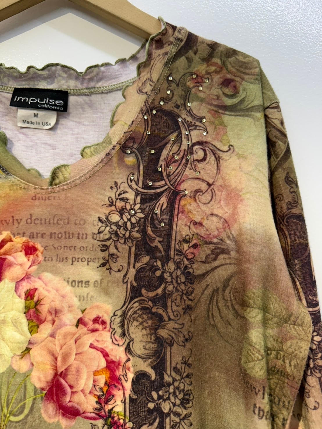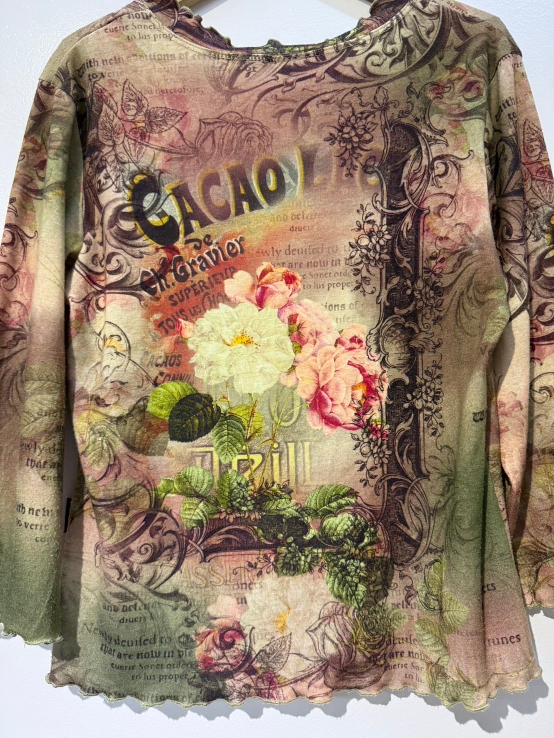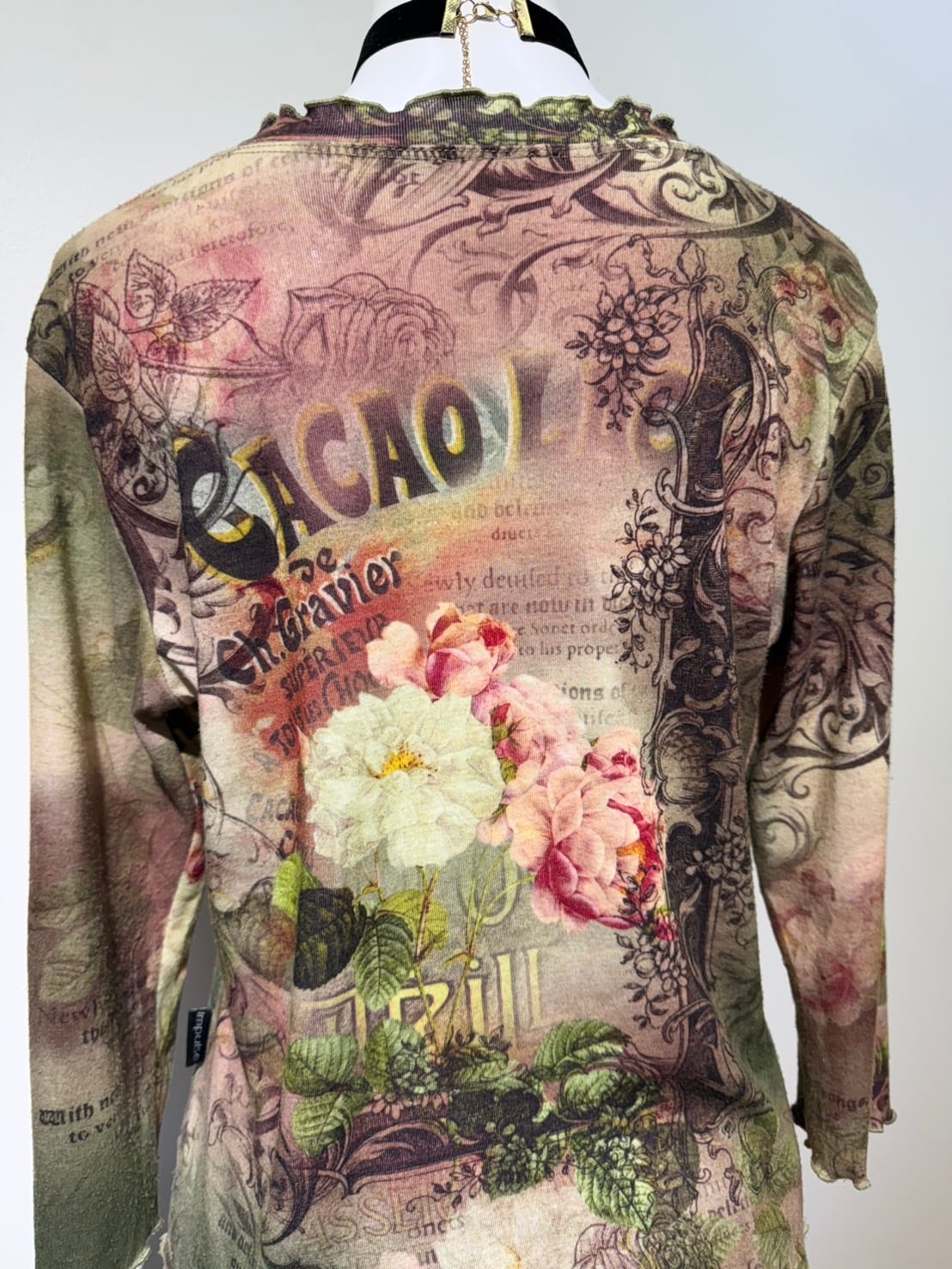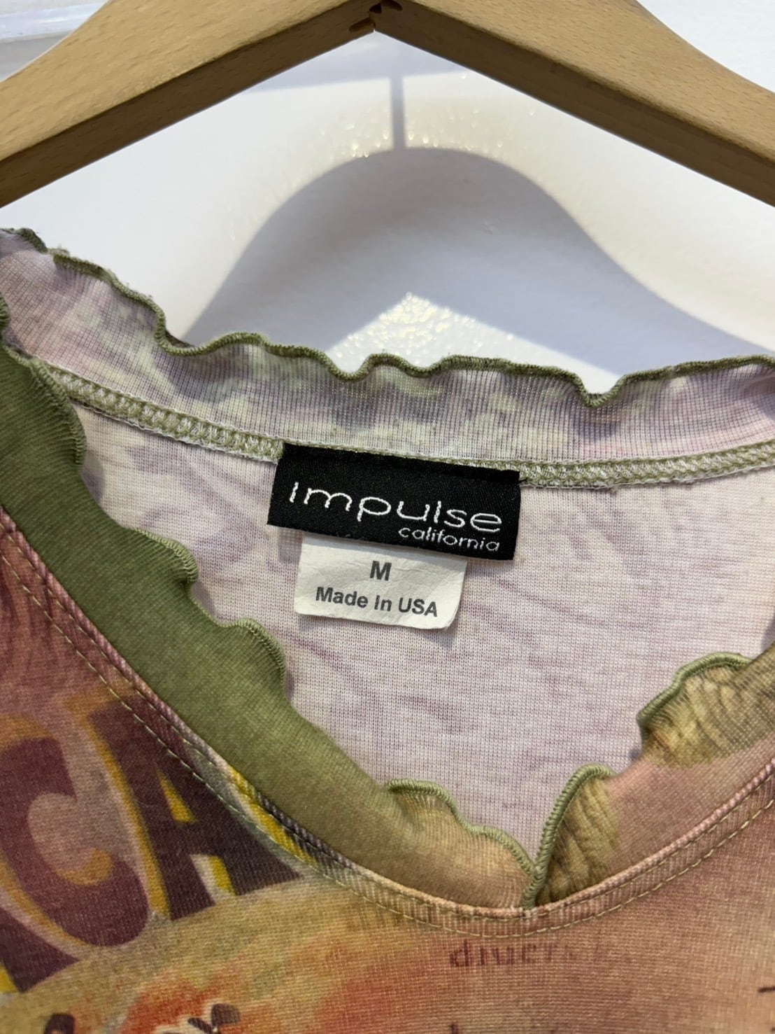 素材: Polyester(表記なし) サイズ: M(表記)肩幅38cm 袖丈43cm 身幅44.5cm 身丈52cm 襟フリル幅2.5cm ダメージ: 写真14〜16枚目のような毛玉があります。 Made in USA