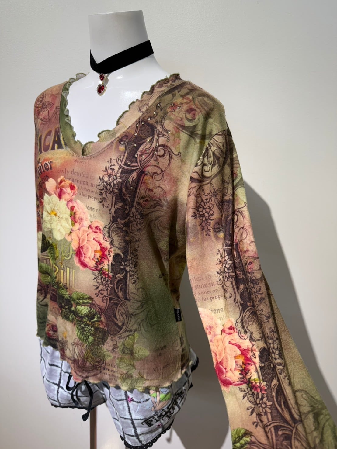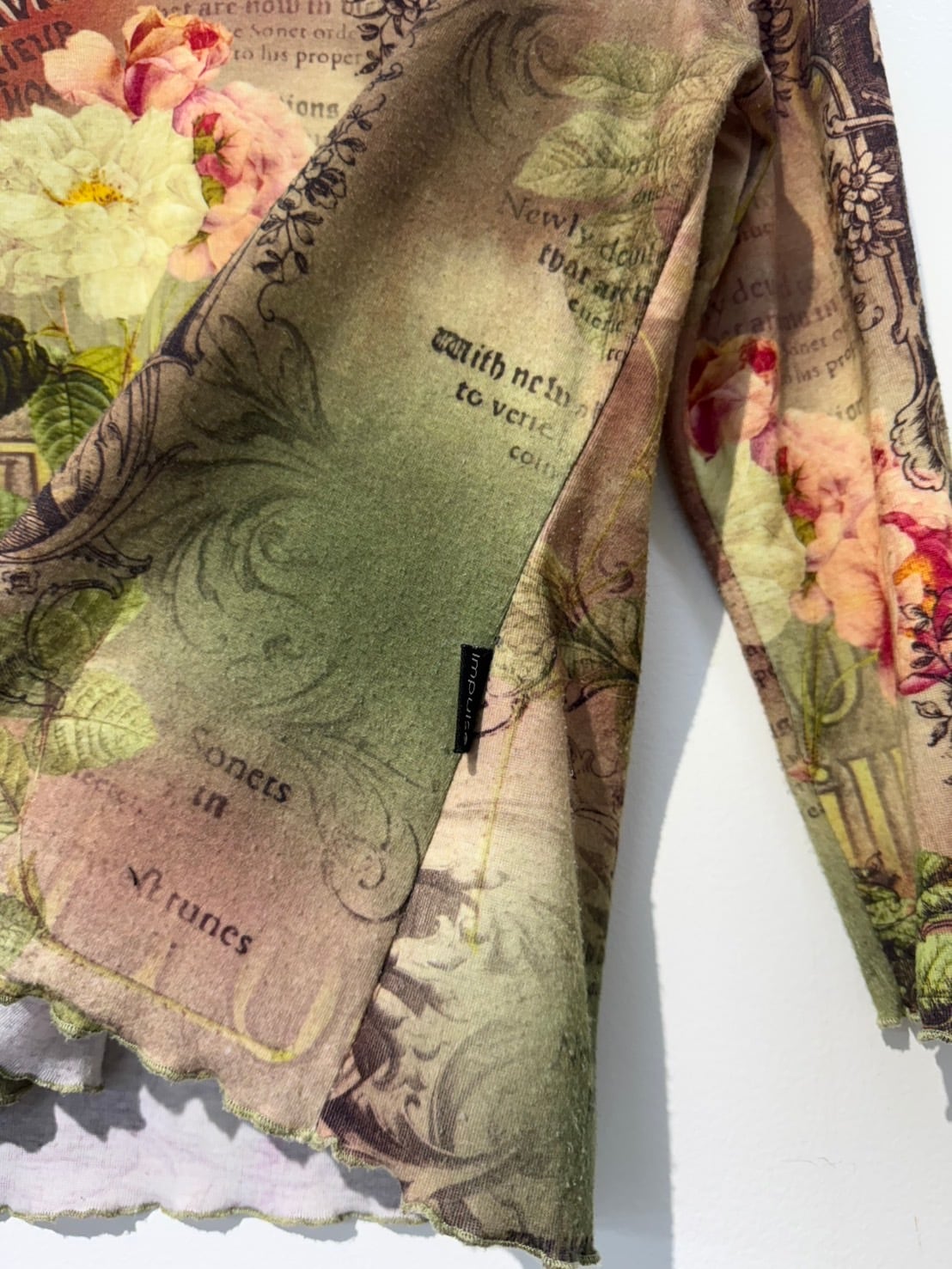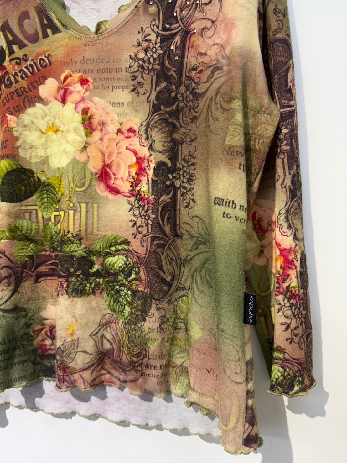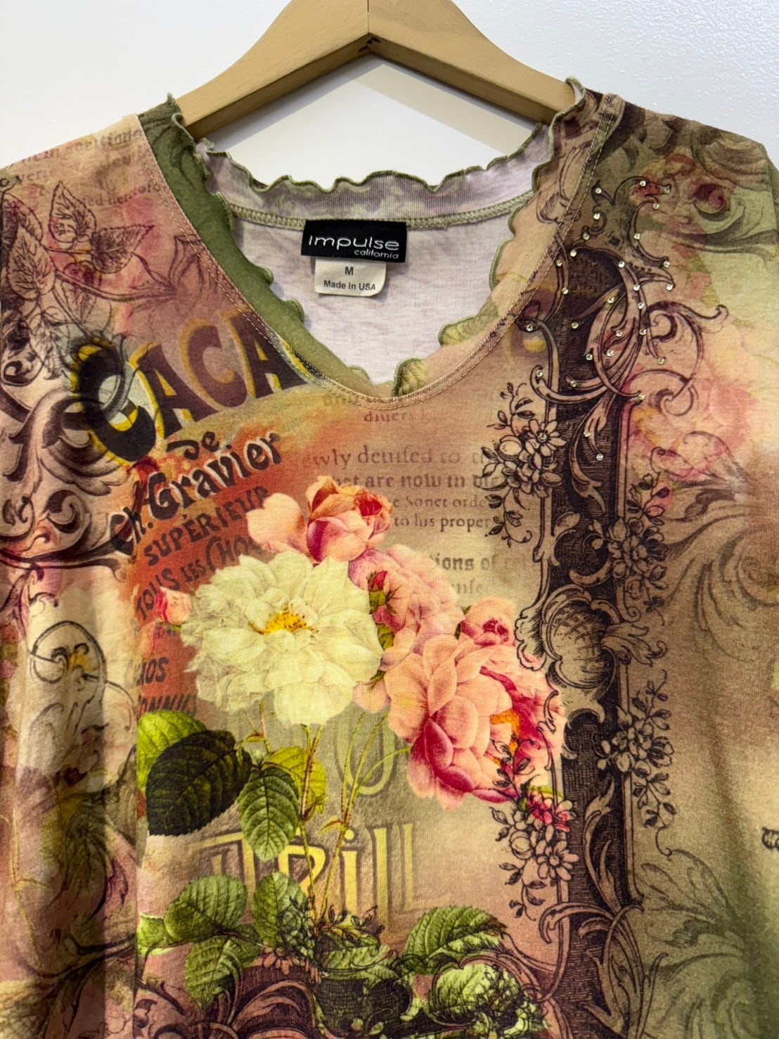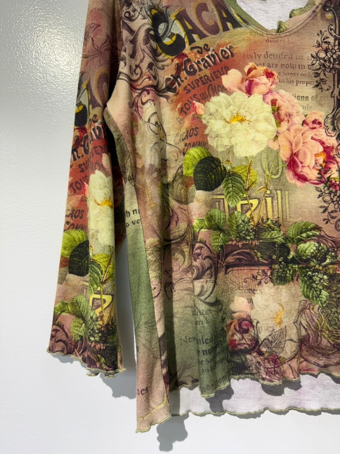 素材: Polyester(表記なし) サイズ: M(表記)肩幅38cm 袖丈43cm 身幅44.5cm 身丈52cm 襟フリル幅2.5cm ダメージ: 写真14〜16枚目のような毛玉があります。 Made in USA