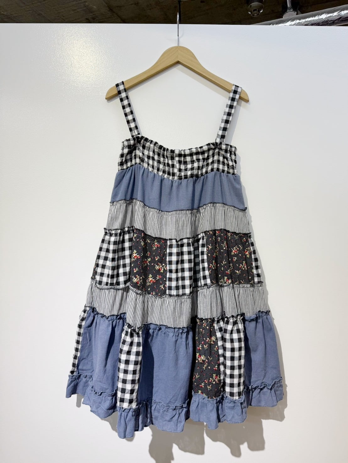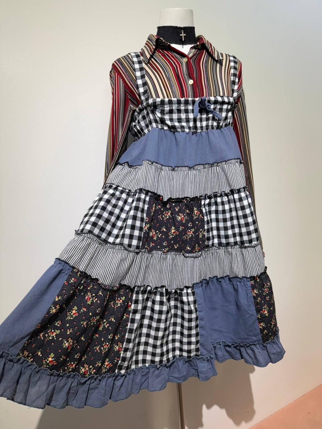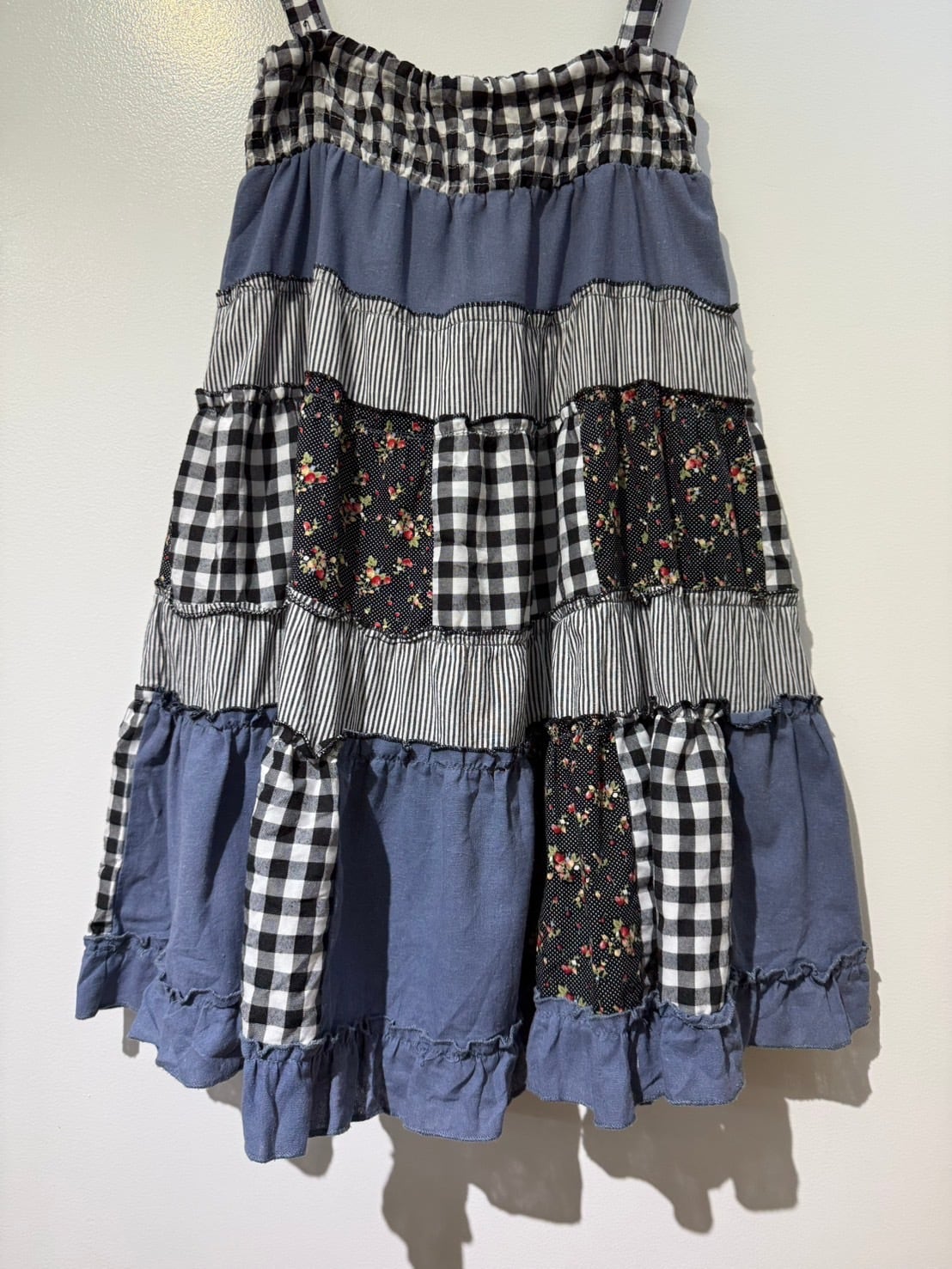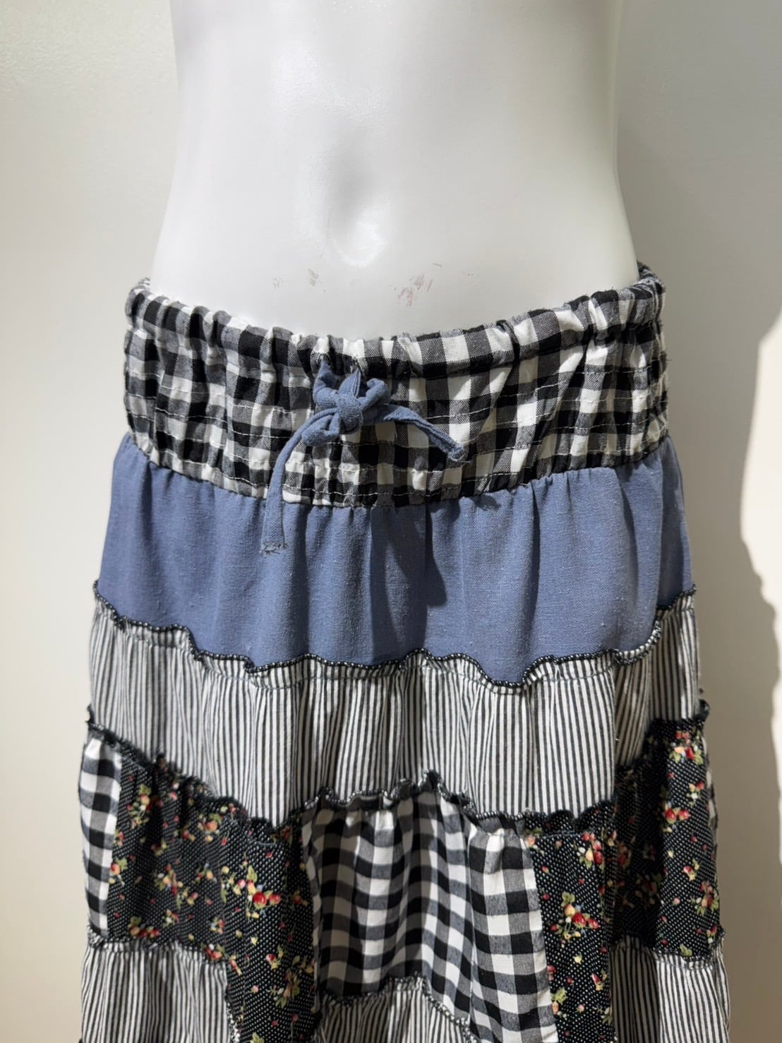 素材: 50%Cotton 50%Polyester ウエスト周りの紐は肩紐としても使用でき、ドレスとして着用できるデザインになっています。 サイズ: ウエスト幅32〜44cm(ゴムで伸縮) ヒップ幅47.5cm 丈72cm 紐16cm
