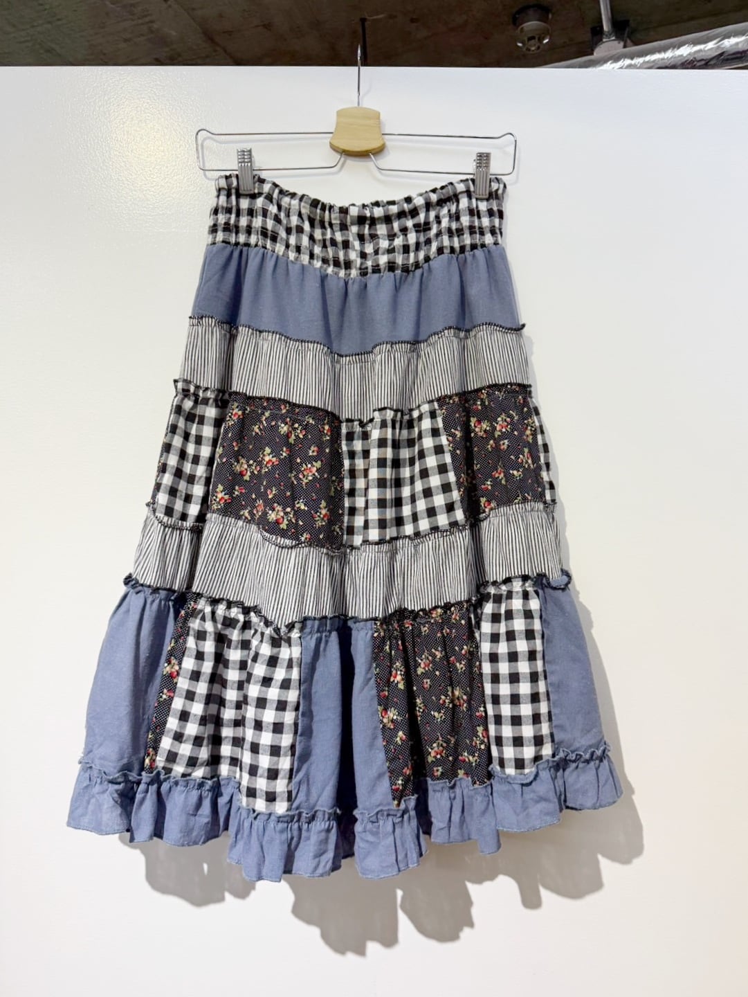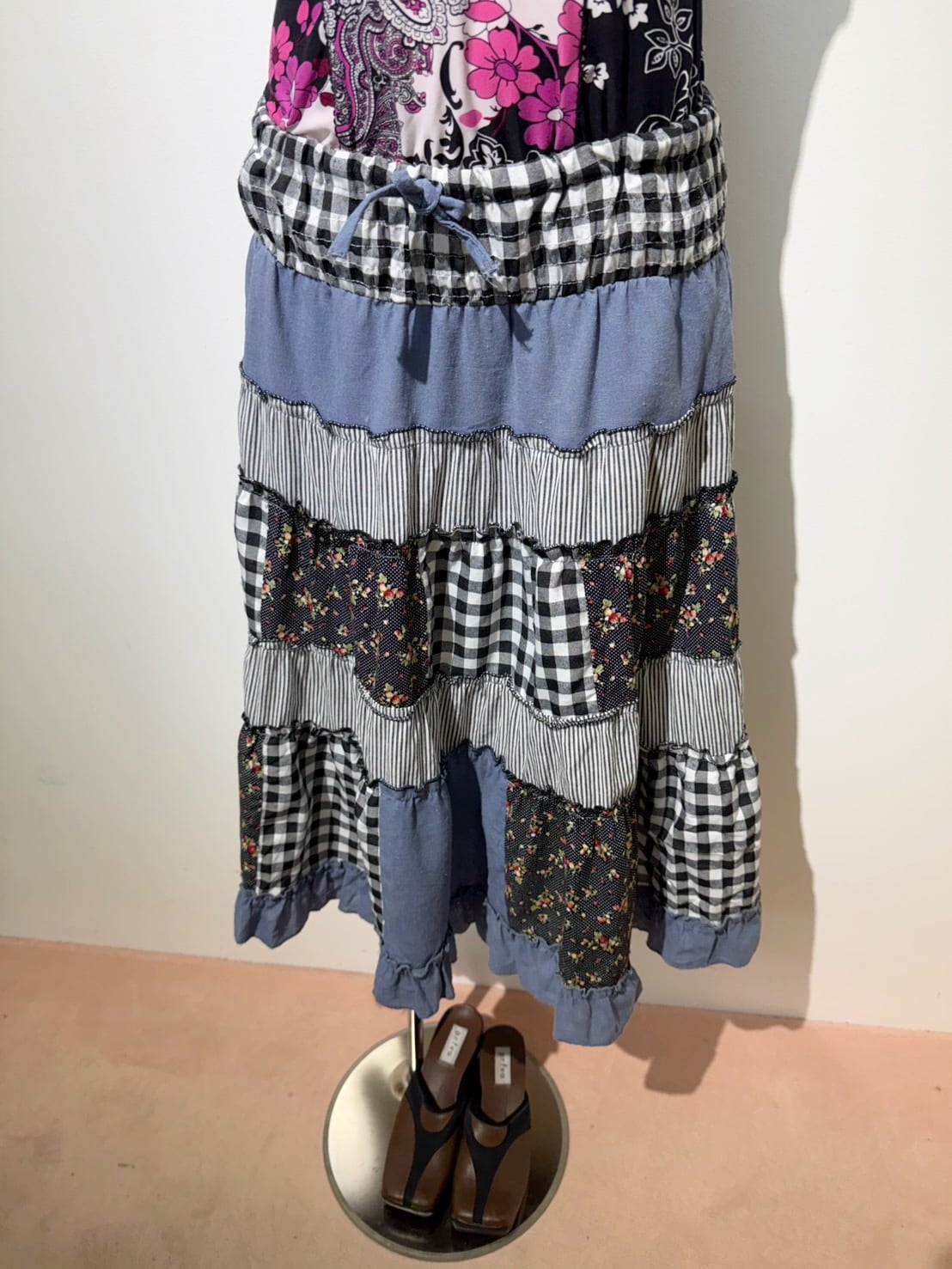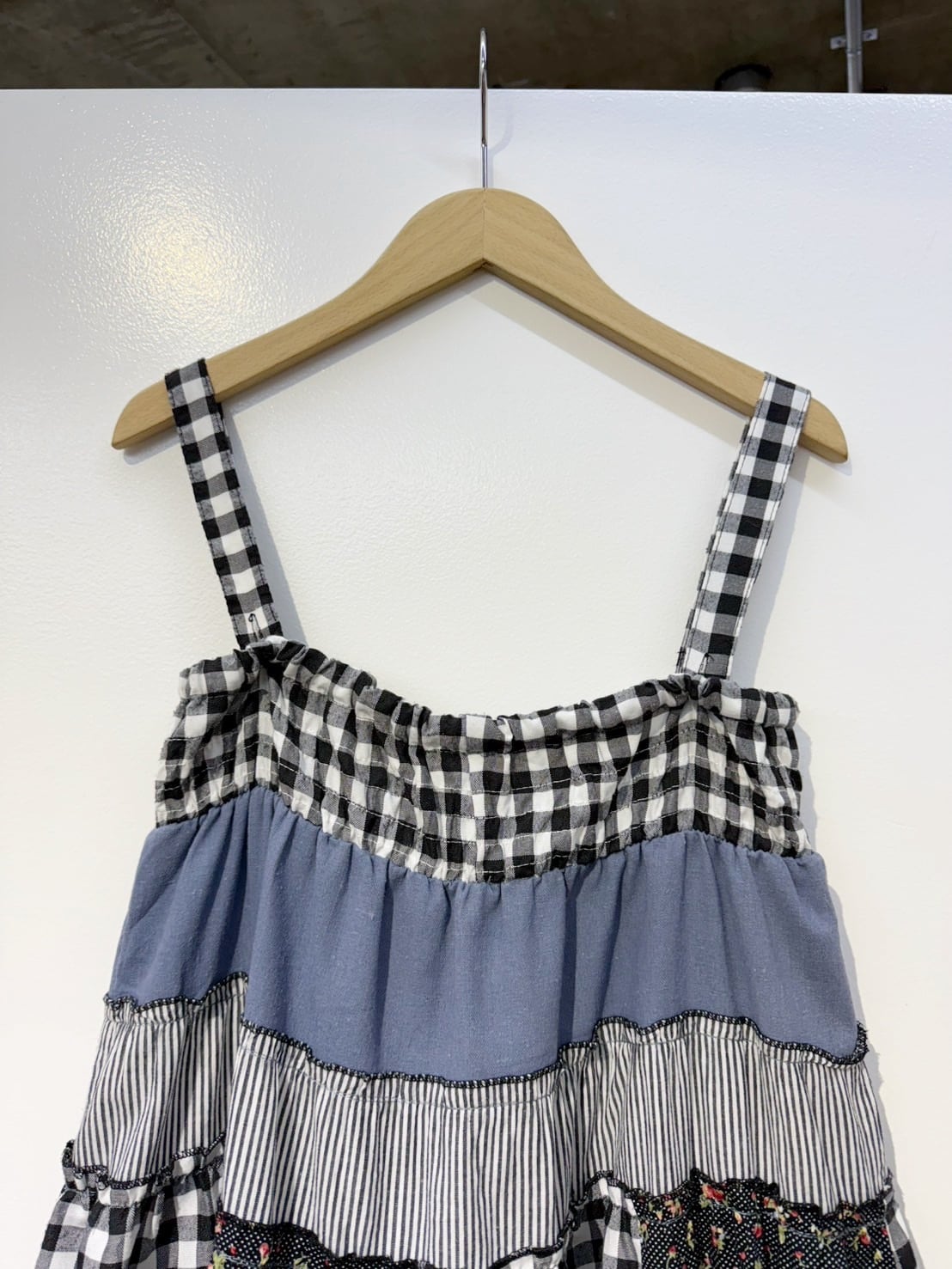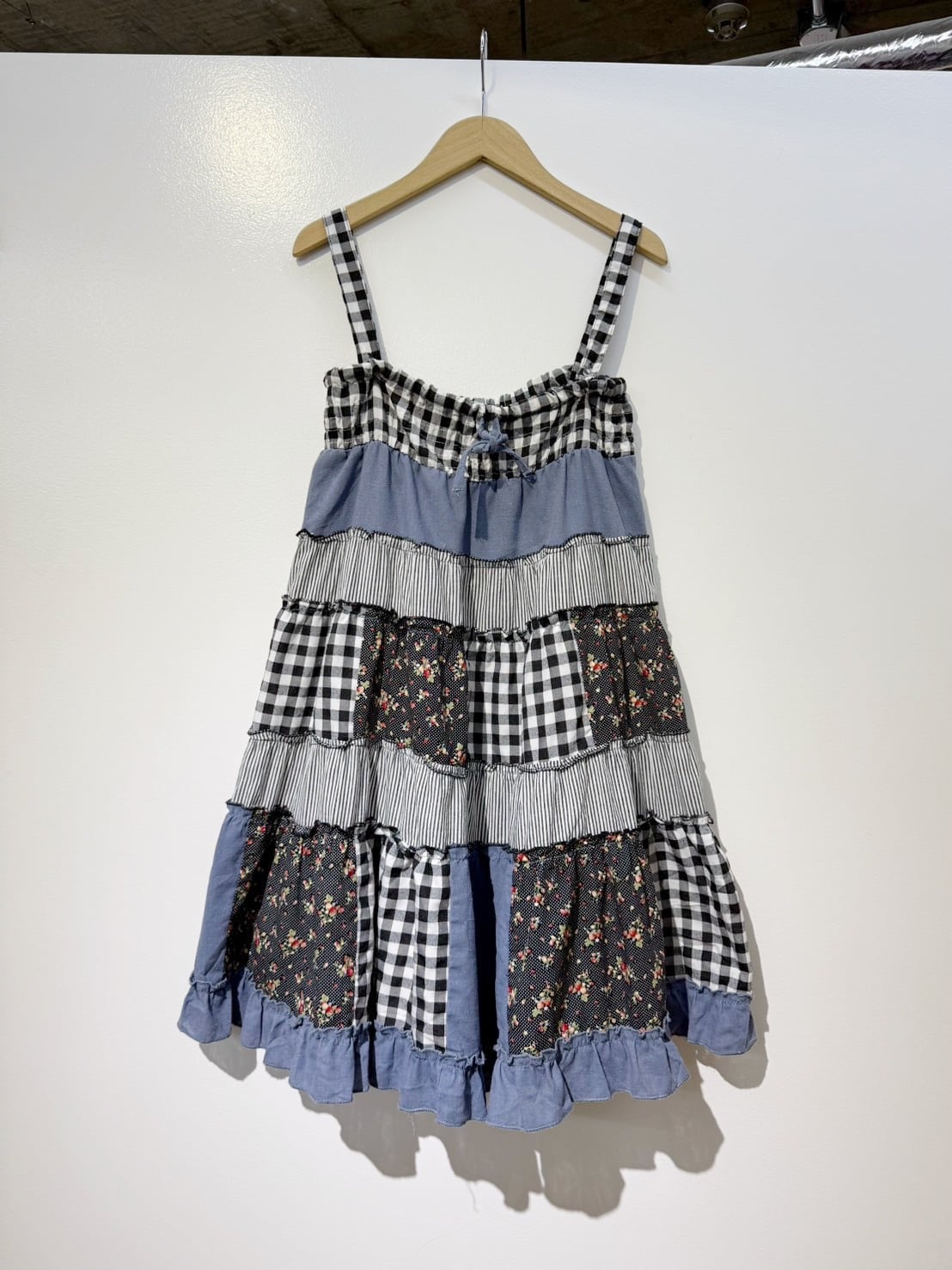 素材: 50%Cotton 50%Polyester ウエスト周りの紐は肩紐としても使用でき、ドレスとして着用できるデザインになっています。 サイズ: ウエスト幅32〜44cm(ゴムで伸縮) ヒップ幅47.5cm 丈72cm 紐16cm