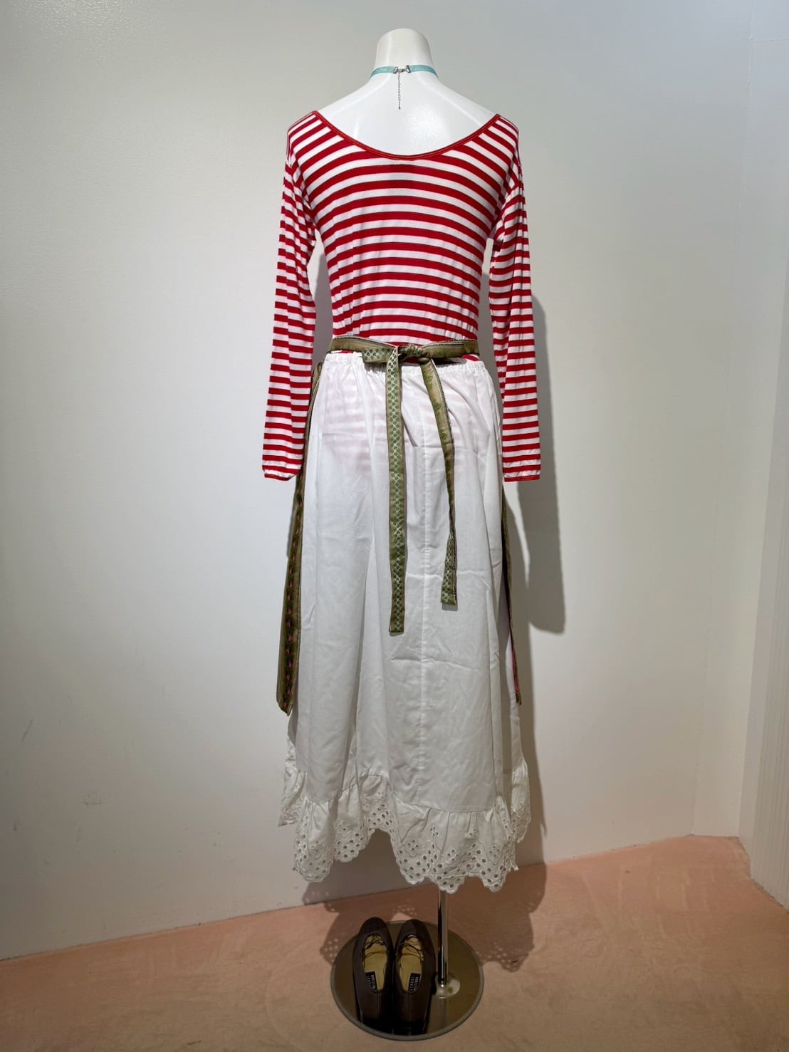 素材: Polyester(表記なし) サイズ: M(表記) ウエスト幅34〜48cm ヒップ幅61.5cm 丈86cm ダメージ: 写真14枚目のような糸のほつれがウエスト部分にあります。