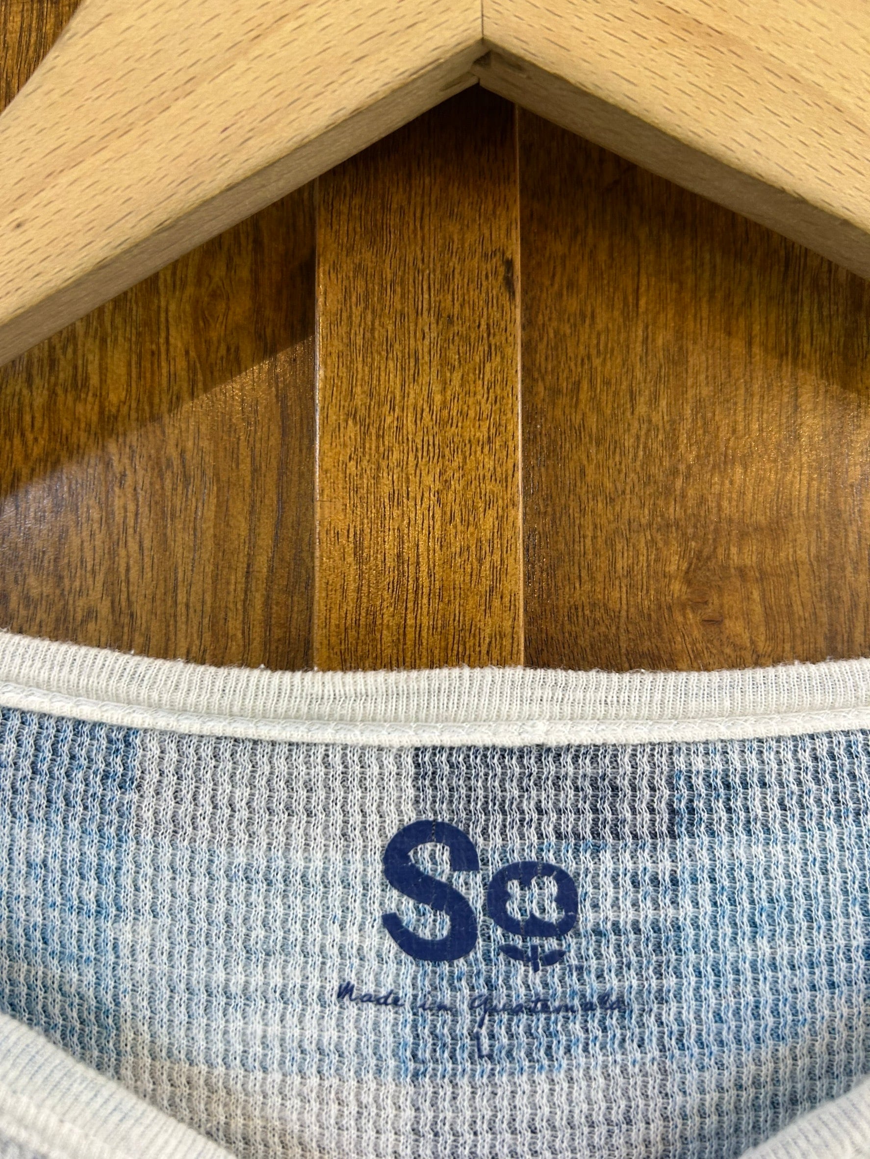 素材: 100%Cotton サイズ: L(表記) 着丈63cm 身幅38cm 裄丈84cm ダメージ: 写真18枚目の生地のダメージ、19.20枚目のように取りきれない細かな毛羽立ちがあります