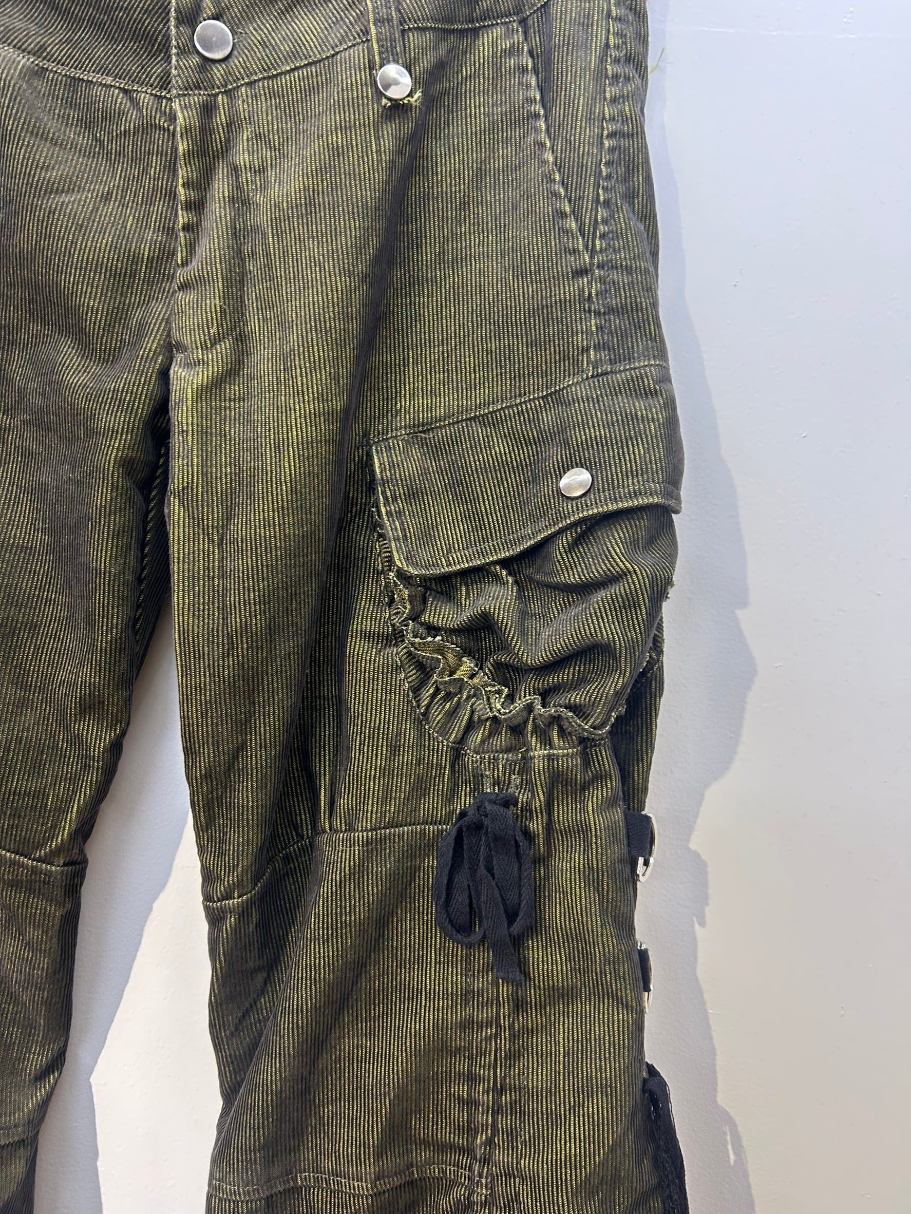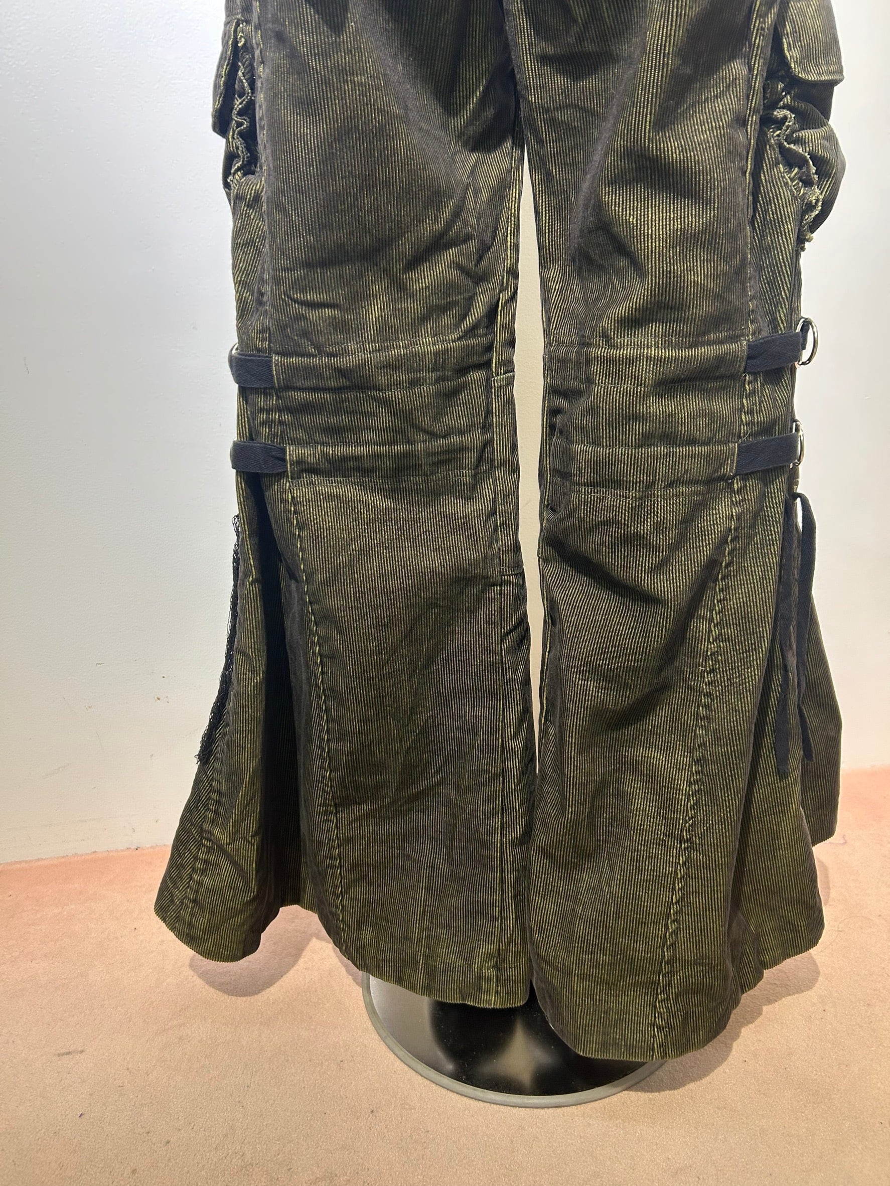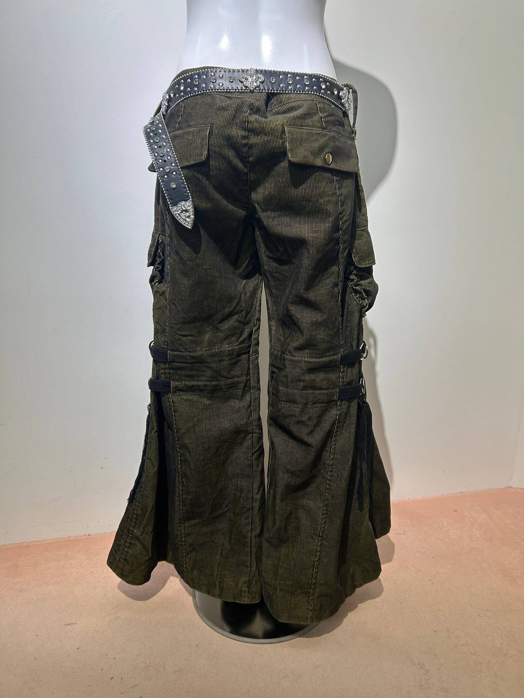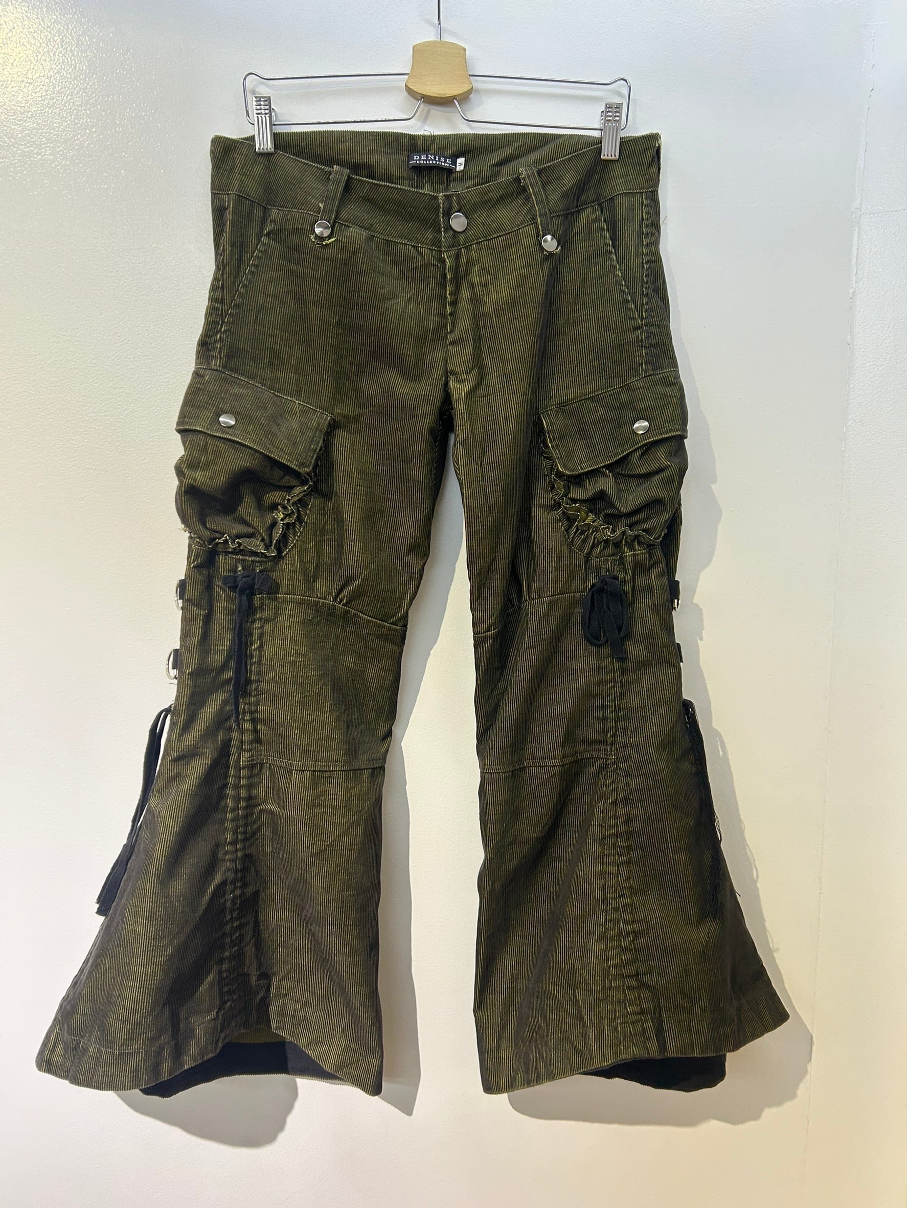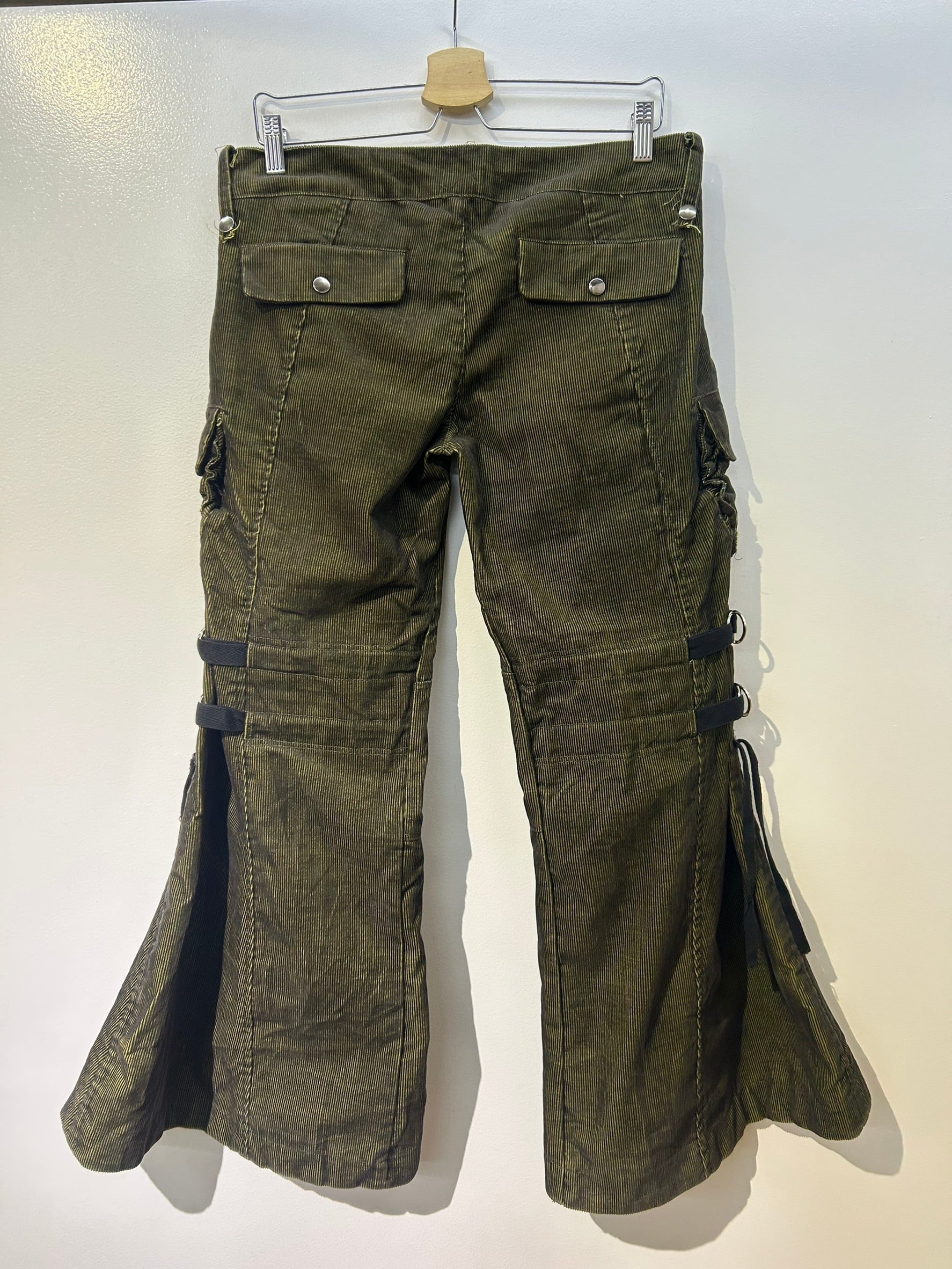 素材: 65%Cotton 35%Polyester サイズ: M(表記)ウエスト幅43cm ヒップ幅50cm 股上20cm 股下72cm ワタリ幅30cm 裾幅44cm ダメージ: 写真18枚目の生地のダメージ、19枚目の紐のダメージがあります